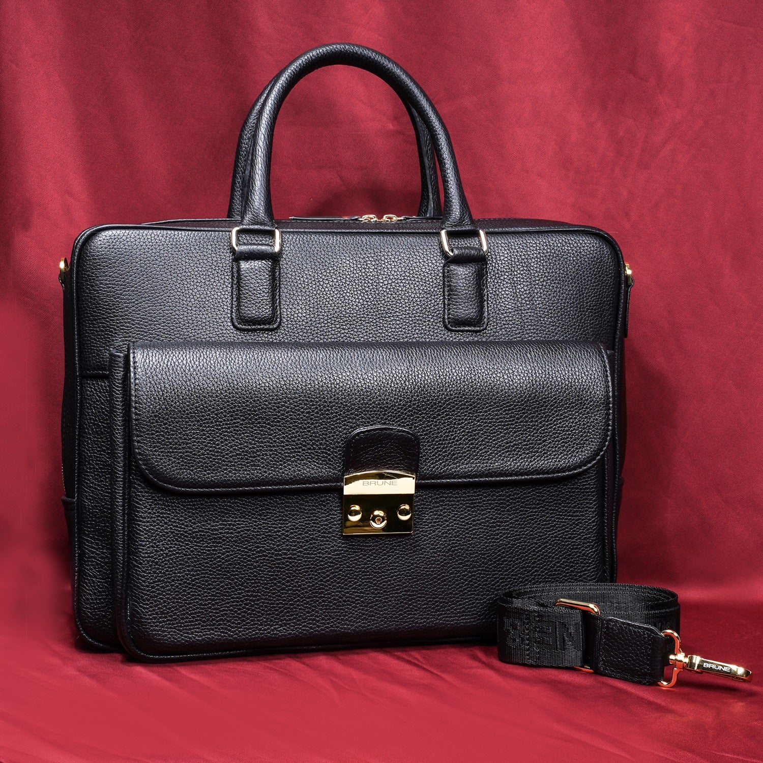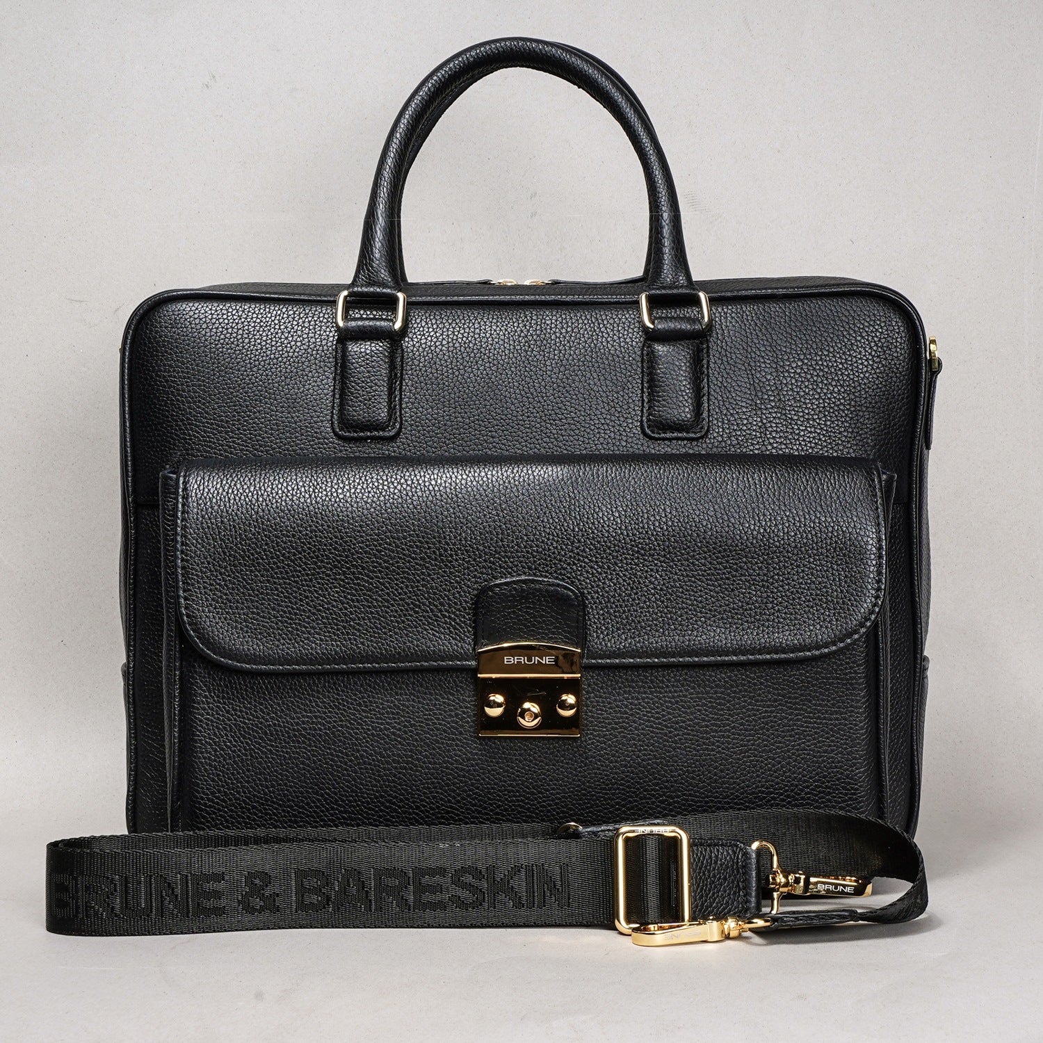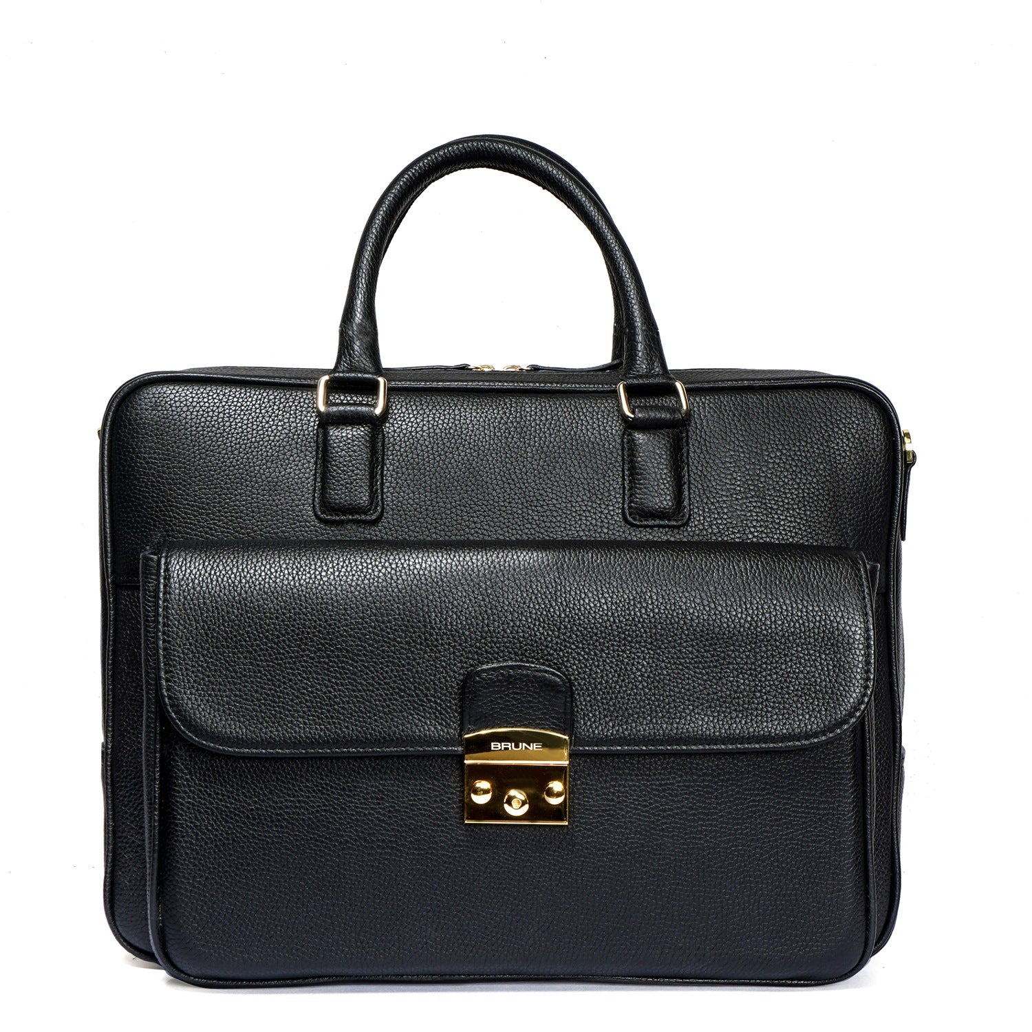 This unisex Laptop/Office Briefcase is a handcrafted masterpiece by Brune & Bareskin. Its black Textured Leather gives it a unique and professional look, making it perfect for business meetings and travel. The durable quality and secured push button flap over front pocket provide both style and function. Stay organized with dedicated compartments for documents, pens, cards, and a padded laptop sleeve. Plus, the detachable shoulder strap adds convenience during travel.