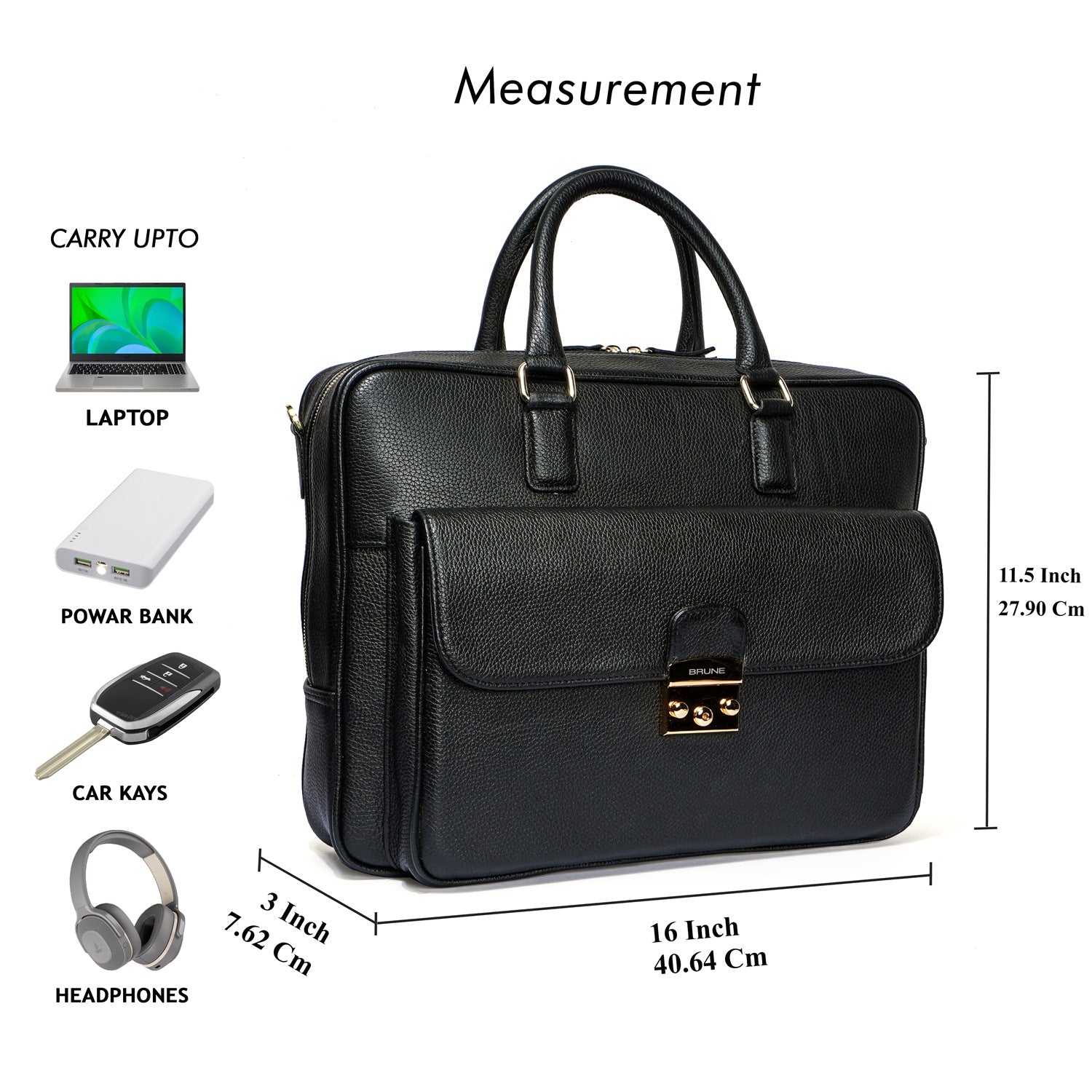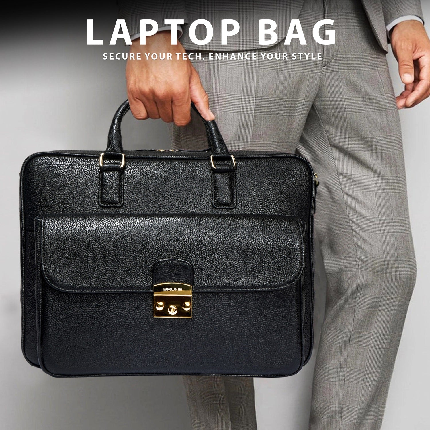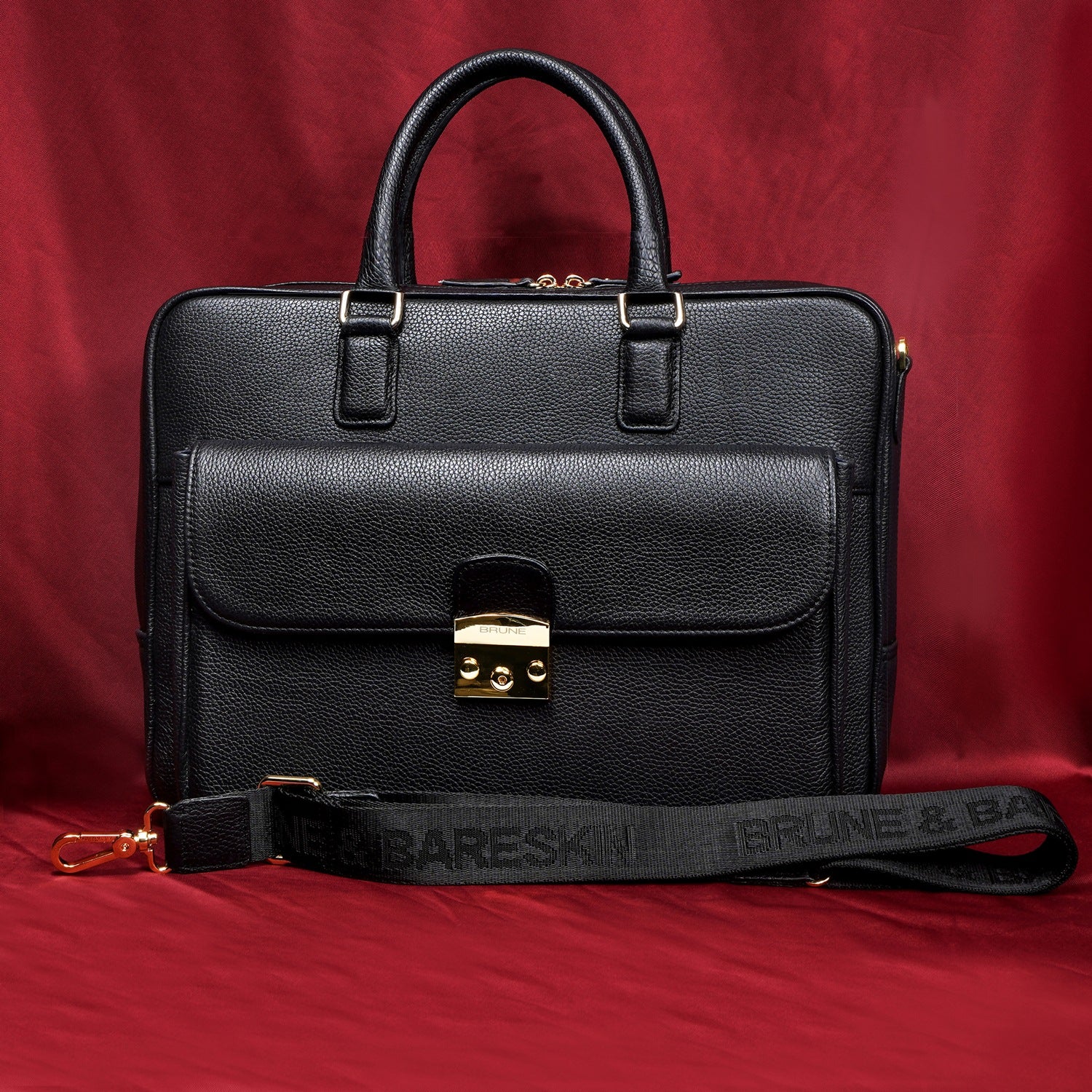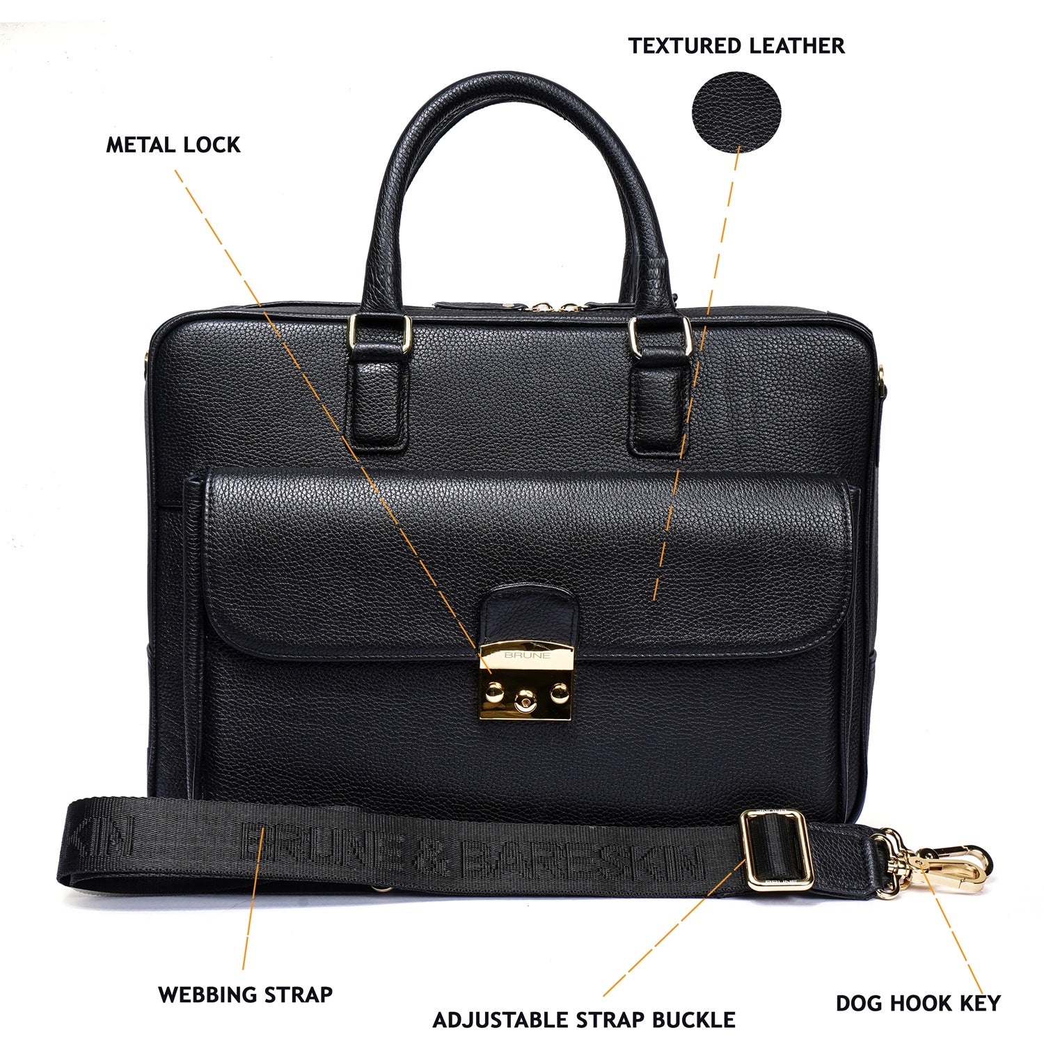 This unisex Laptop/Office Briefcase is a handcrafted masterpiece by Brune & Bareskin. Its black Textured Leather gives it a unique and professional look, making it perfect for business meetings and travel. The durable quality and secured push button flap over front pocket provide both style and function. Stay organized with dedicated compartments for documents, pens, cards, and a padded laptop sleeve. Plus, the detachable shoulder strap adds convenience during travel.