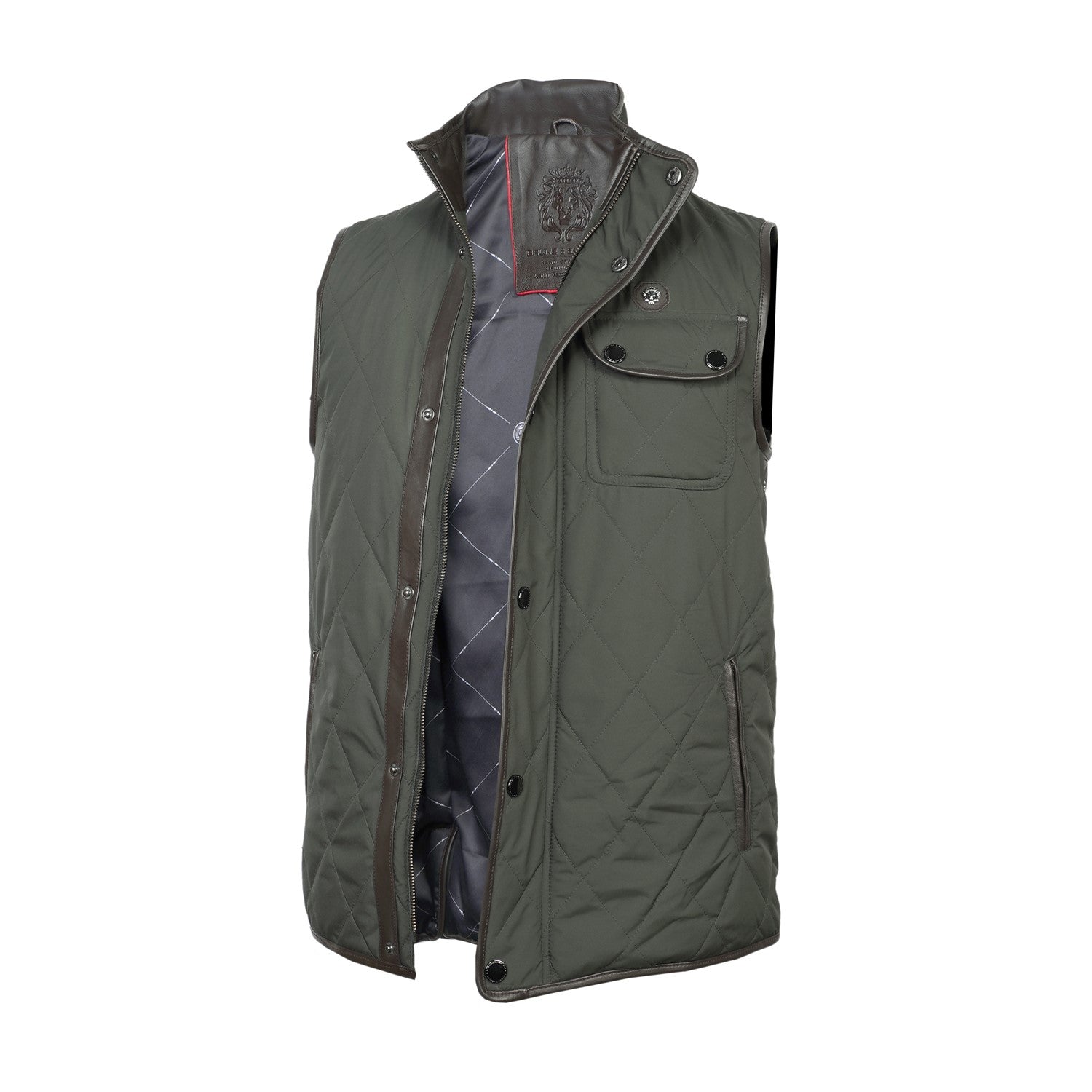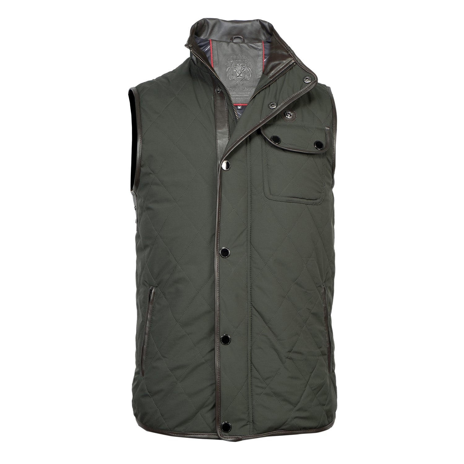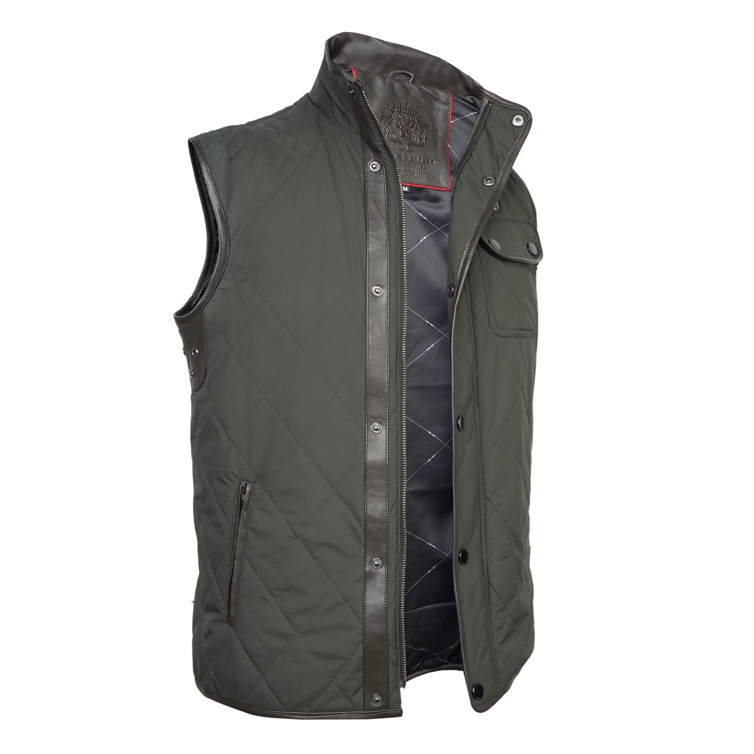 Look sophisticated and exclusive with this quilted, luxurious puffer vest. This men's puffer vest from Brune & Bareskin is perfect for any outdoor adventure. With its dark green color, diamond stitched pattern, and contrasting dark brown leather trims, this vest looks great, plus it's water-resistant and warm. It also features a stand-up style collar with front buttoned over hidden zipper closure, two front waist pocket with an additional side entry pocket. Conquer every challenge with style.