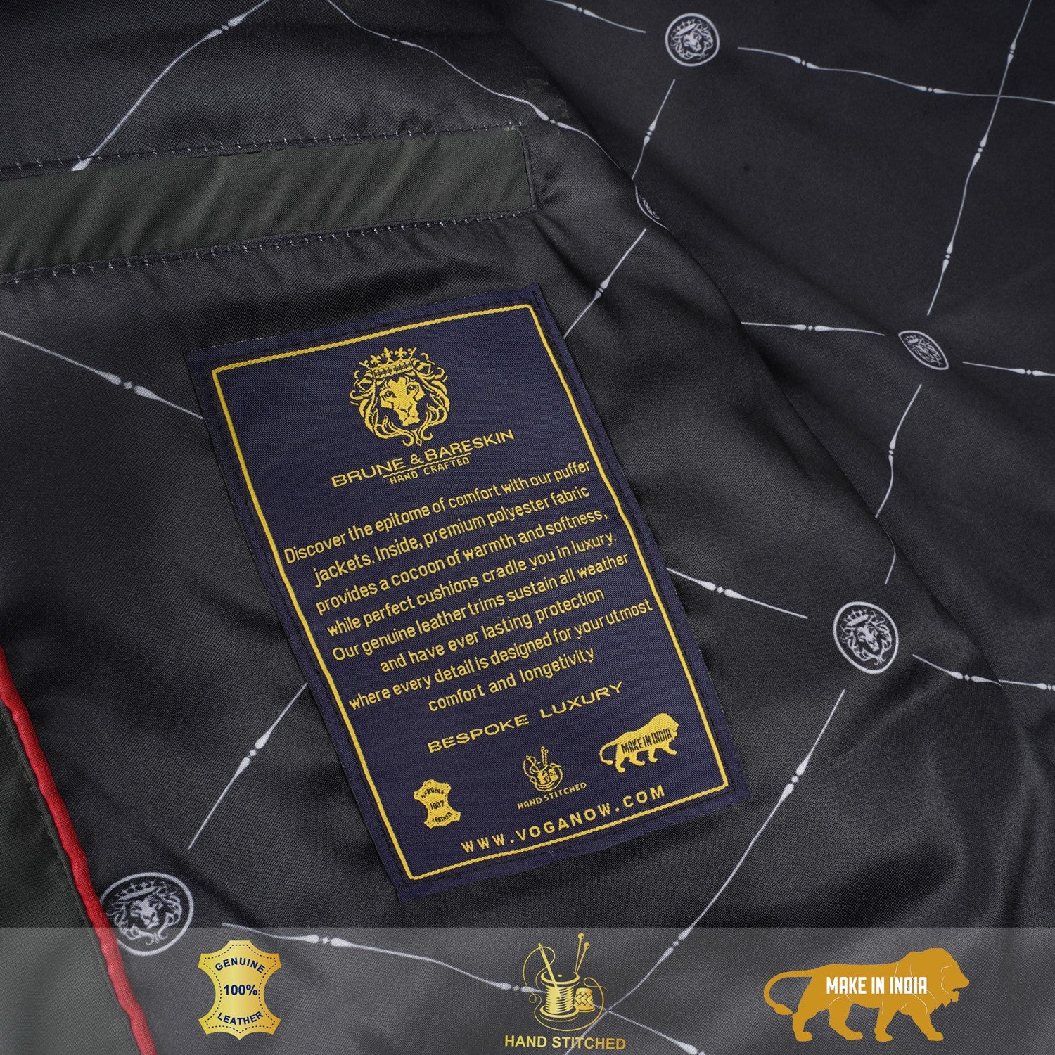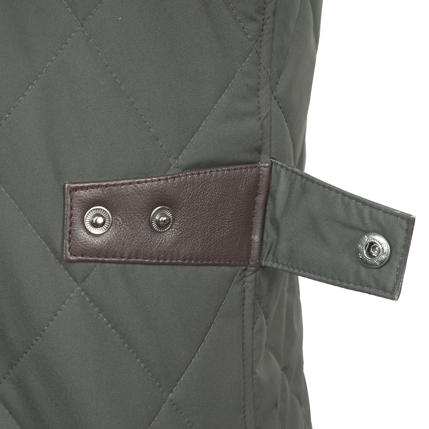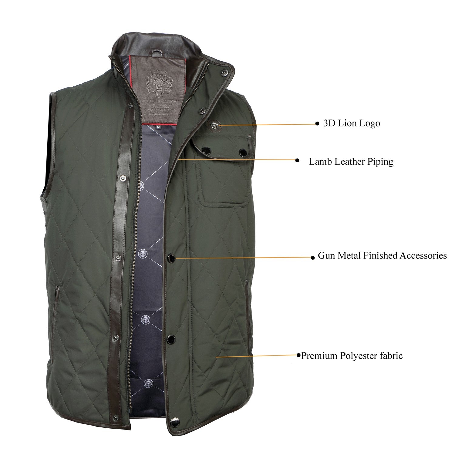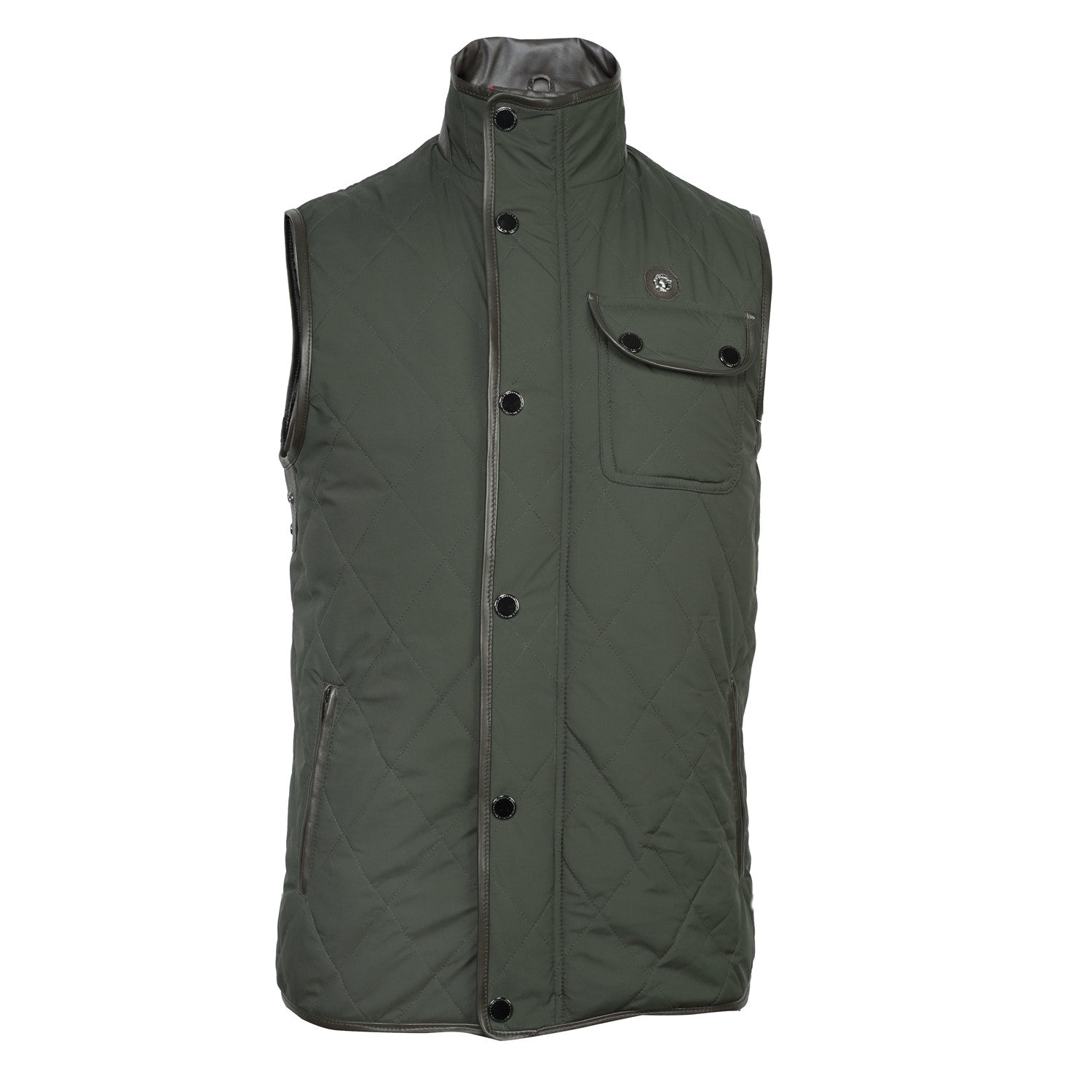 Look sophisticated and exclusive with this quilted, luxurious puffer vest. This men's puffer vest from Brune & Bareskin is perfect for any outdoor adventure. With its dark green color, diamond stitched pattern, and contrasting dark brown leather trims, this vest looks great, plus it's water-resistant and warm. It also features a stand-up style collar with front buttoned over hidden zipper closure, two front waist pocket with an additional side entry pocket. Conquer every challenge with style.