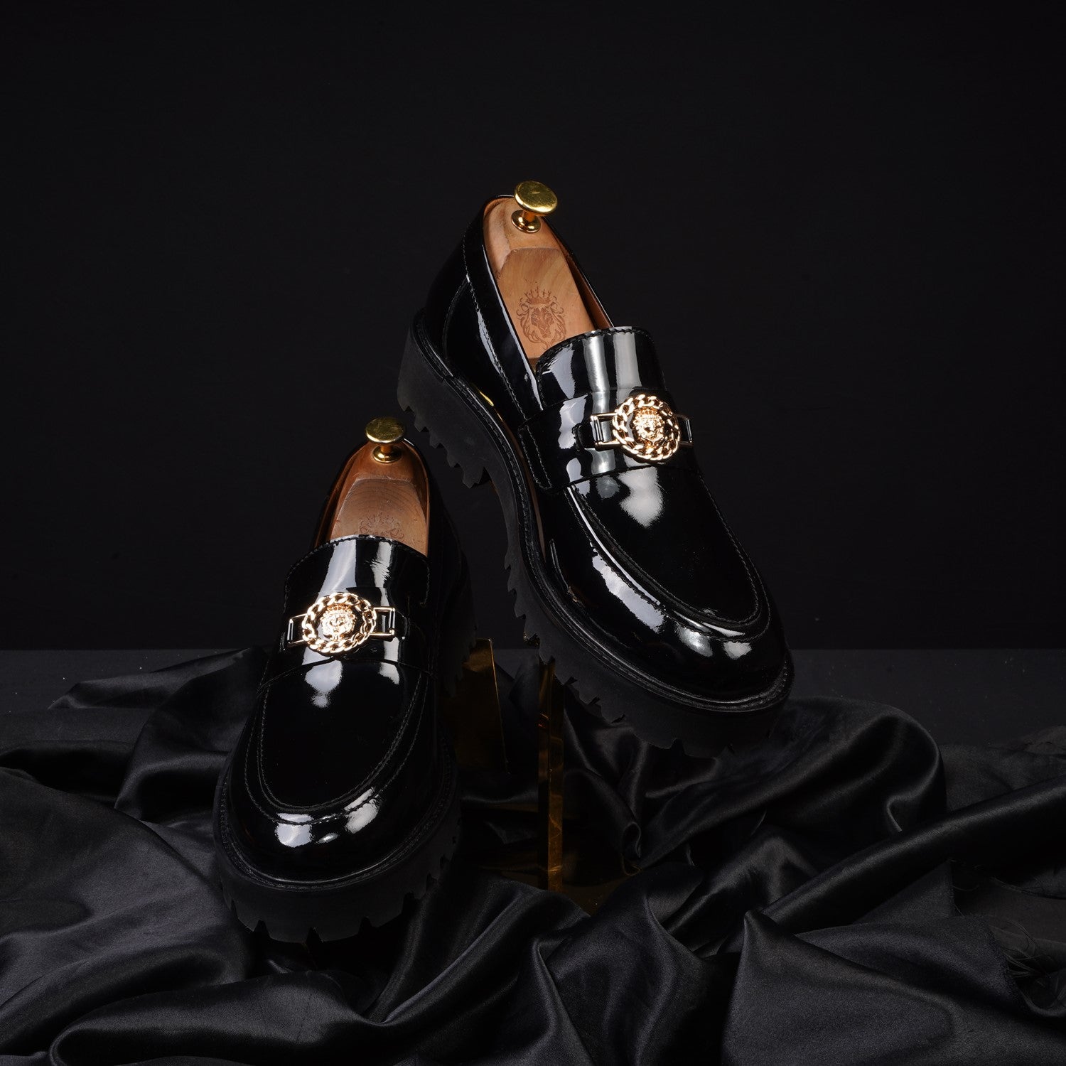 Step up your style game with these chunky sole loafers in sleek patent leather, designed for both edge and elegance. Featuring a bold silhouette and finished with a striking metallic golden lion logo detail, these loafers perfectly blend luxury with a modern twist. Ideal for making a statement, whether you're dressing up or adding a high-fashion touch to your casual look.
