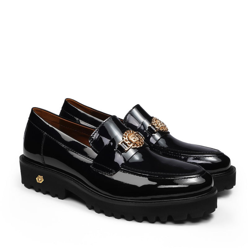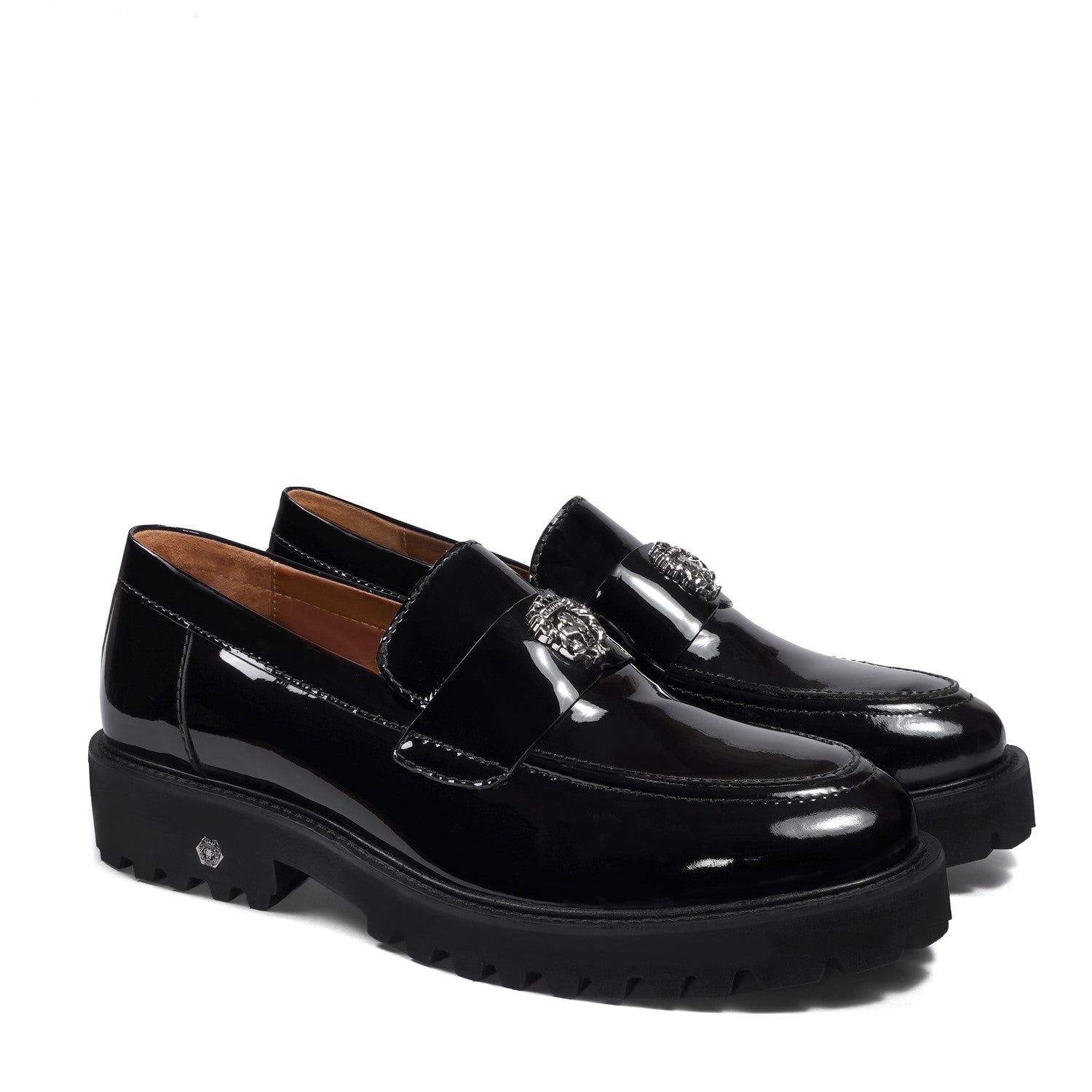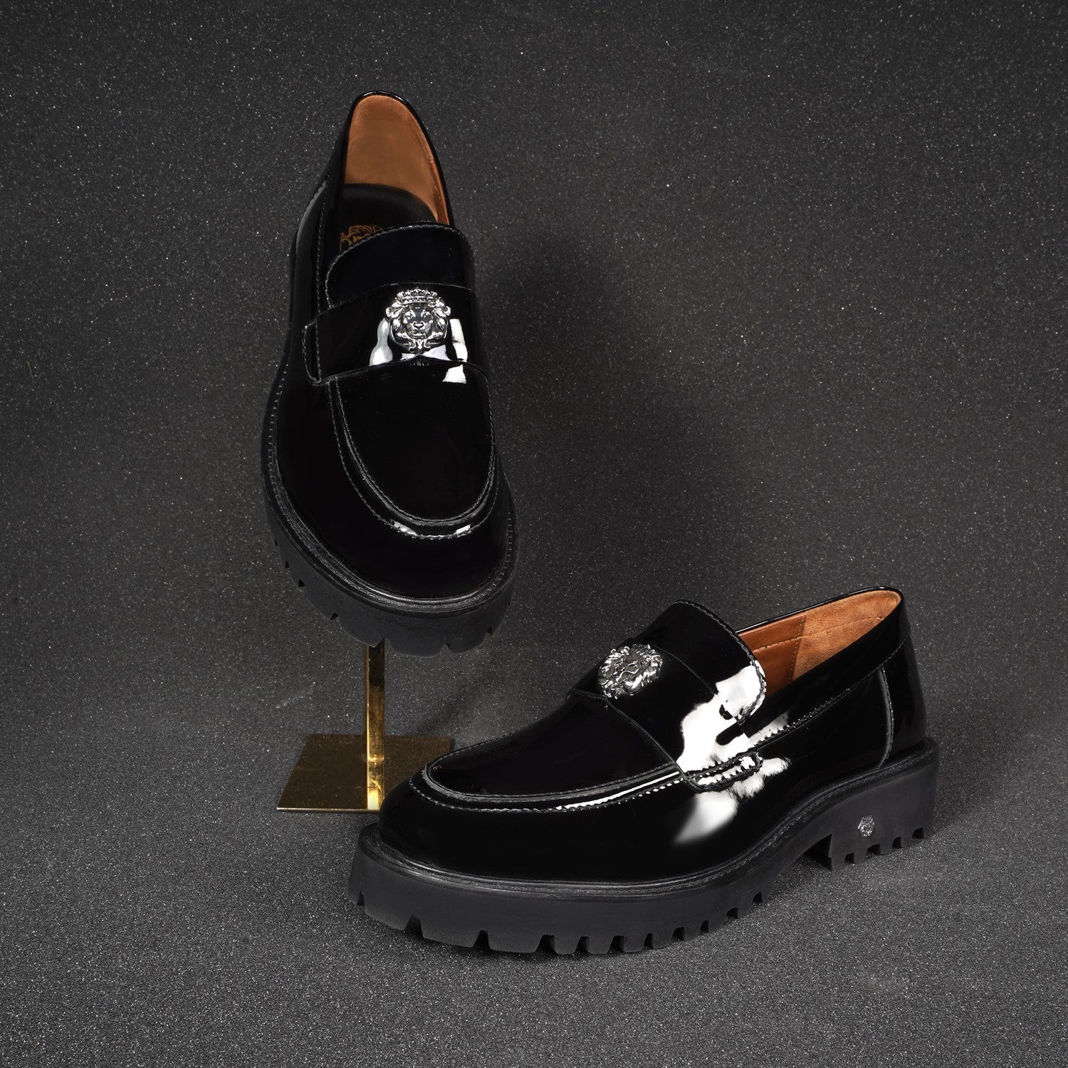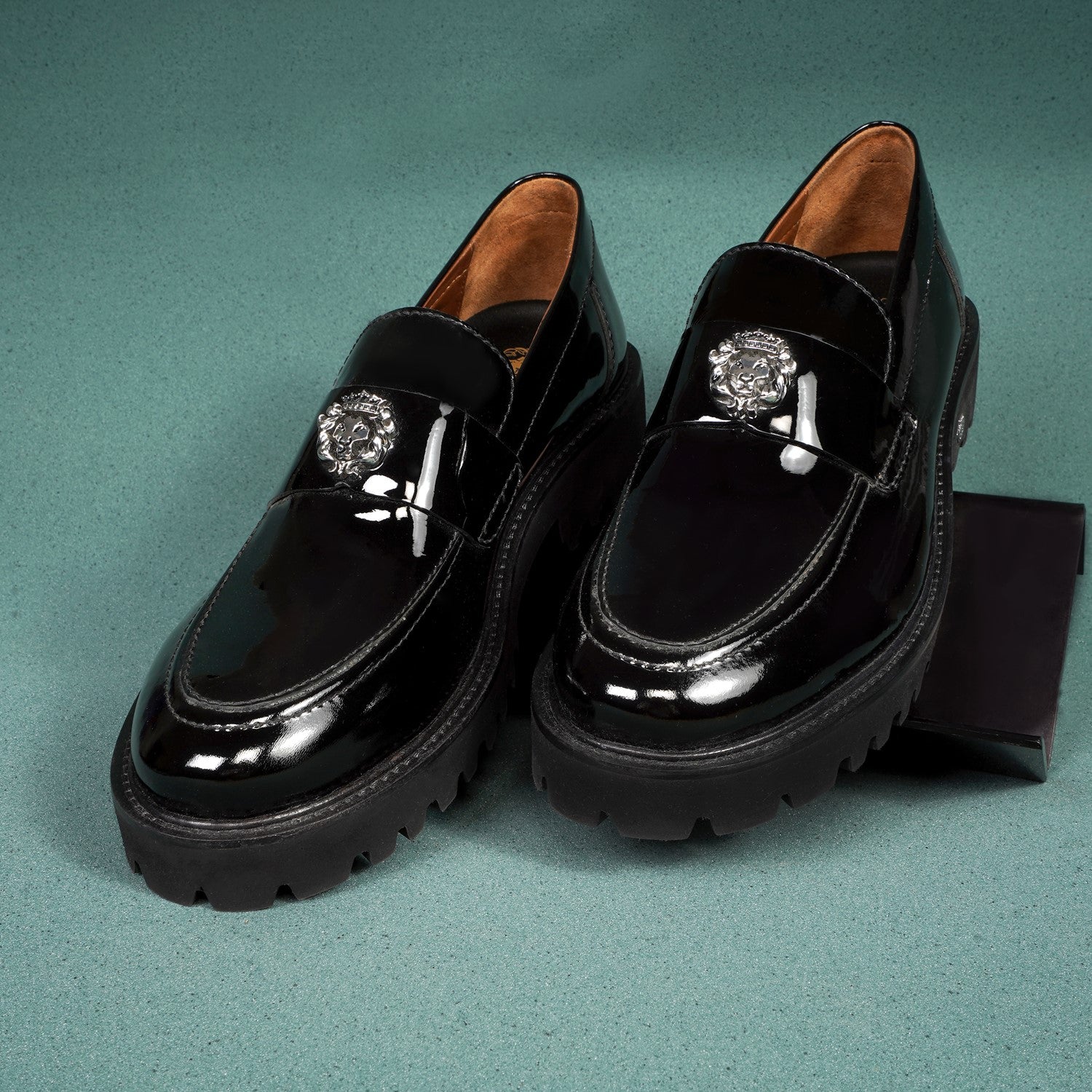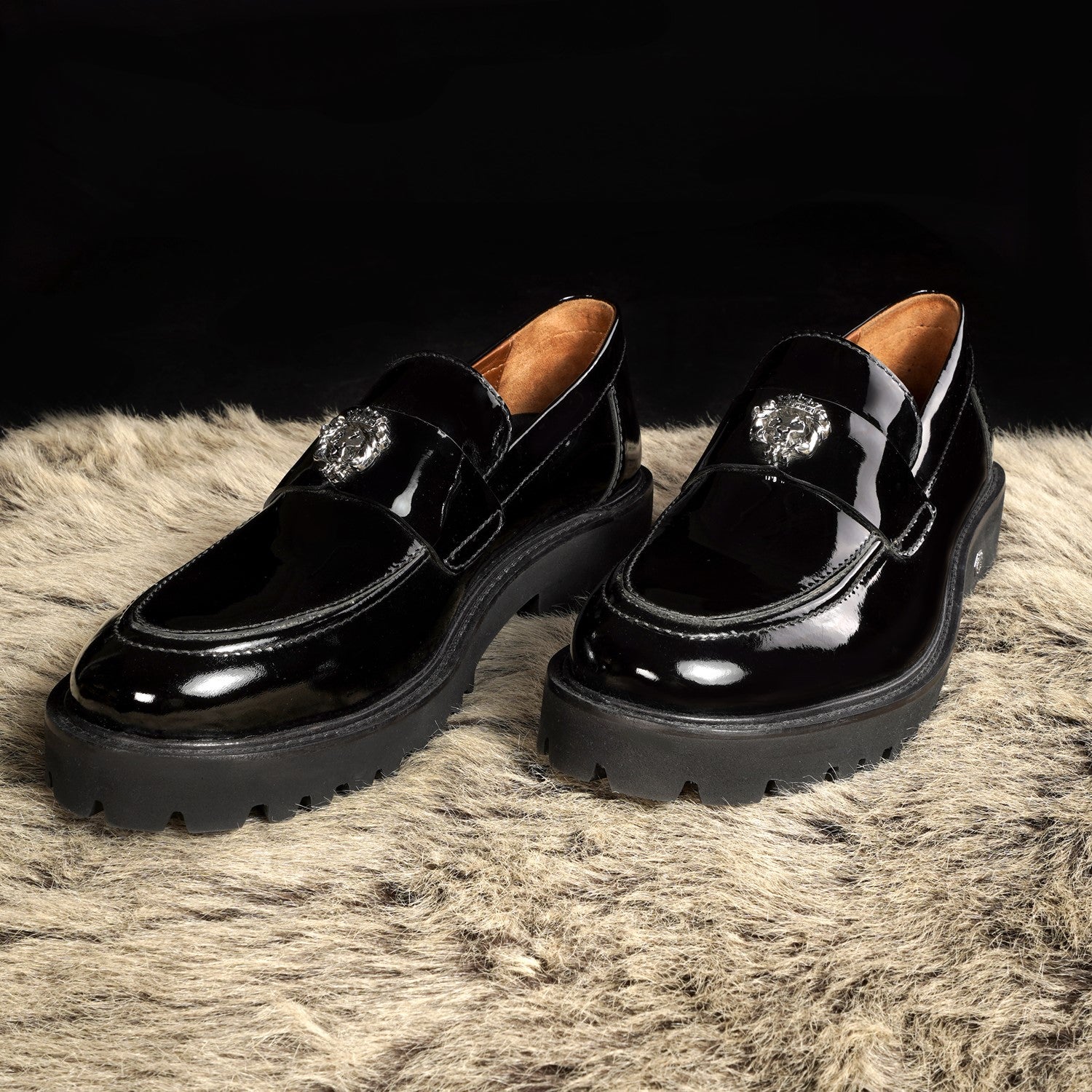 Patent Leather Chunky Sole Black Loafers with Silver Lion Logo