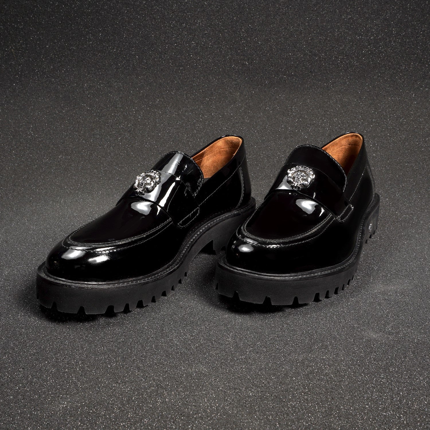 Step up your style game with these chunky sole loafers in sleek patent leather, designed for both edge and elegance. Featuring a bold silhouette and finished with a striking metallic silver lion logo detail, these loafers perfectly blend luxury with a modern twist. Ideal for making a statement, whether you're dressing up or adding a high-fashion touch to your casual look.