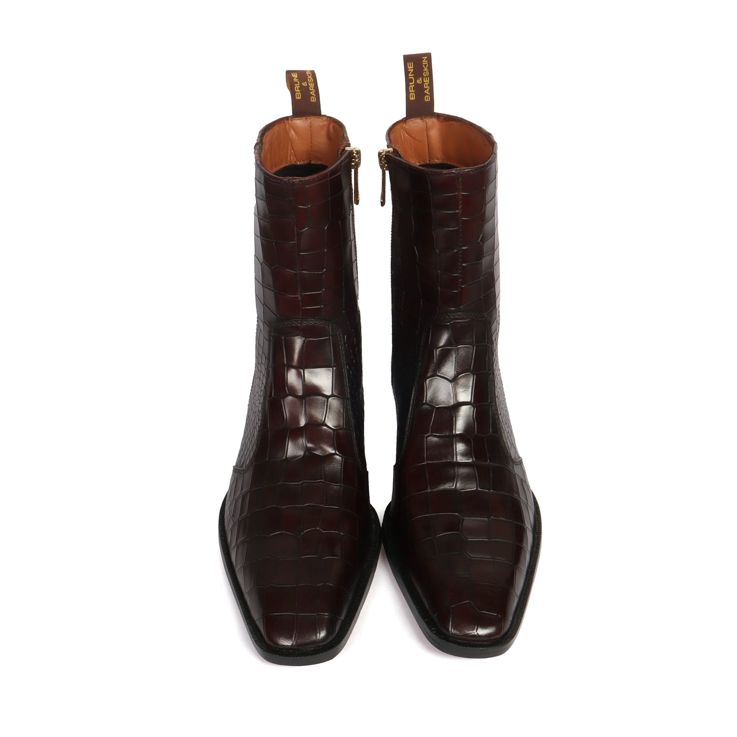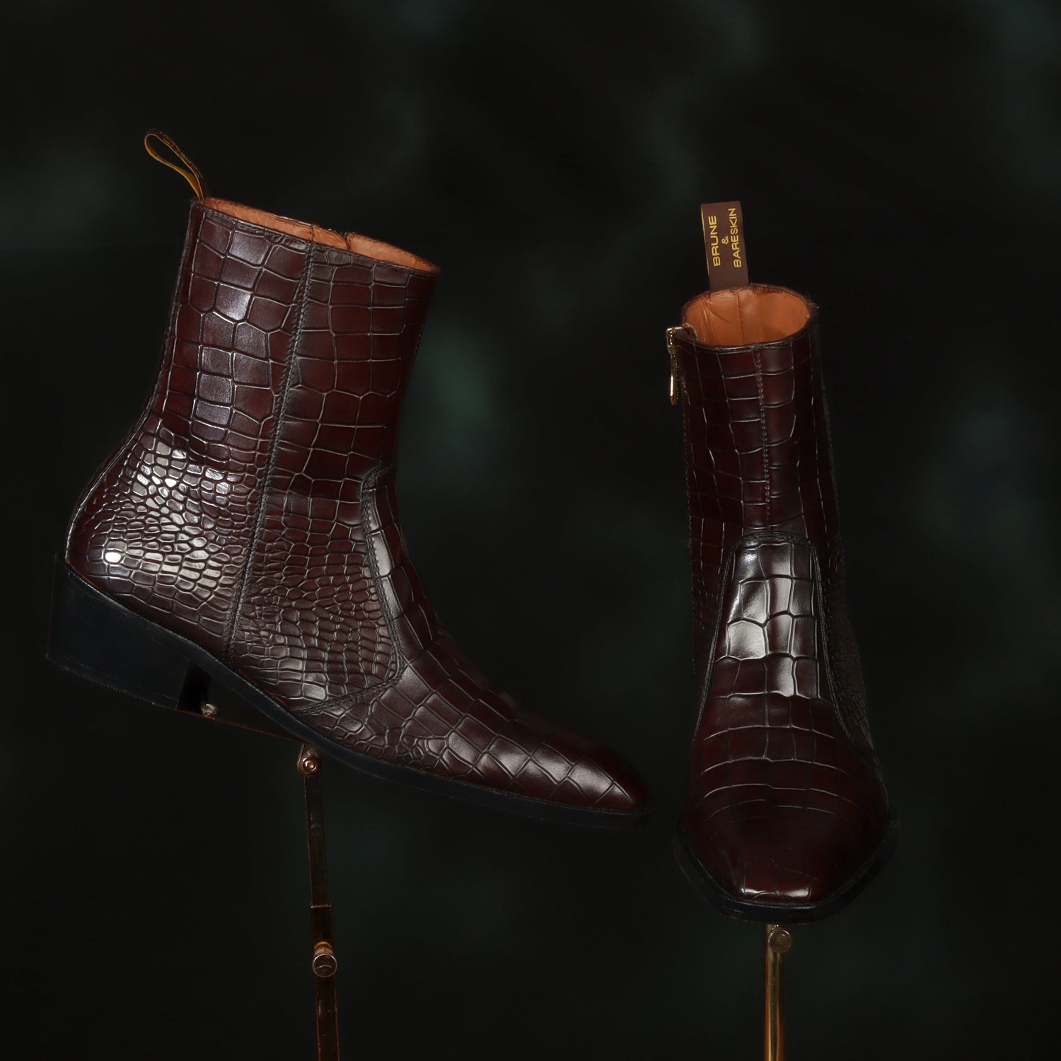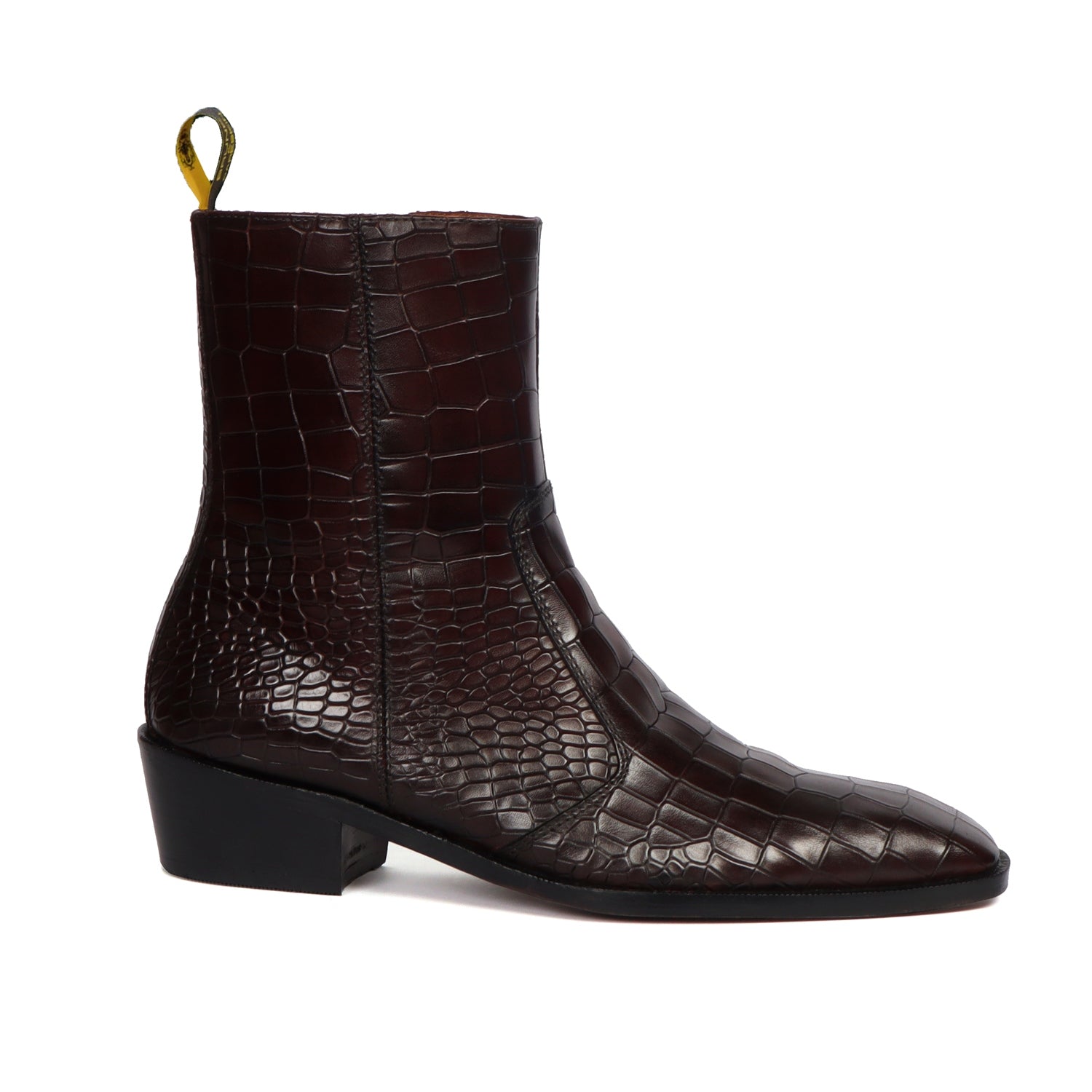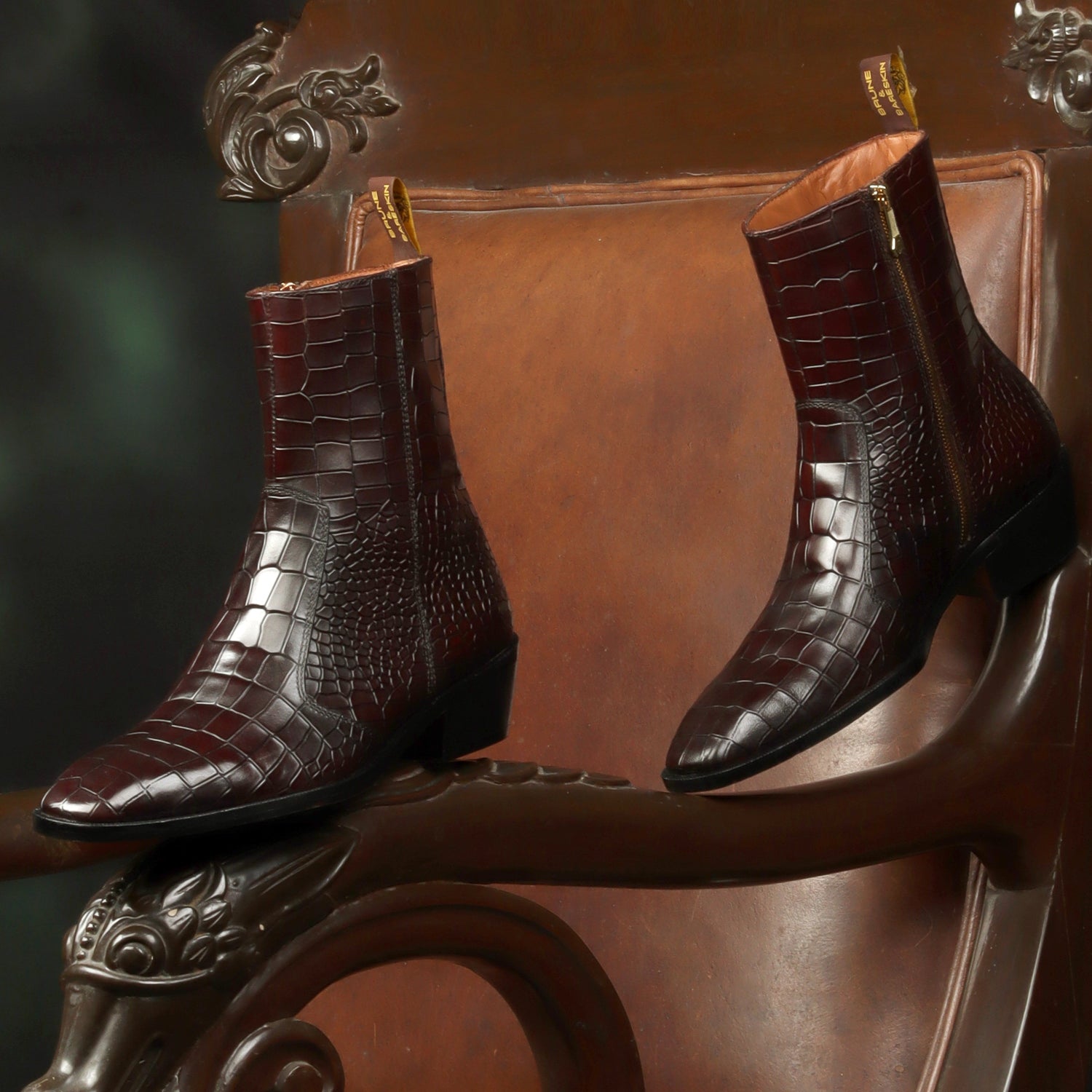 The stitched detailing on the quarter looks elegant. The greater detailing of Inner side zipper closure at the ankles lend a classy look to these deep cut leather formal shoes. These dark brown deep cut croco textured leather ankle-length shoes are fitted to emphasize the size and shape of your feet to perfection. The leather sole and Cuban heel(40mm) adds the extra elegance to it.
