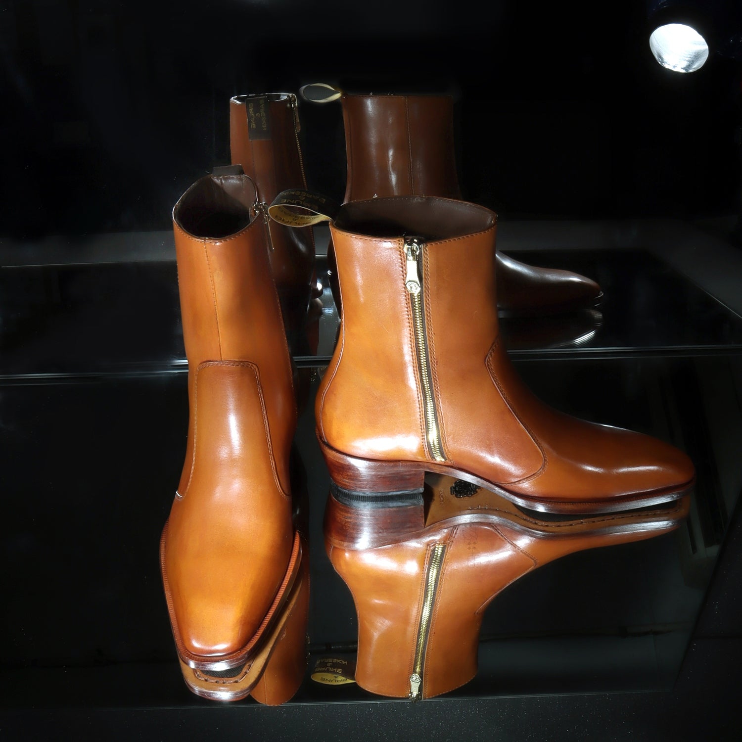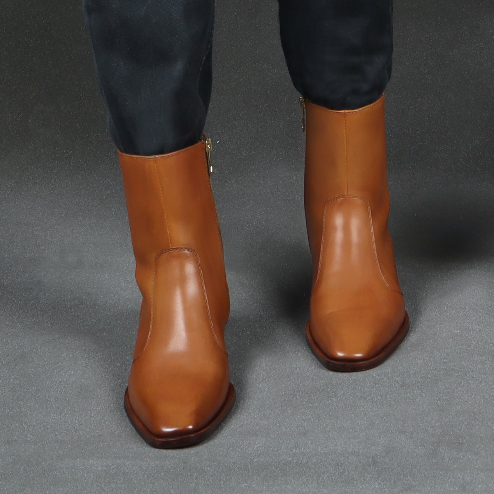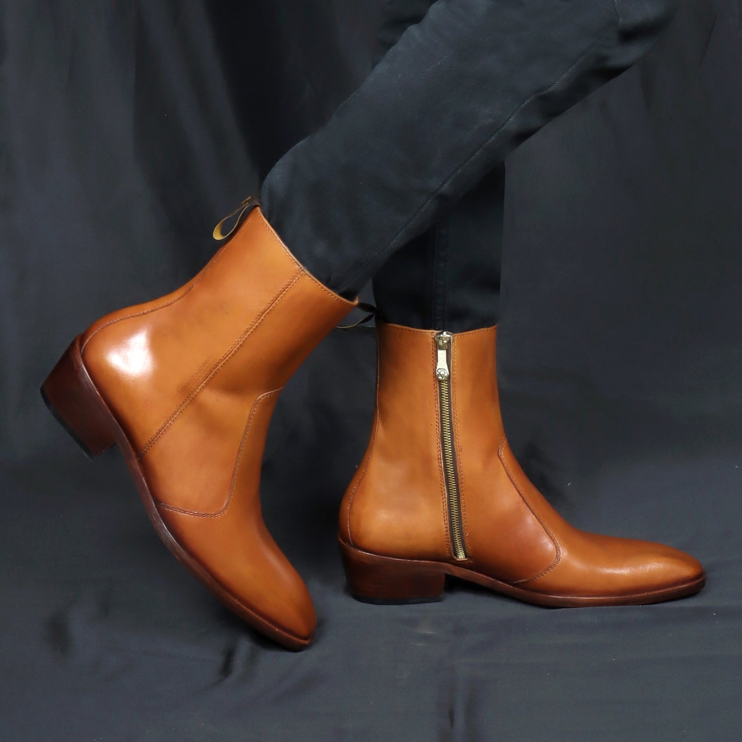 We craft these high ankle Tan genuine leather boots to give you an elite look. The stitched detailing on the quarter looks classy. The golden zip closure provides an extra ease to wear these exquisite boots. The pure leather sole & Cuban heel offers great comfort. Cuban Heel(40MM) Essentially, it is a straight, medium-high heel with a slightly curved back. This is one of a kind Chelsea boot with a perfect Cuban heel. You can customize this chic boots in any of your favorite color according to your attire with our bespoke services. They are easy to team with formal trousers as they blend well with the classic fabrics as well as the modern blended synthetic fabric pants, slacks and trousers.