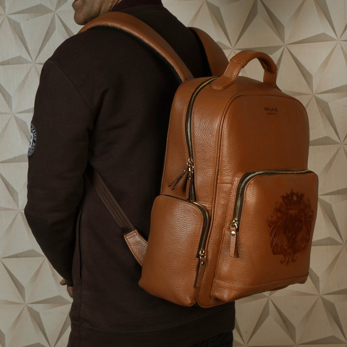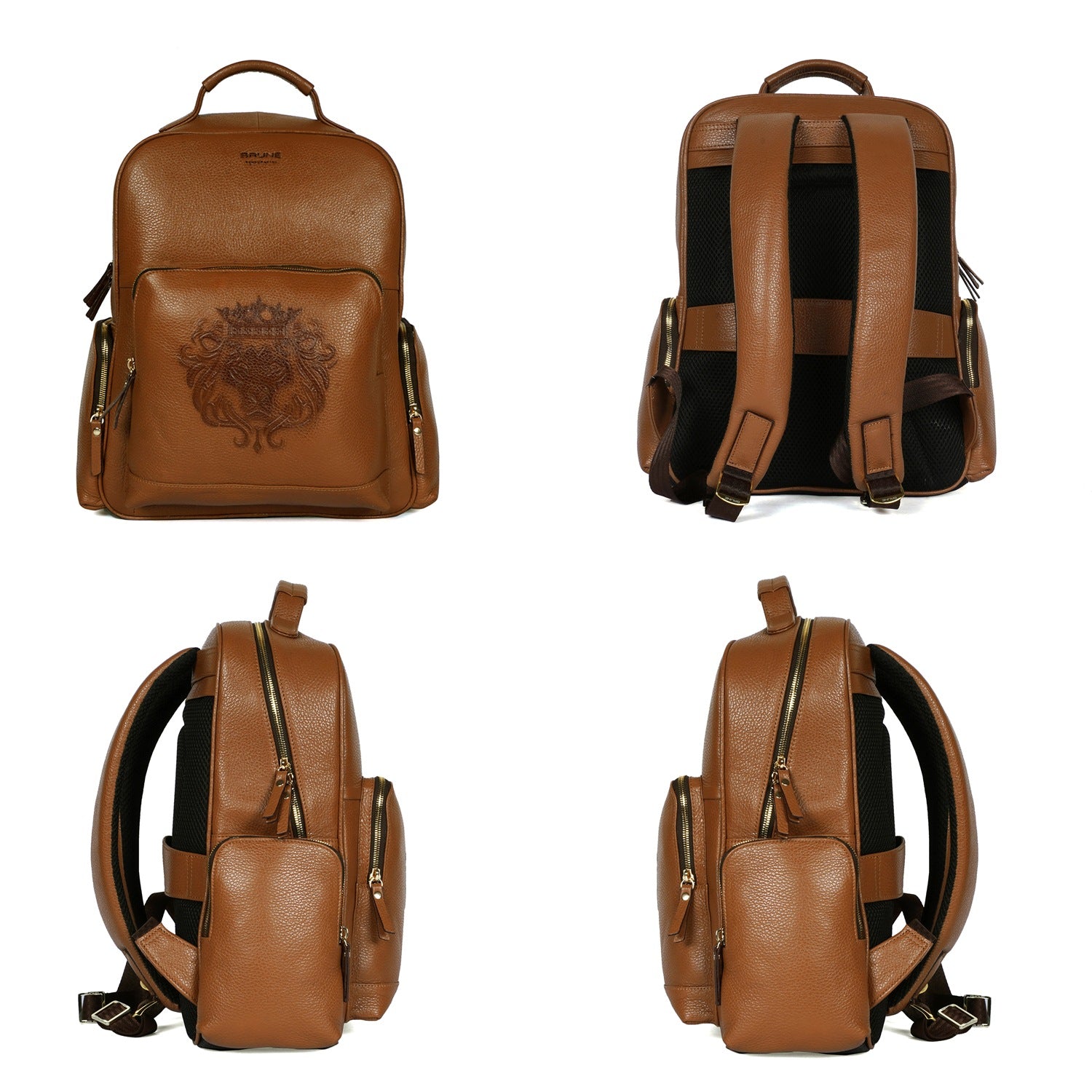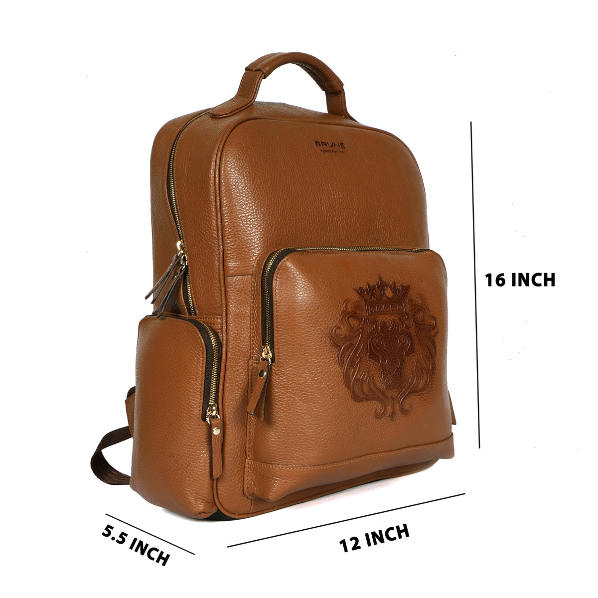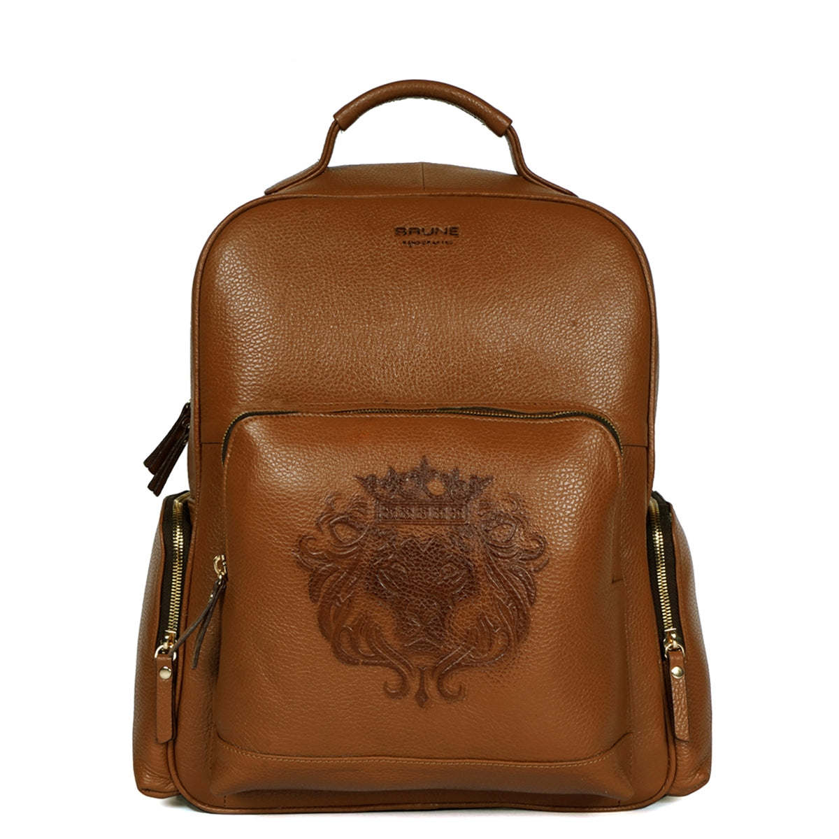 | Brune & Bareskin leather backpack bag get better with age like friends, like relationship, like you, like us. It is handmade tan backpack bag which is crafted with precisely selected premium exclusive textured leather. This textured leather backpack is a perfect buy for the folks who want the style game on point. The signature embossed lion looks awesome on front pocket. The compact size and adjustable textured shoulder straps make it very easy to carry. The padded back panel provides a very comfortable support. It has two golden zip pockets on both to carry essentials. It is a perfect bag for girls to use while small travel trips, office, school, college, university. 100% Genuine Leather provides the trust of quality. |