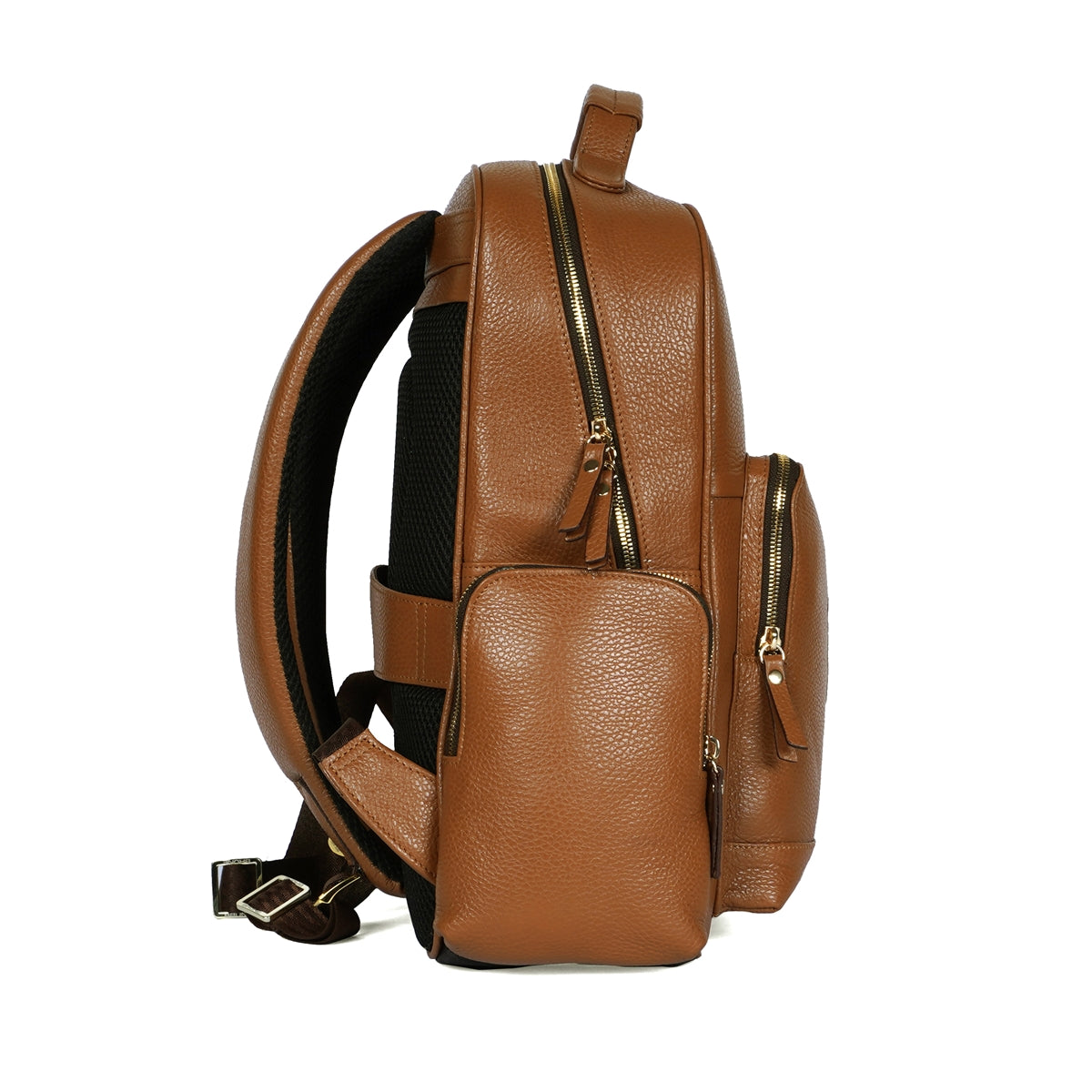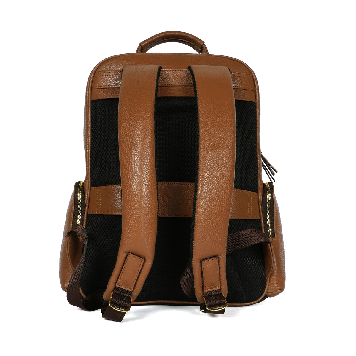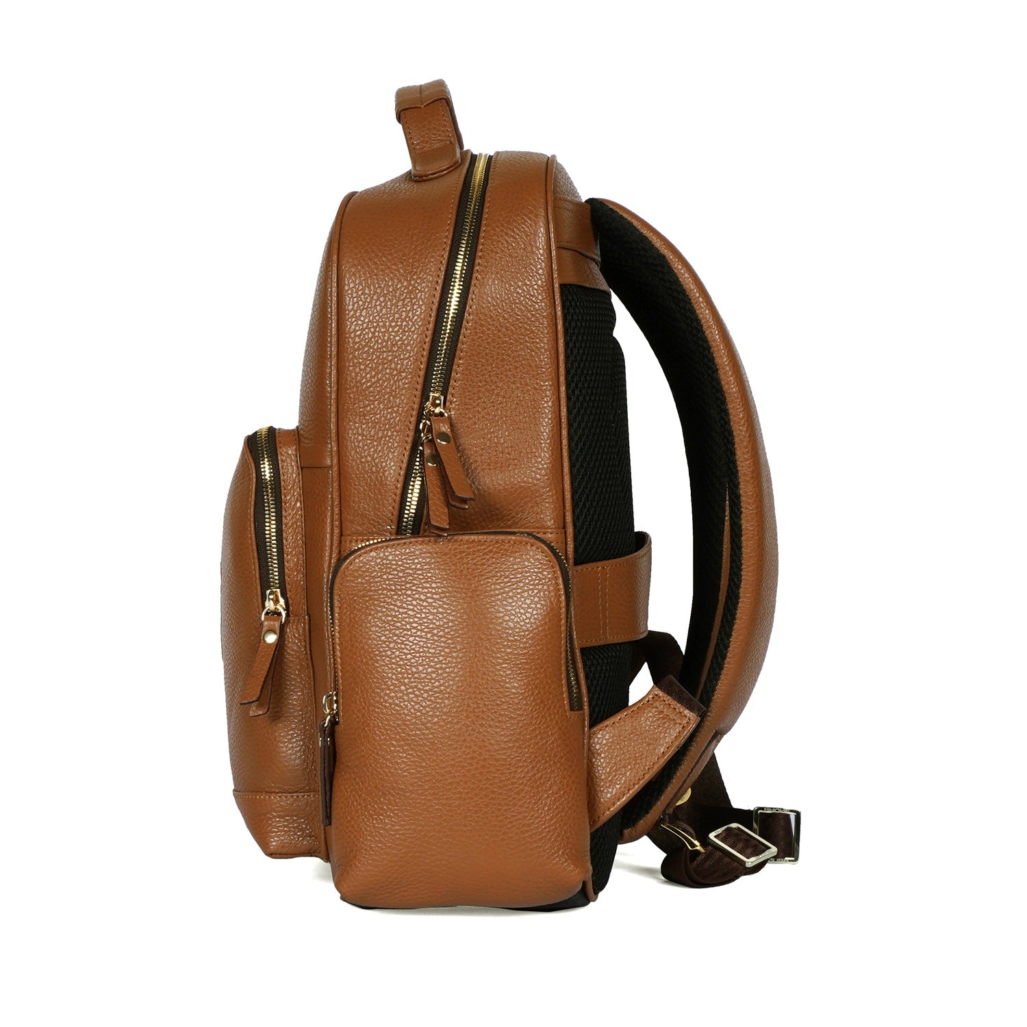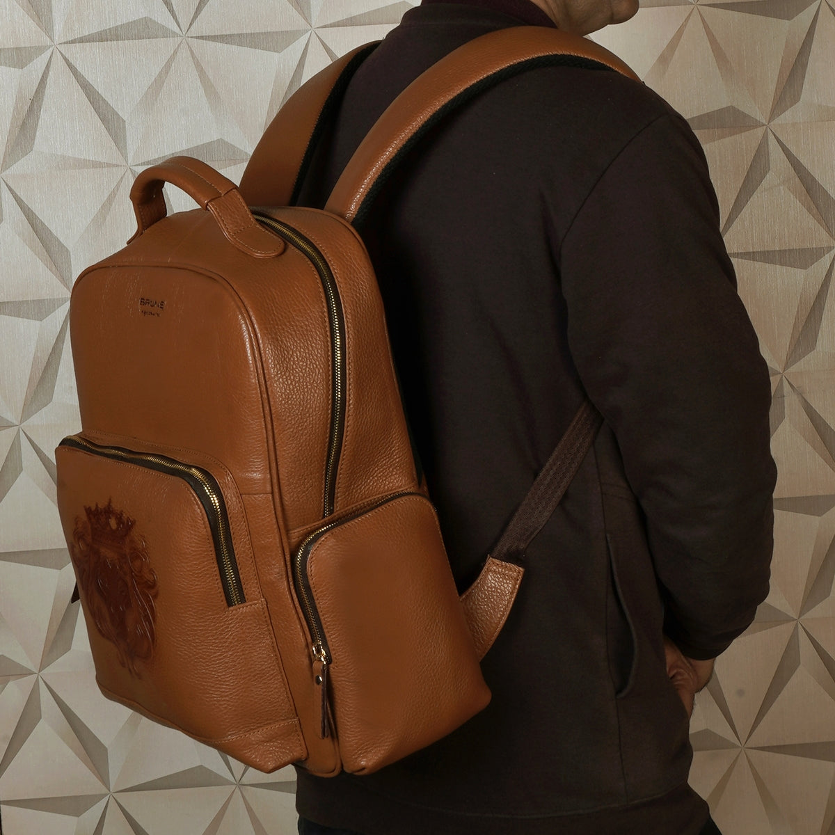 | Brune & Bareskin leather backpack bag get better with age like friends, like relationship, like you, like us. It is handmade tan backpack bag which is crafted with precisely selected premium exclusive textured leather. This textured leather backpack is a perfect buy for the folks who want the style game on point. The signature embossed lion looks awesome on front pocket. The compact size and adjustable textured shoulder straps make it very easy to carry. The padded back panel provides a very comfortable support. It has two golden zip pockets on both to carry essentials. It is a perfect bag for girls to use while small travel trips, office, school, college, university. 100% Genuine Leather provides the trust of quality. |