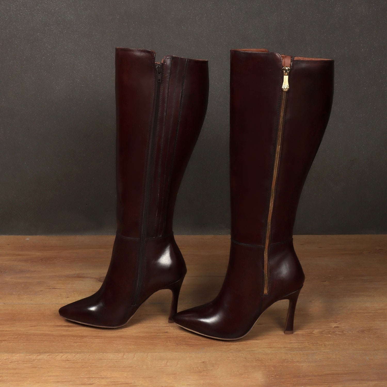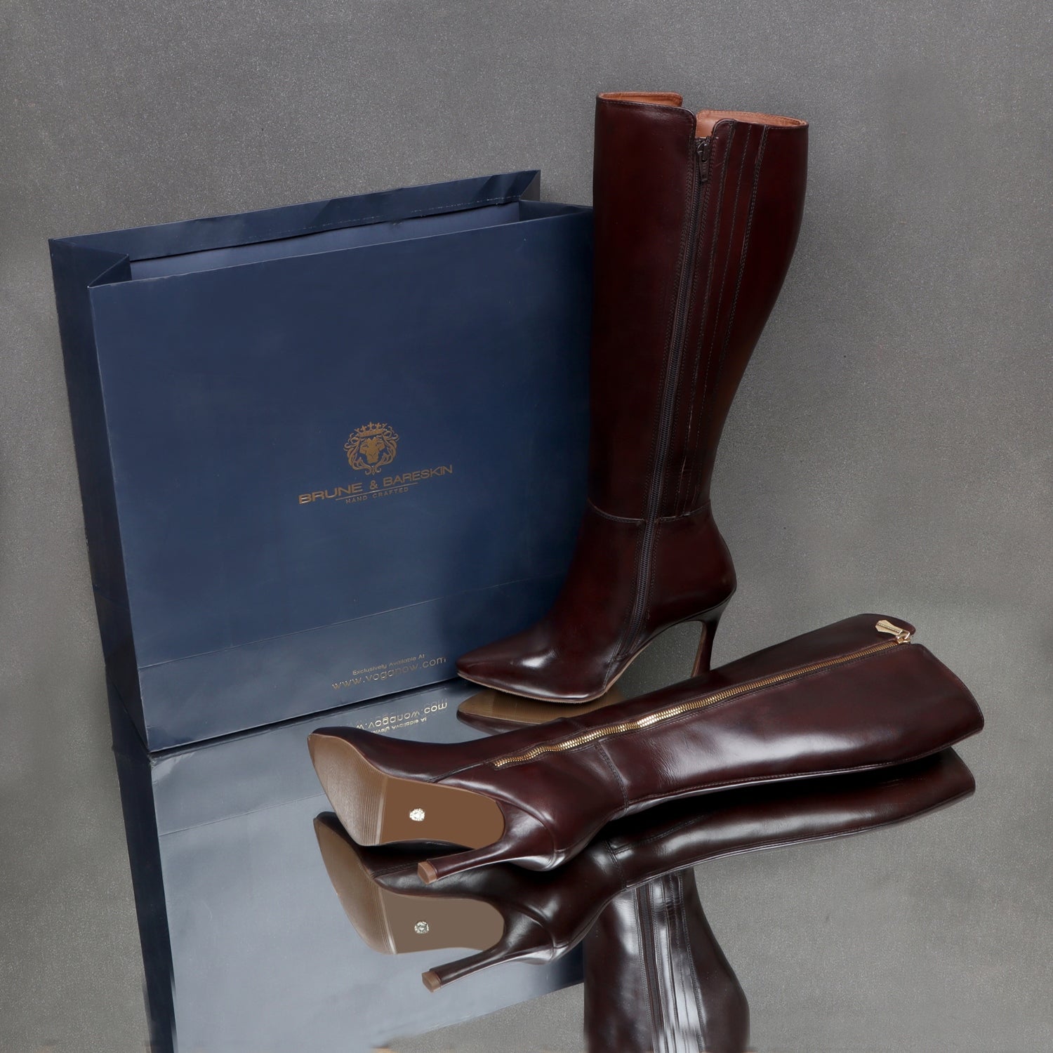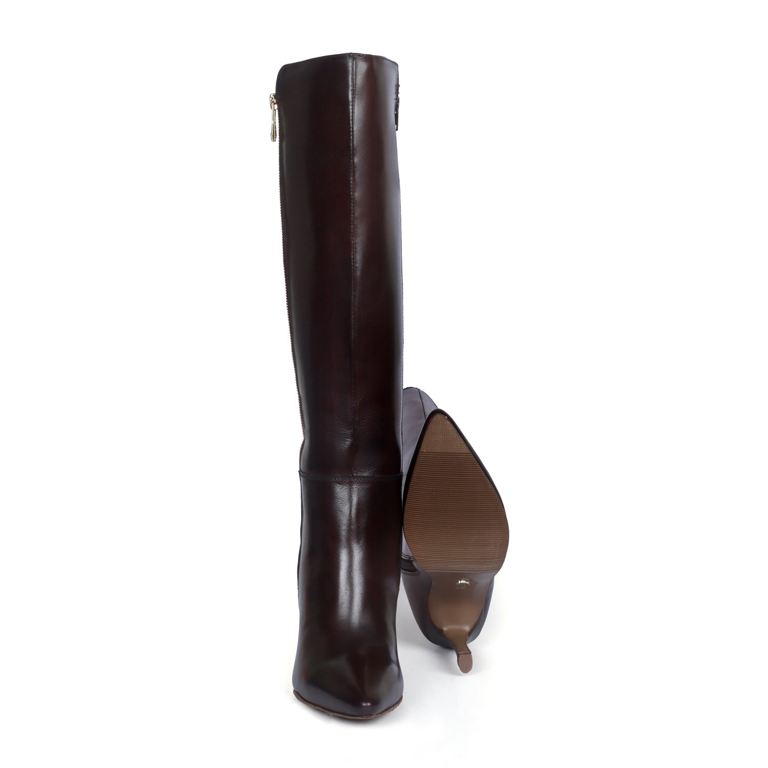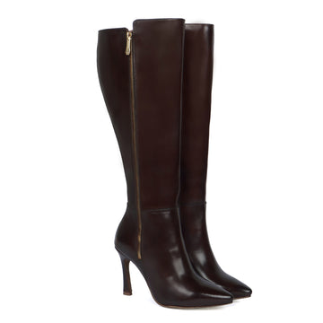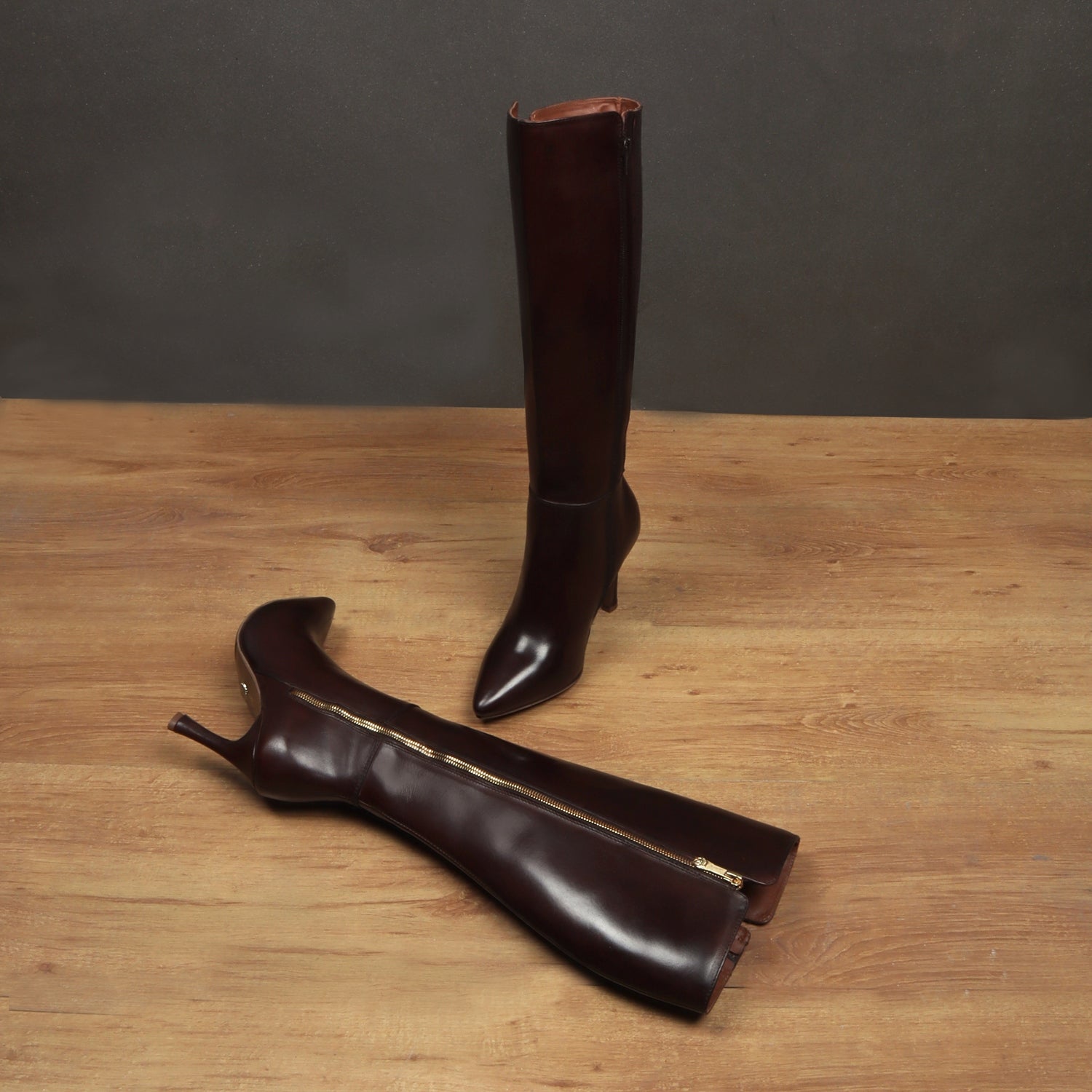 Pointed Toe Zipper Knee Heights Dark Brown Leather Ladies Stiletto Pencil Heel Boots By Brune & Bareskin