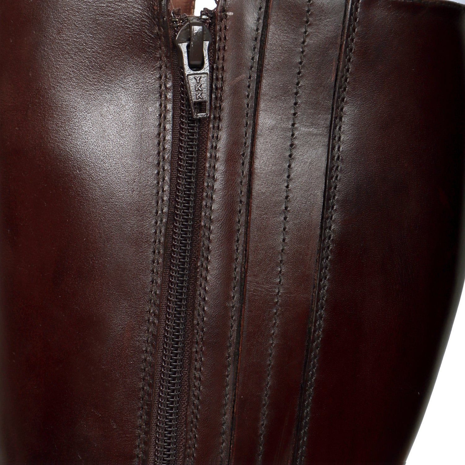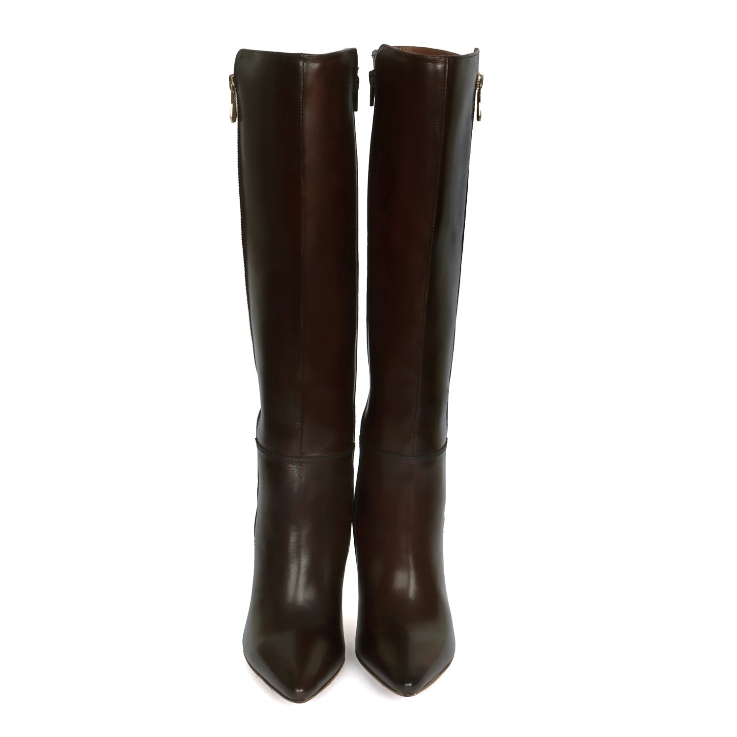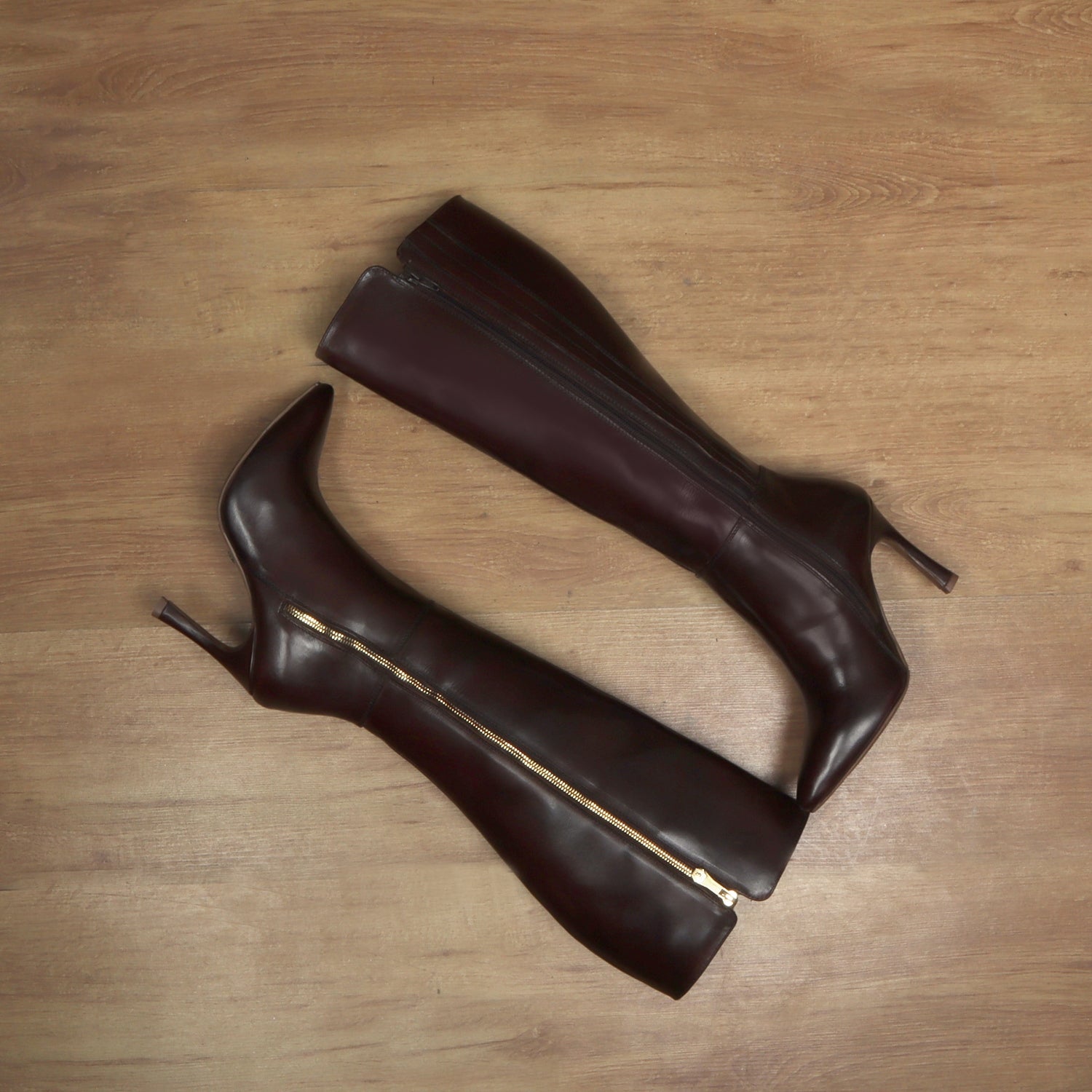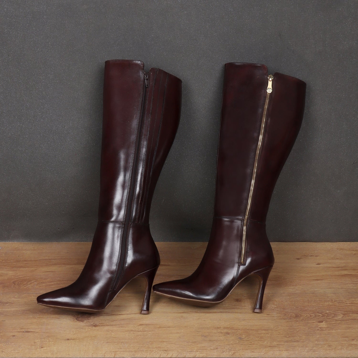 Pointed Toe Zipper Knee Heights Dark Brown Leather Ladies Stiletto Pencil Heel Boots By Brune & Bareskin