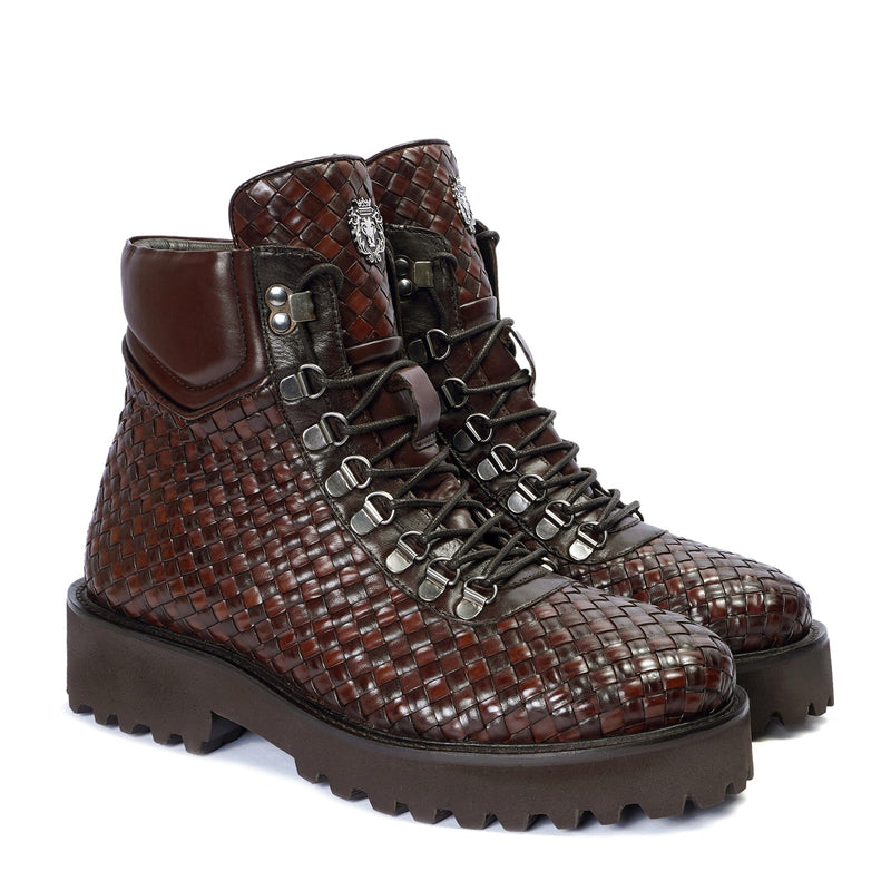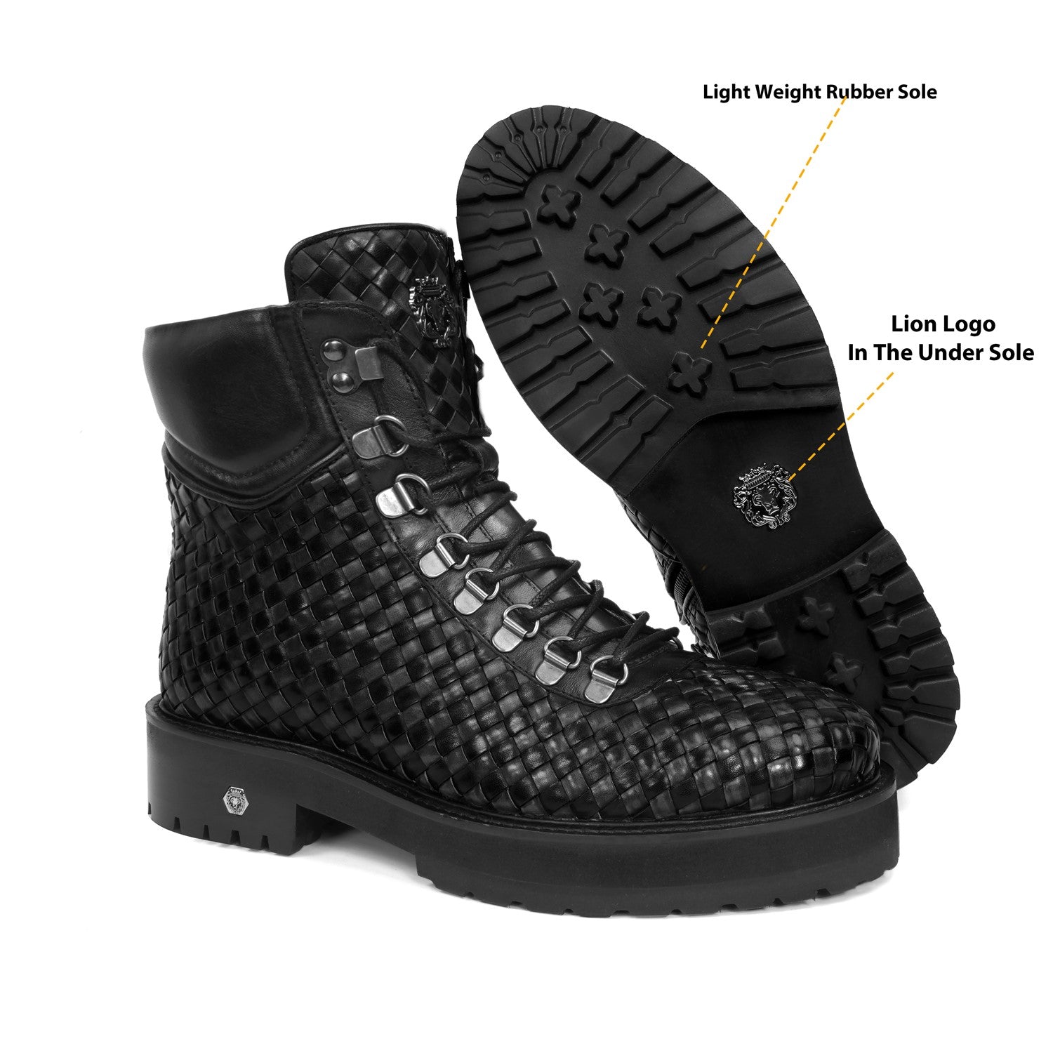 Elevate your footwear collection with these premium weaved-cut design boots, crafted from a combination of luxurious suede and smooth plain leather. Featuring a lightweight yet durable chunky sole, these boots offer all-day comfort without compromising on style. The D-ring eyelets and metal lion logo add a bold touch, while the padded collar ensures superior ankle support. With fine-quality stitching and a distinctive lion logo under the sole, these boots are perfect for urban adventures or rugged outdoor wear. A stylish fusion of elegance and durability, designed for trendsetters who demand both function and fashion.