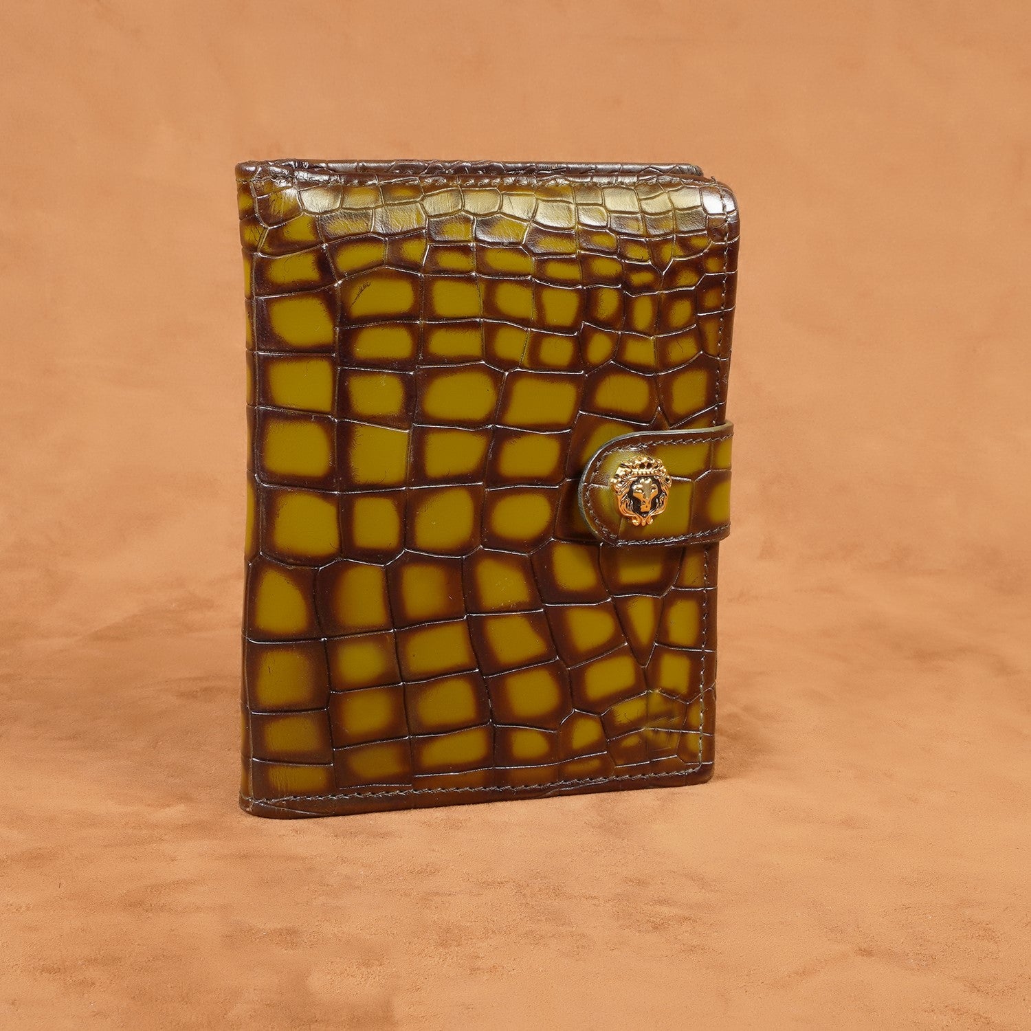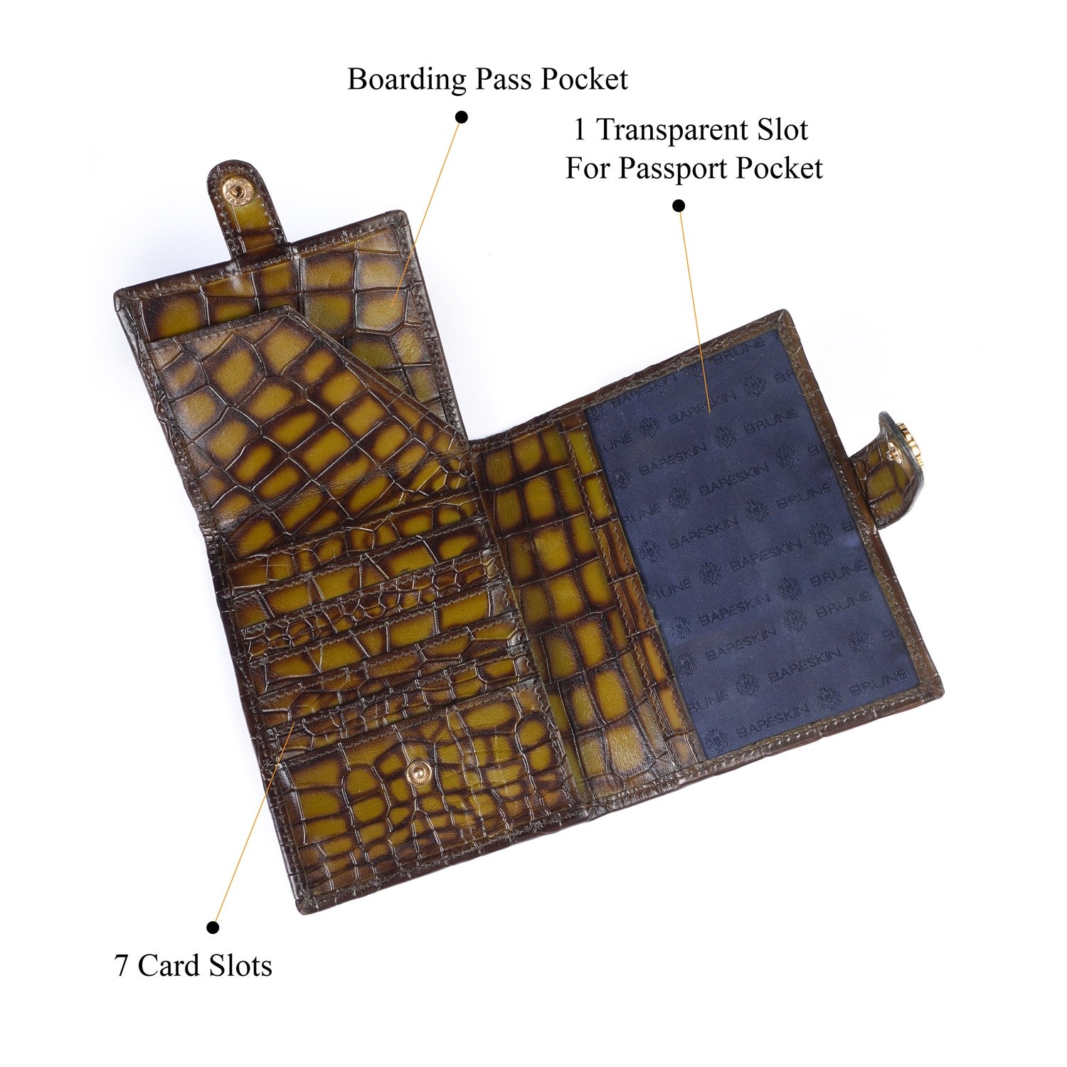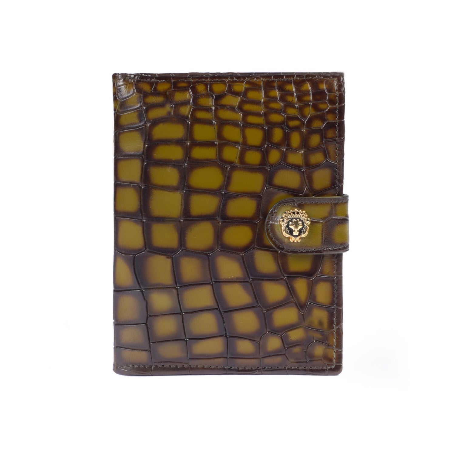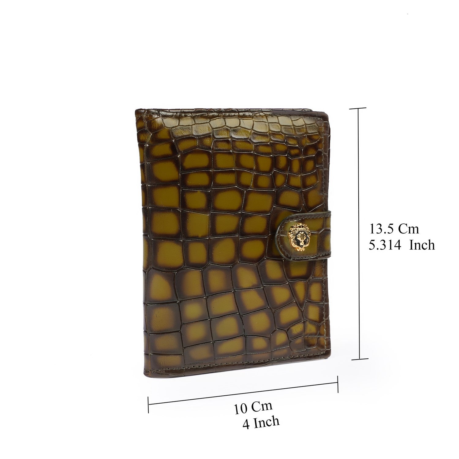 Premium Olive Leather Passport Holder with Foldable Boarding Pass is a sleek, jet-set essential handcrafted olive green full-grain leather boasting subtle embossed croco or pebbled texture for luxurious depth and a patina that personalizes with travel, featuring precision-stitched edges and a prominent 3D metal lion logo in antique gold