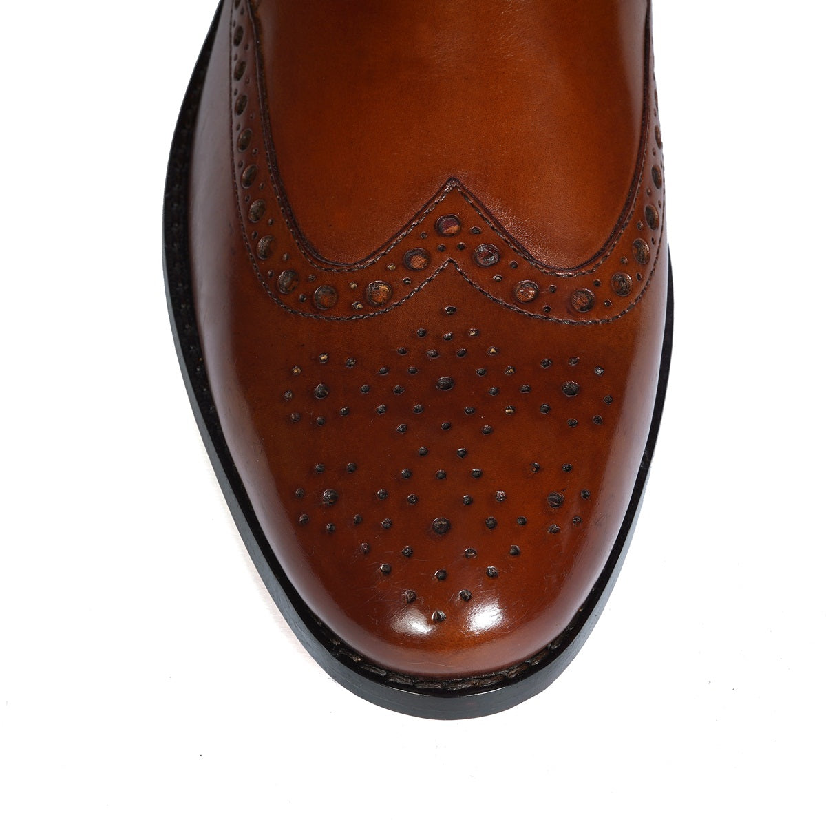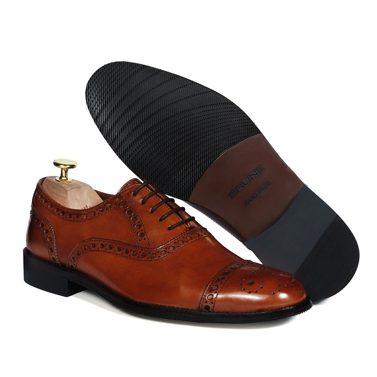 Indulge in style with these exquisite Punching Brogue Oxford Lace-Up Shoes for Men in Genuine Tan Leather. Crafted from genuine tan leather and polished with a patina finish, they feature a full punching brogue design and oxford lace-up closure, perfect for creating a look that's sophisticated and timeless. Their rubber sole ensures a secure grip and perfect fit, making them ideal for office and formal occasions. Brune & Bareskin's premium men's shoes make an ideal gift for the special man in your life.