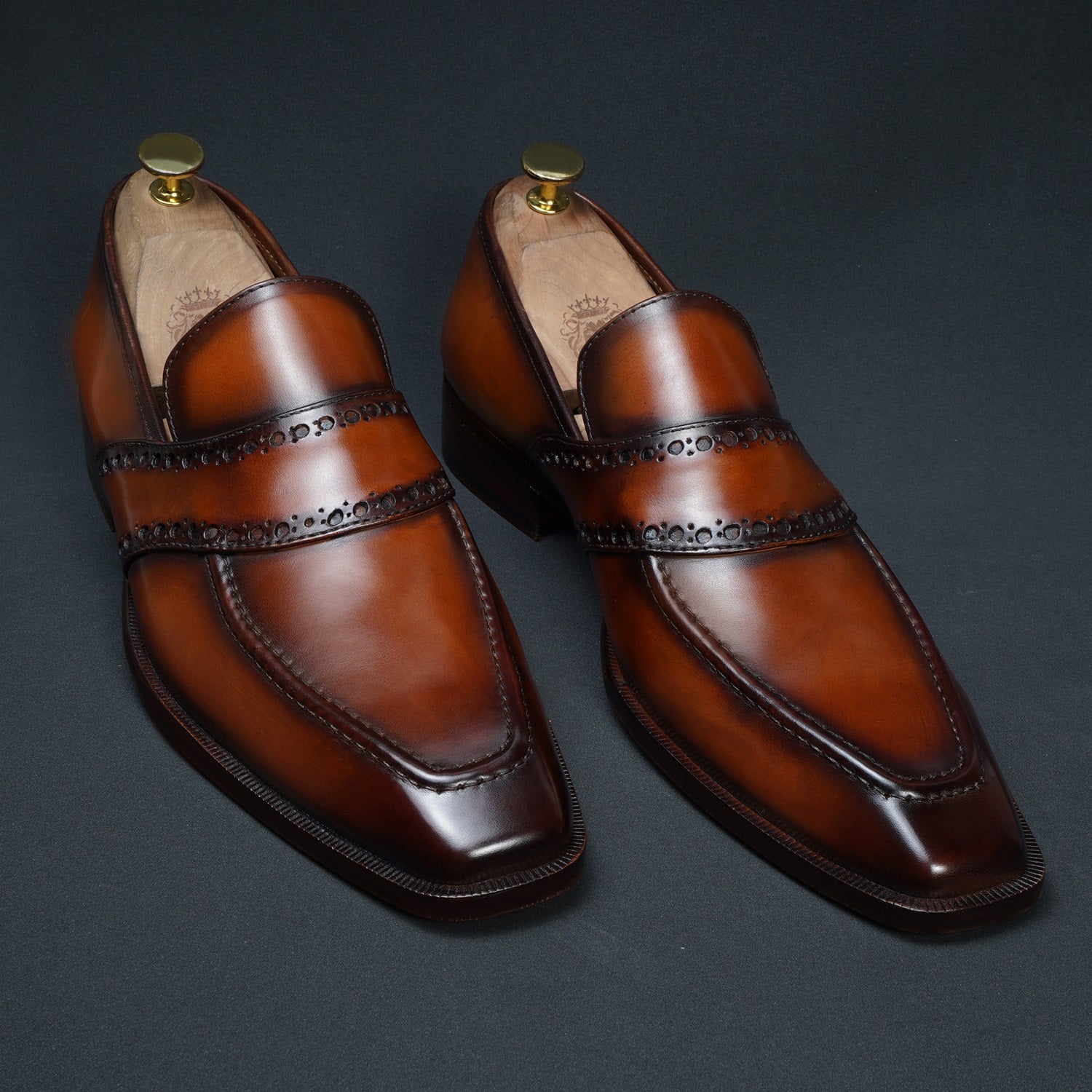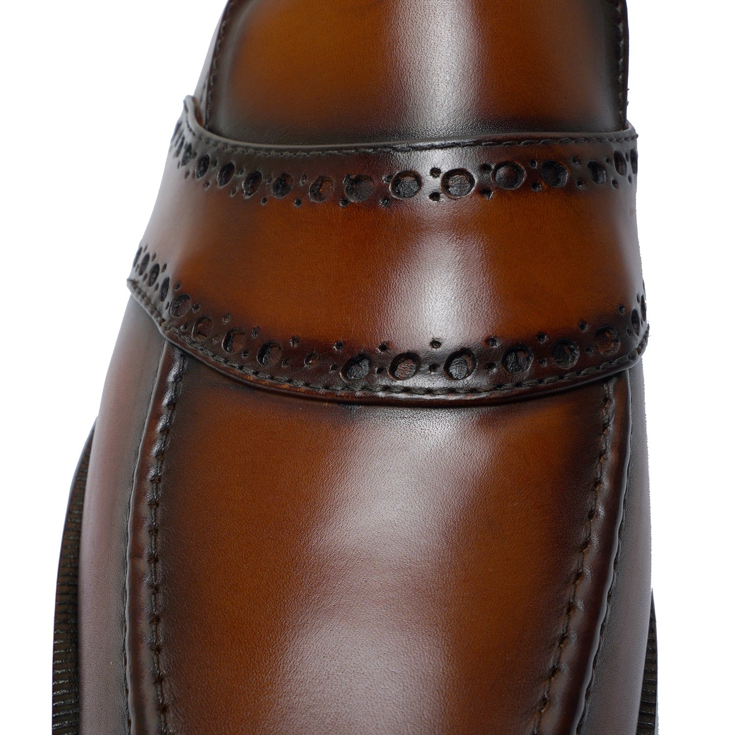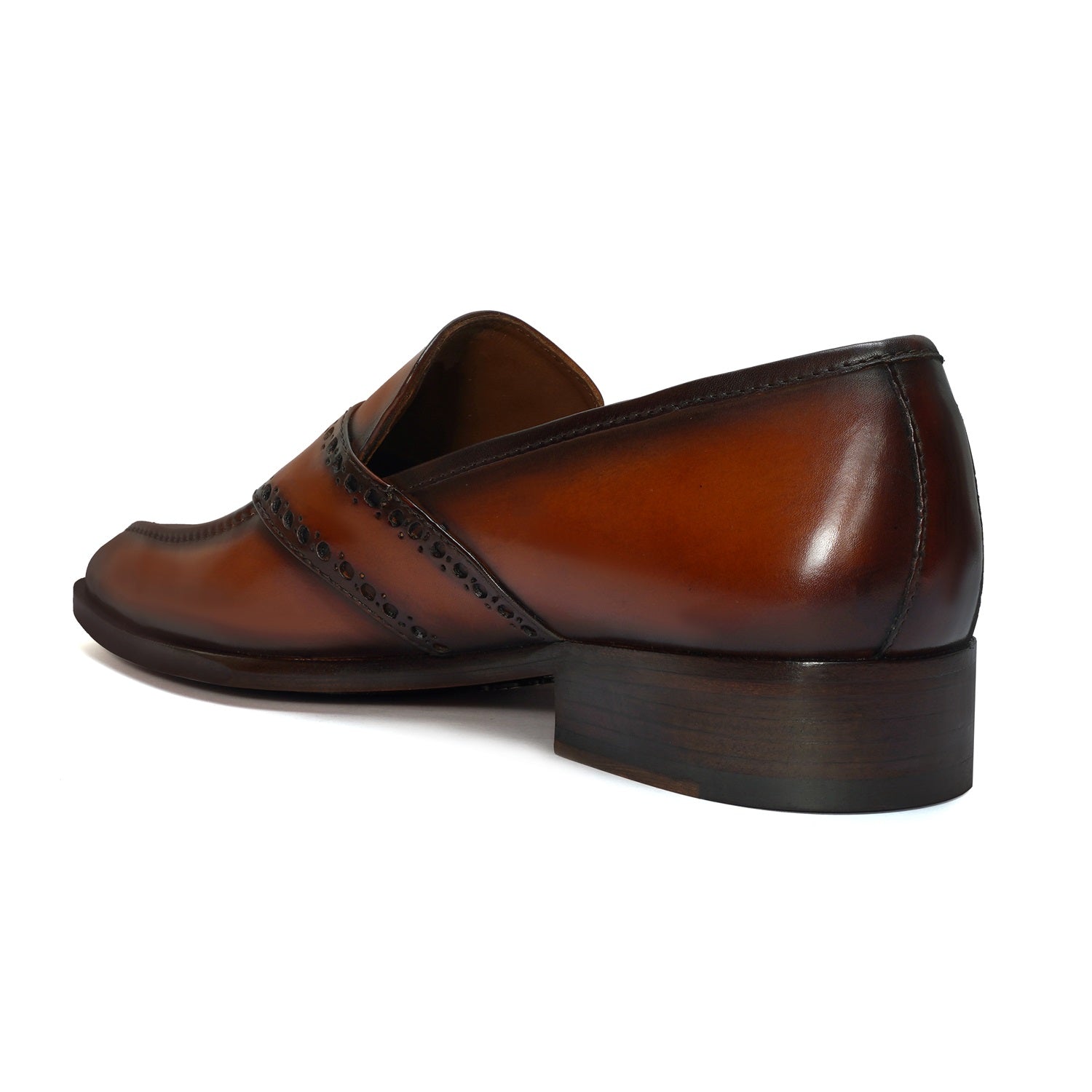 Punching Brogue Strap Loafers Burnished Cognac Leather Slip-On Shoes