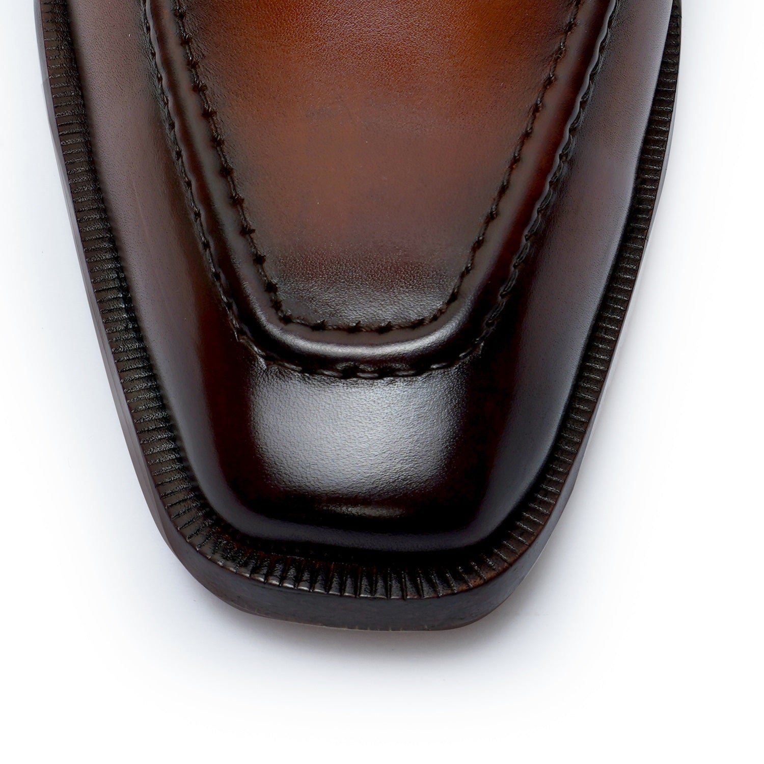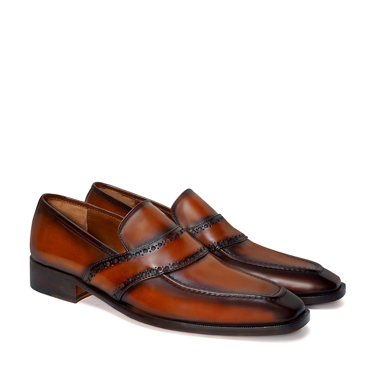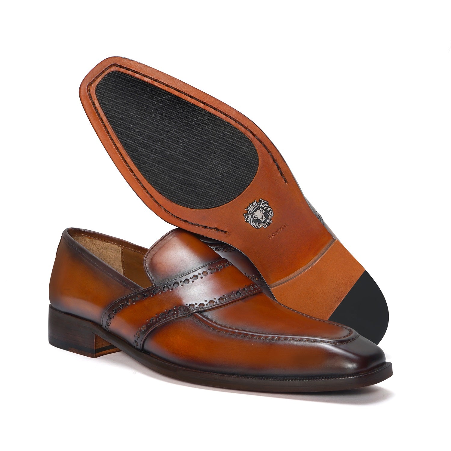 Punching Brogue Strap Loafers Burnished Cognac Leather Slip-On Shoes