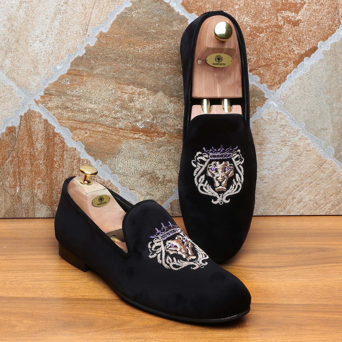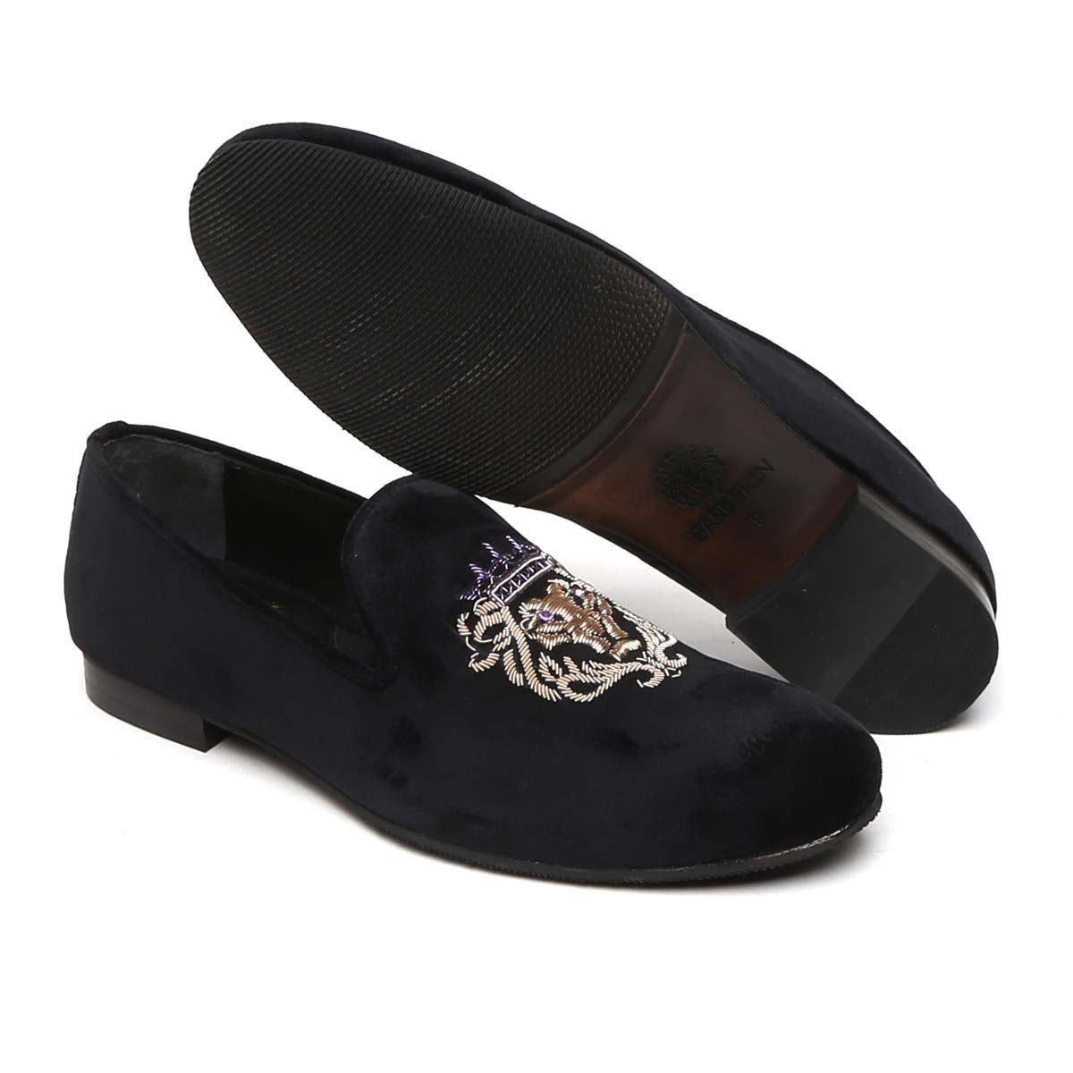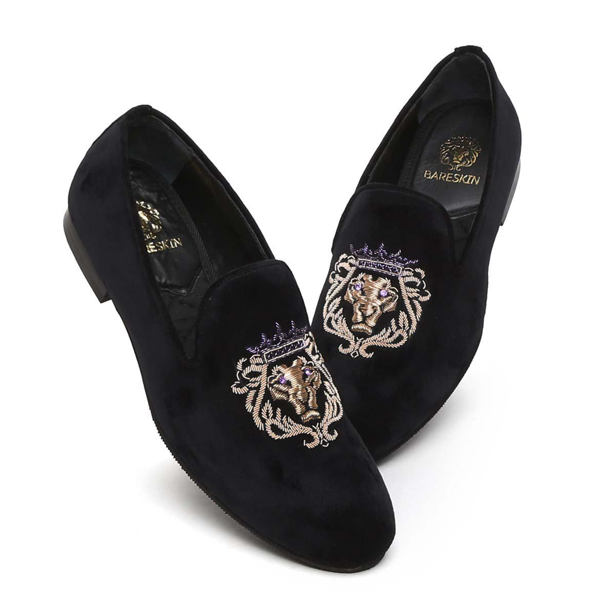 The Brune & Bareskin Lion Zardosi collection is a perfect Ethnic compliment footwear collection. The Lion hand zardosi is done by the most experience hands of the Industry. This Zardosi can be customized further to match the apparel theme. An elegant pair of Black slip on shoes is a must-have for every well dressed man. This smooth Velvet Black Slip-on gives an elite style and debonair look. This is an amazing addition to your wedding collection.