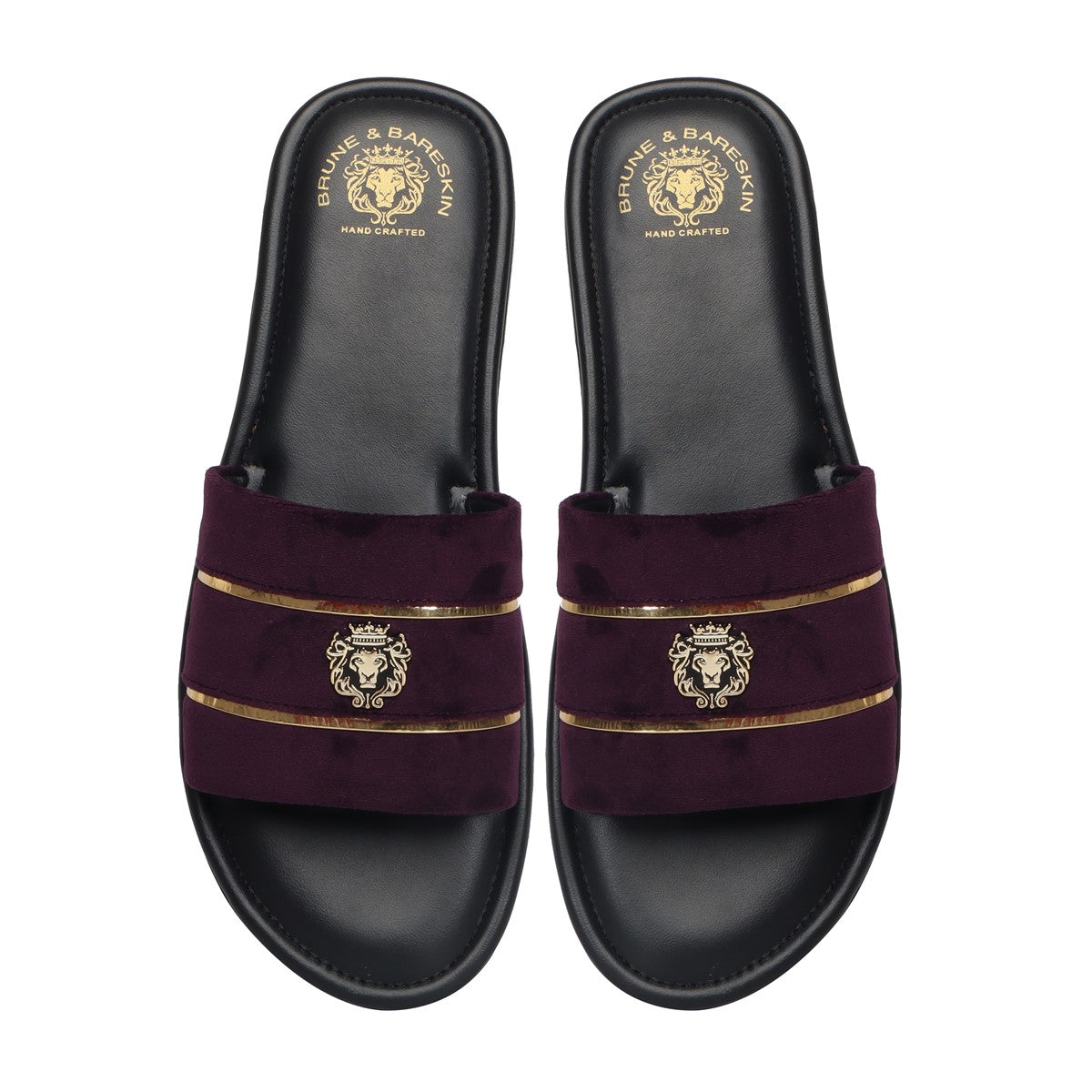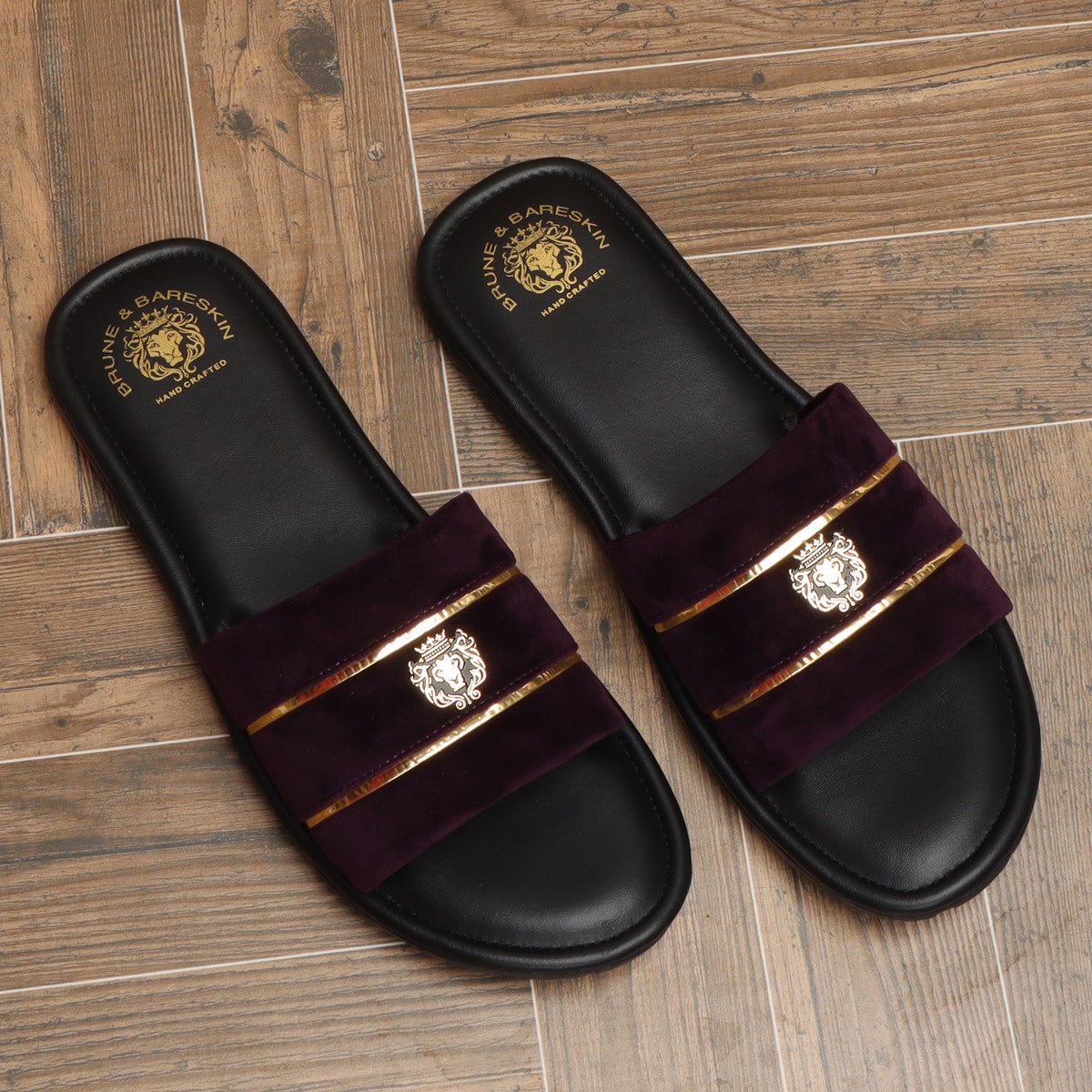 These purple velvet strap slide-in slippers look very elegant and feel cozy. This particular color shade is specially crafted for KKR team in their jersey color purple & gold. Moreover, it is super soft leather base slipper is a must-have of the season. Experience the utmost comfort while walking with gel Injected extra cushioned memory foam. We use special layering techniques to keep the base cozy and retain its shape. The purple velvet strap with BARESKIN Lion Logo enhances the elegance further. Carry this Black Golden Collection with Jeans, Shorts, Capris, and other casual wear to be a style leader. Anti-Skid Rubber outer sole ensures the perfect walking grip.
