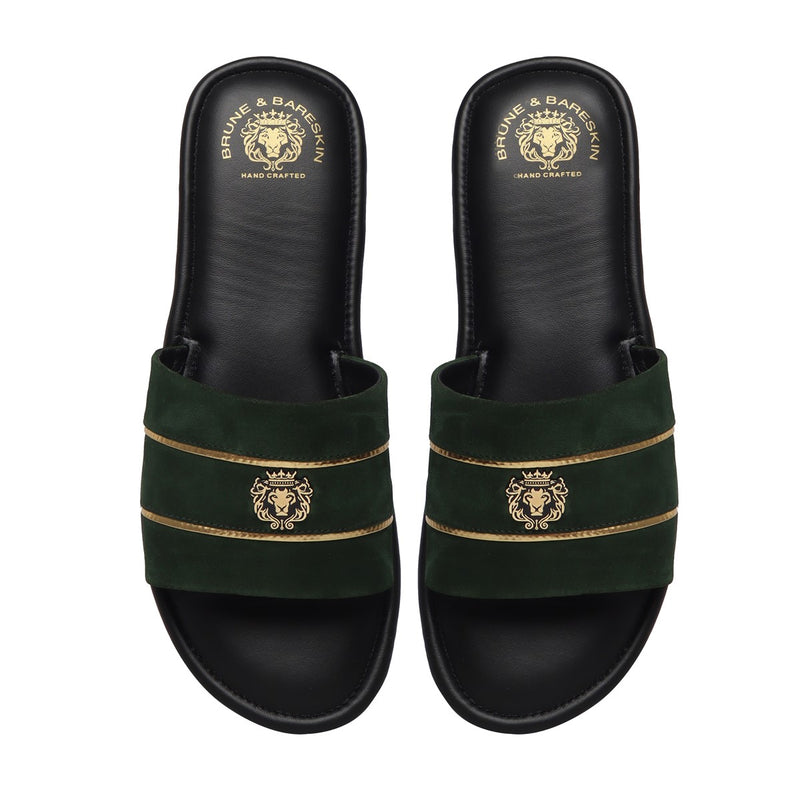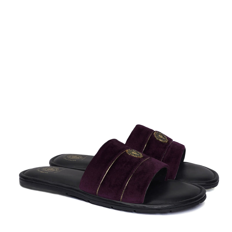 These purple velvet strap slide-in slippers look very elegant and feel cozy. This super-soft leather base slipper is a must-have of the season. The gel injected memory foam base is designed to provide you comfort while walking. We use special layering techniques to keep the base cozy and retain its shape. The purple velvet strap with BRUNE & BARESKIN Lion Logo enhances the elegance further. Carry this of Black Golden Collection with Jeans, Shorts, Capris and other casual wears to be style leader. Anti-Skid Rubber outer sole ensures the perfect walking grip.