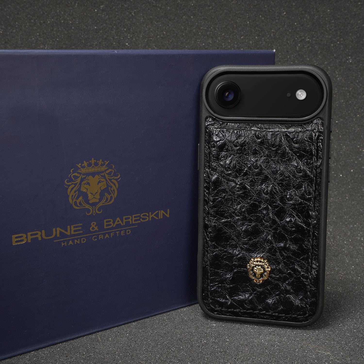 Made from real ostrich leather, this handcrafted iPhone Air case brings unmatched luxury and individuality. The natural texture of premium ostrich leather makes every piece unique, while the sleek black frame creates a striking contrast. Accented with the iconic Brune & Bareskin golden lion logo, this case is more than just protection—it’s a bold expression of elegance and style.