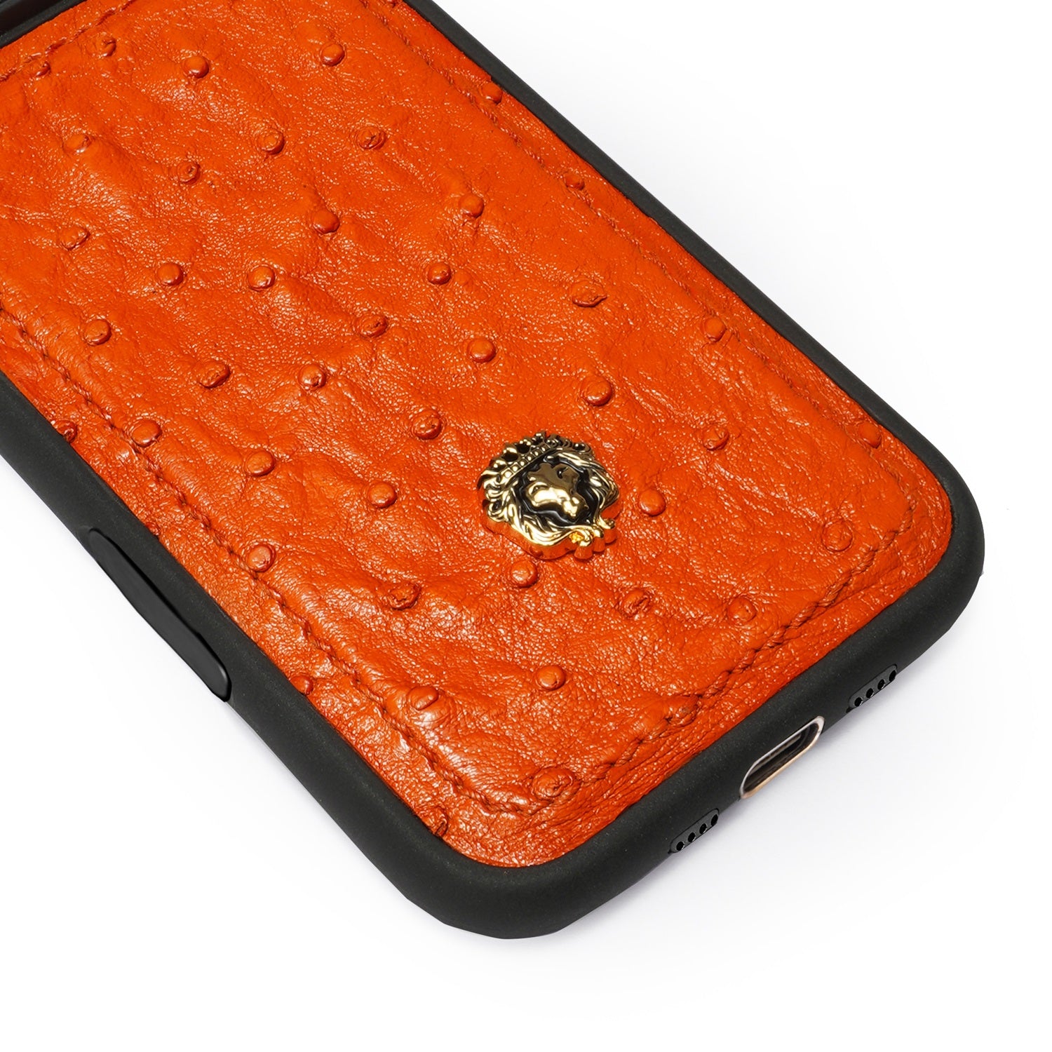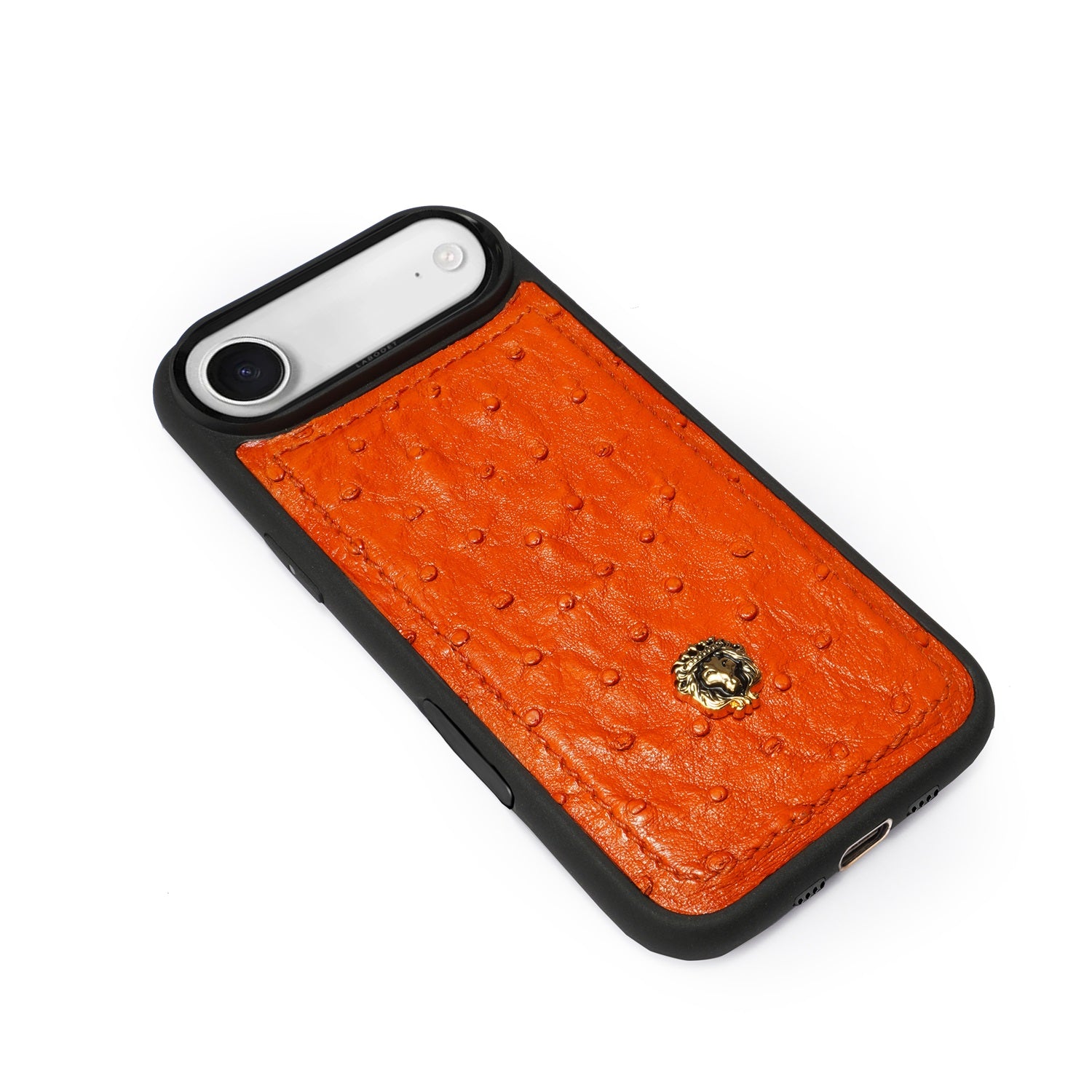 Crafted from real ostrich leather, this handcrafted iPhone Air case blends everyday function with timeless luxury. The vibrant orange leather with its natural ostrich texture makes each piece unique, while the sleek black frame adds a refined contrast. Finished with the iconic Brune & Bareskin lion emblem in gold, this case is designed to offer both protection and prestige in one bold statement.