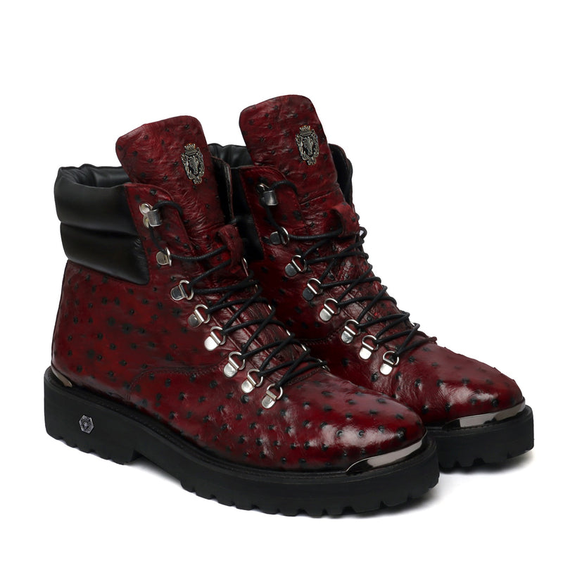 This pair of Real Ostrich Leather Biker Boot is an ideal pick for a cozy and elegant everyday wear. The rugged look makes it perfect pair that every guy should have in the closet. Wine ostrich Leather shoe looks lavishing with metal shoe eyelets and Brune & Bareskin's signature metal lion logo. The metal plates on toe and ankle provides the more rigidity and oomph to it. The natural texture of Ostrich Leather adds an extra element of style. You can customize this chic boots in any of your favorite color with our bespoke services.