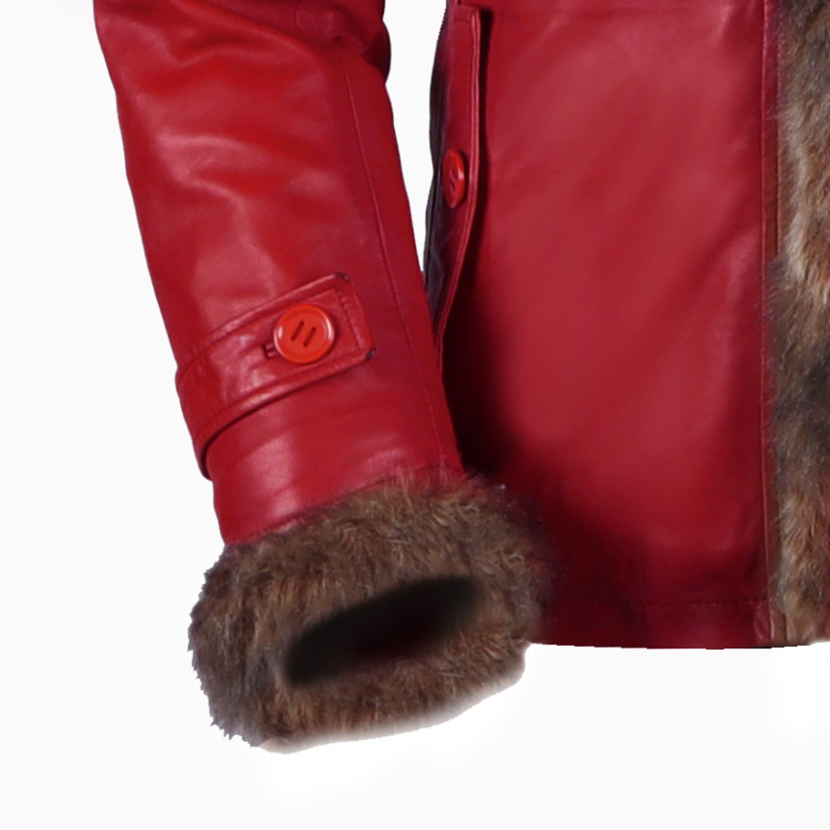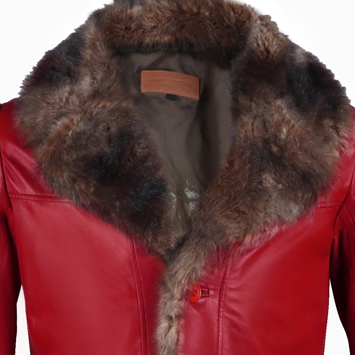 Light Weight Leather Long Red Jacket with Furr Collar & Sleeves By Brune & Bareskin
