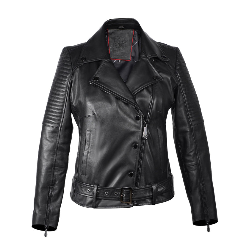 Red Leather Women Padded Sleeves Biker Jacket by BARESKIN