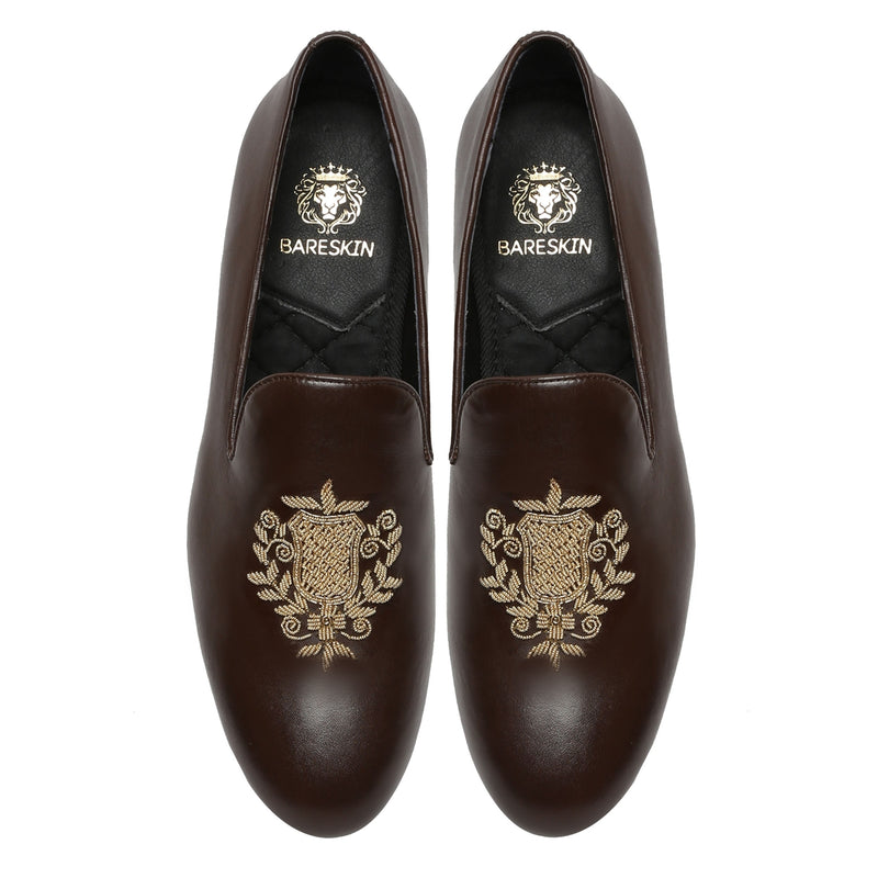 It's hard to be a master of Patent Leather Skill, at BRUNE & BARESKIN, we have industries leading craftsmen who take care of this special classic unit. This Black Patent Leather Slip-On shoe with royal crest silver zardosi is very swanky in looks. it is a pair of hand-made Black Shiny Finished Leather with Zardosi style Slip-On Shoes, by Brune & Bareskin, then you are sure to be satisfied, with the fit and the style. These hand-zardosi ethnic slip-on shoes are made to provide the perfect look in this modern era. Zardosi Hand Work done by the most skilled sewing team in the country, makes this slip-on distinct from others. This is the best pair of shoes to win every party you attend. This shoe enhances the style quotient, especially with formal and semi-formal attires. Extra padded foot-bed provides the additional comfort to the feet. This is a must have addition to your fashion collection. Pair these Ethnic Slip-ons with ethnic apparel and be the show-stopper at any party.