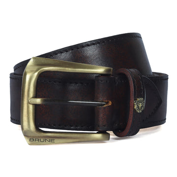 The Stylish Mini lion logo and dark brown with smokey gold new Slant Shape finished buckle enhances its appearance further. This two-toning dark brown attractive belt ranks high on the latest Formal style to offer you well-deserved popularity. This rust finish dark brown Hand Crafted Leather Formal belt for men ensures to keep you in comfort all day long. The artistic rust looks achieved by our artisans. The smokey finished gold buckle enhances its appearance further. It can easily be teamed up with our leather shoes and other accessories.