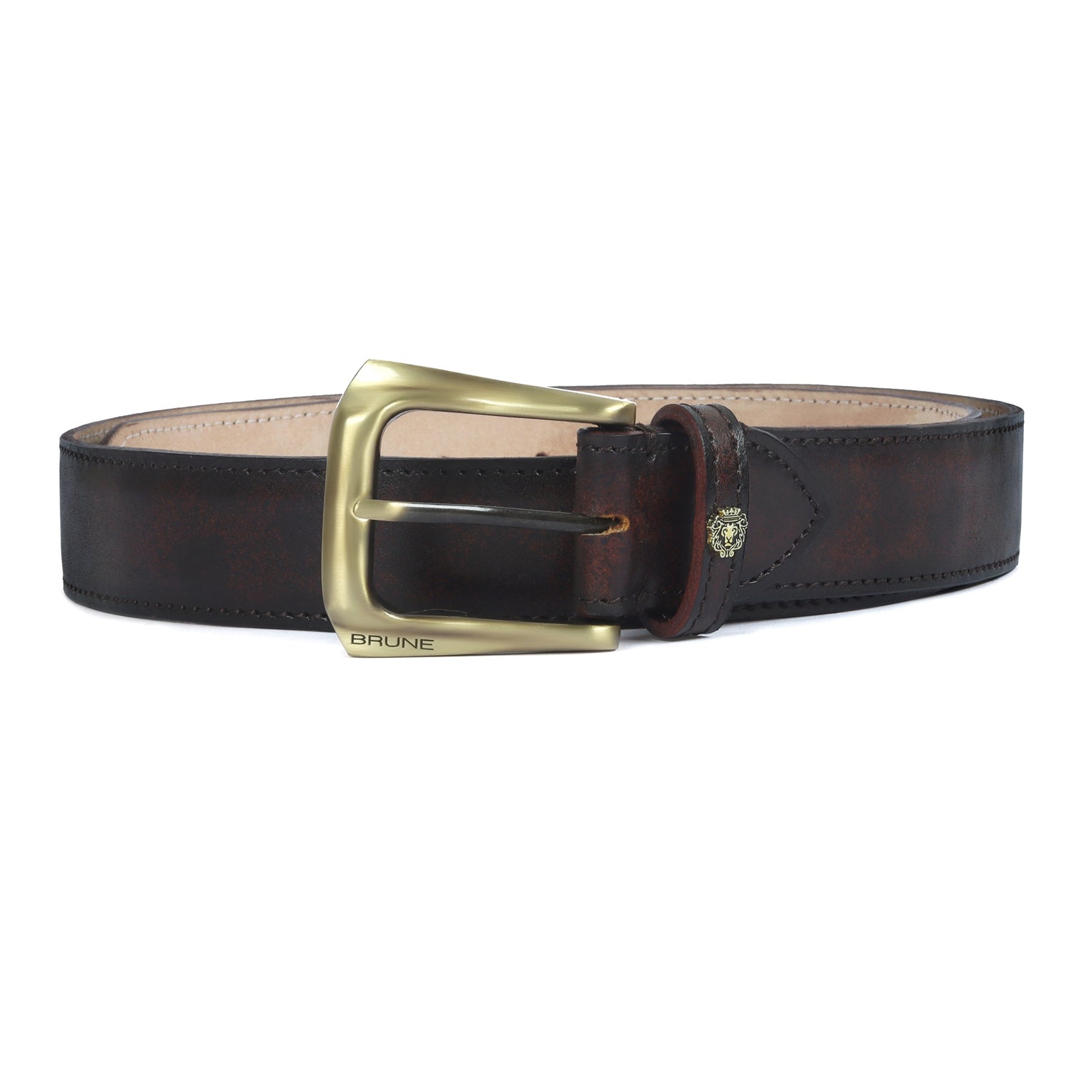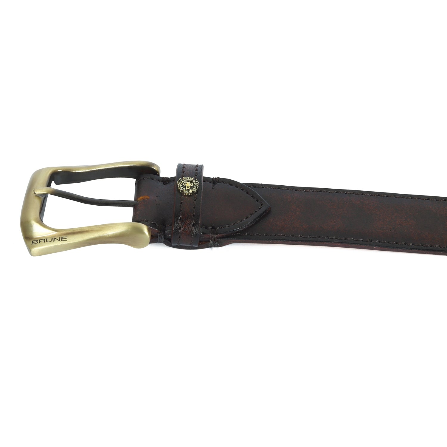 Rustic Dark Brown Leather Belt Mini Lion Slant Shape Smokey Gold Buckle By Brune & Bareskin
