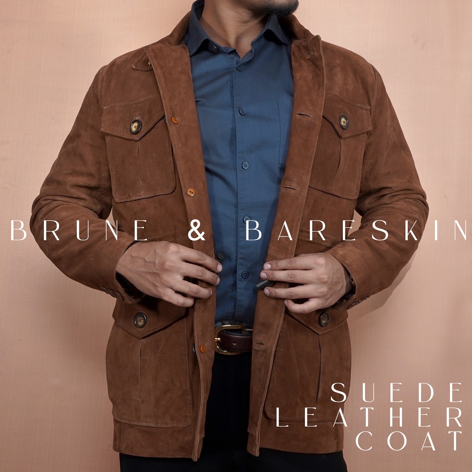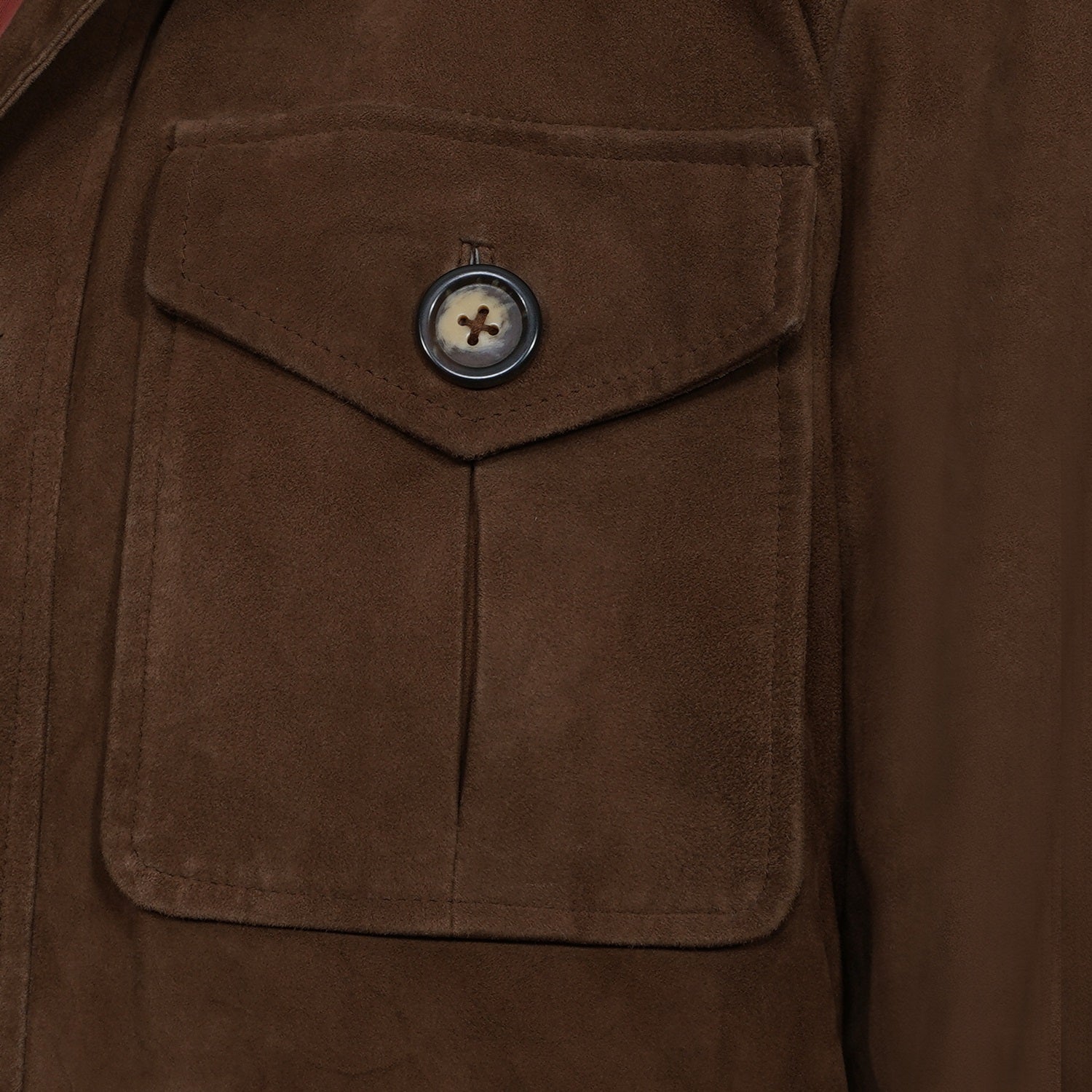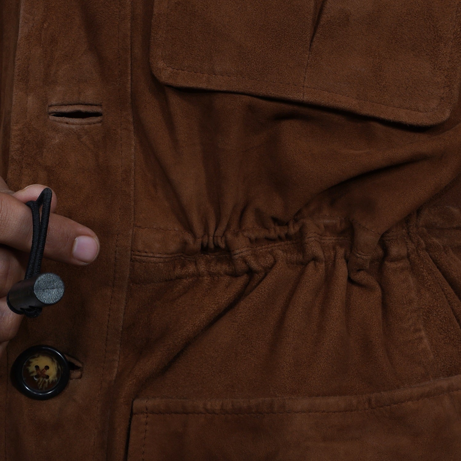 Discover luxurious comfort and timeless style with this ultra-soft Brune & Bareskin Safari Brown Goat Suede Leather Jacket. Boasting light fabric and a slim fit cut for an elegant silhouette, this piece features a five-button placket, patch front waist pockets, cuffs with a three button closure, and interior draw cord for waist adjustment. Plus, you'll revel in the opulent feel of goat suede leather and a super soft touch experience. An effortlessly fashionable wardrobe staple.