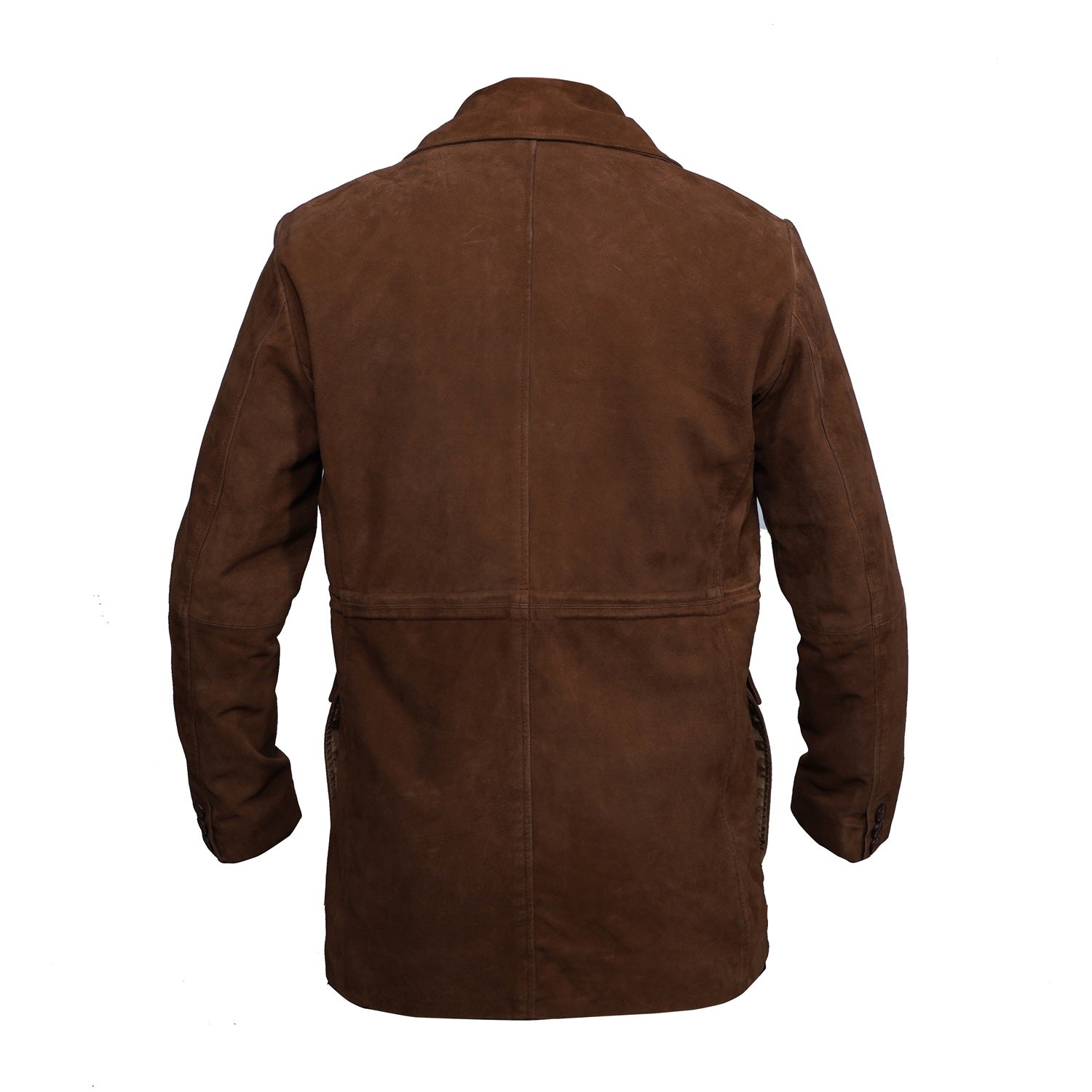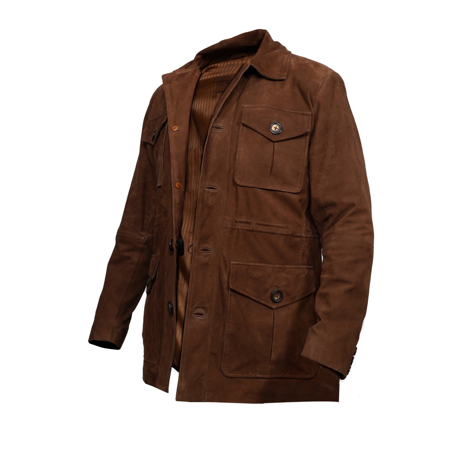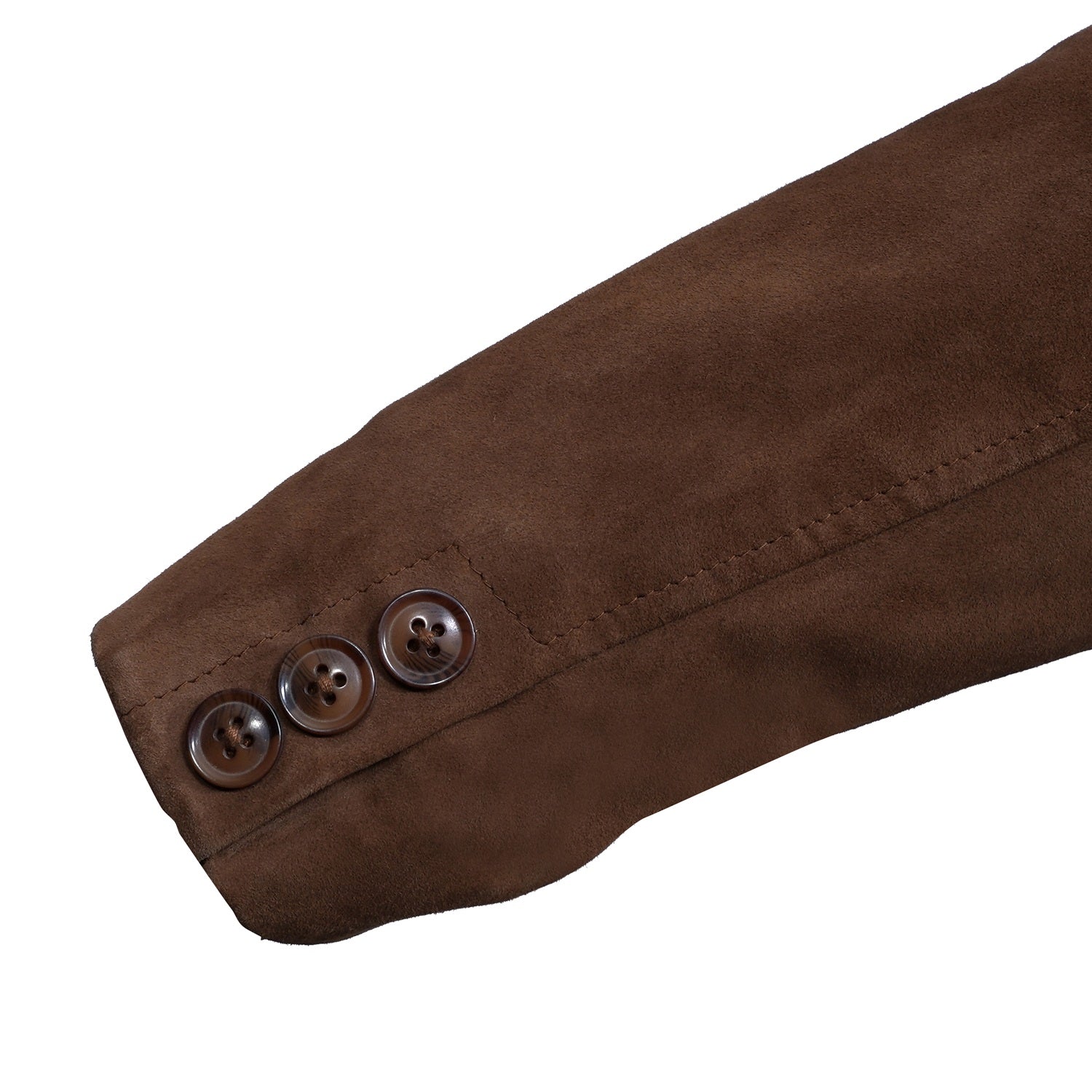 Discover luxurious comfort and timeless style with this ultra-soft Brune & Bareskin Safari Brown Goat Suede Leather Jacket. Boasting light fabric and a slim fit cut for an elegant silhouette, this piece features a five-button placket, patch front waist pockets, cuffs with a three button closure, and interior draw cord for waist adjustment. Plus, you'll revel in the opulent feel of goat suede leather and a super soft touch experience. An effortlessly fashionable wardrobe staple.