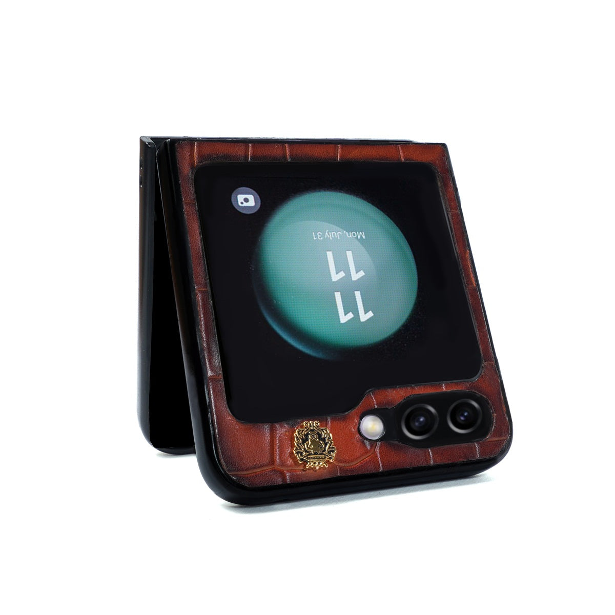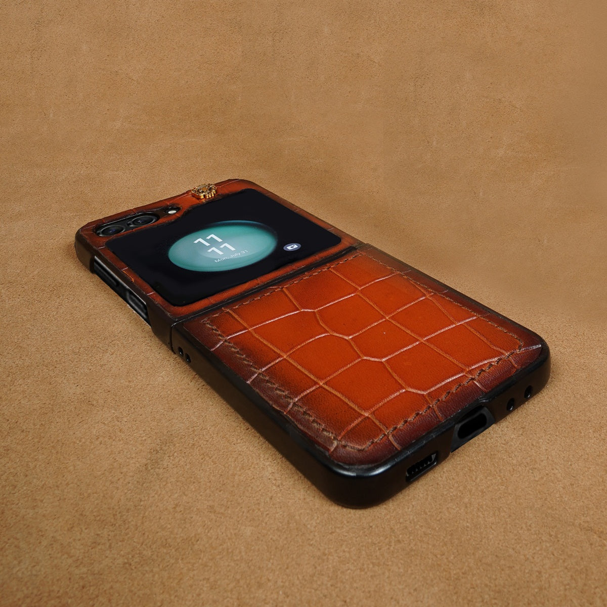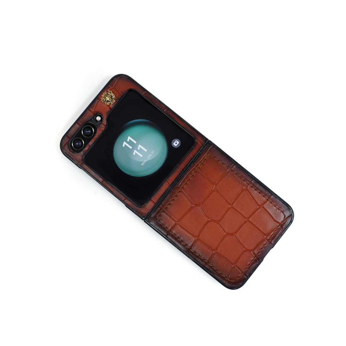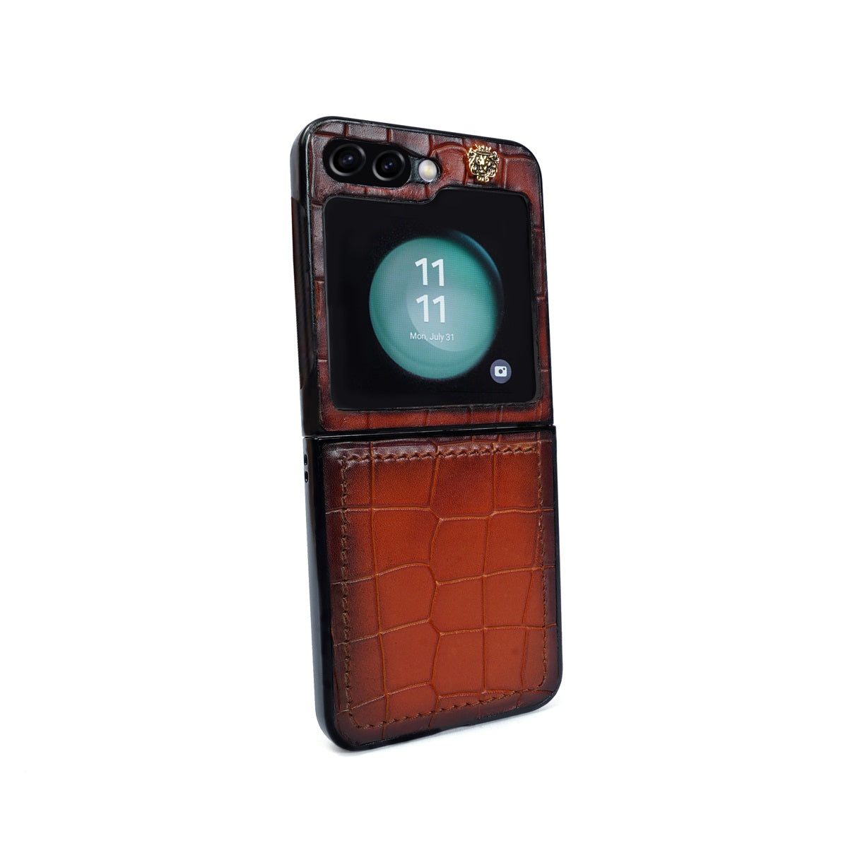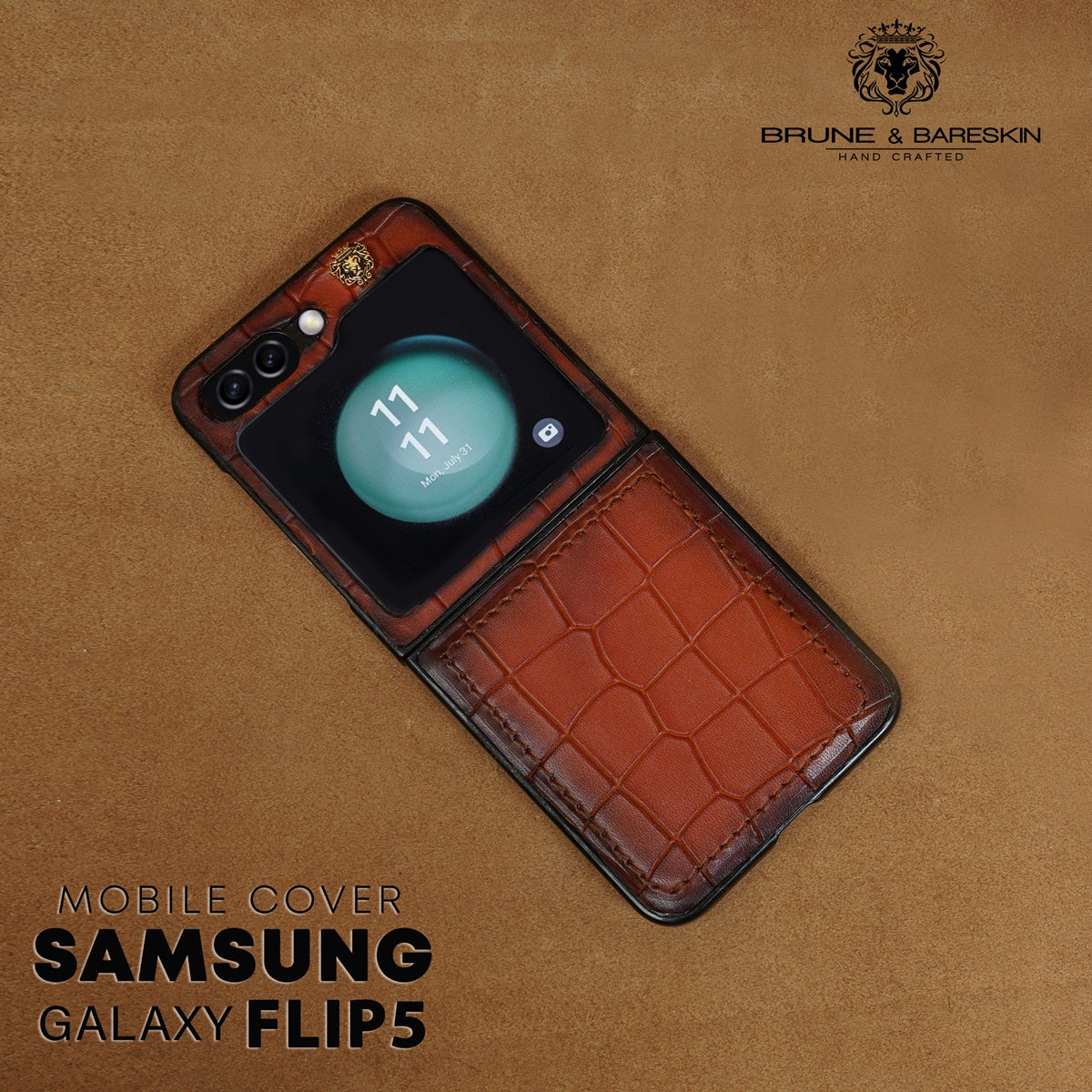 Protect your Samsung Galaxy Flip 5 with this handmade cover with a luxurious tan deep cut croco textured leather finish. This stylish, unique look is complete with a lion logo. Let your device stand out in a crowd with this protective and eye-catching cover. You can get it customized in your favorite color shade with your name initials embossed on it. What are you waiting for? You can click on CUSTOMIZE NOW Button (Just above the "ADD TO CART" button) & fill out the form to submit your customization requirements. Or you can reach us by Call, Email, WhatsApp, and DM.