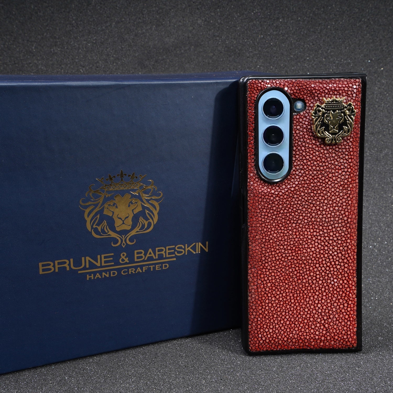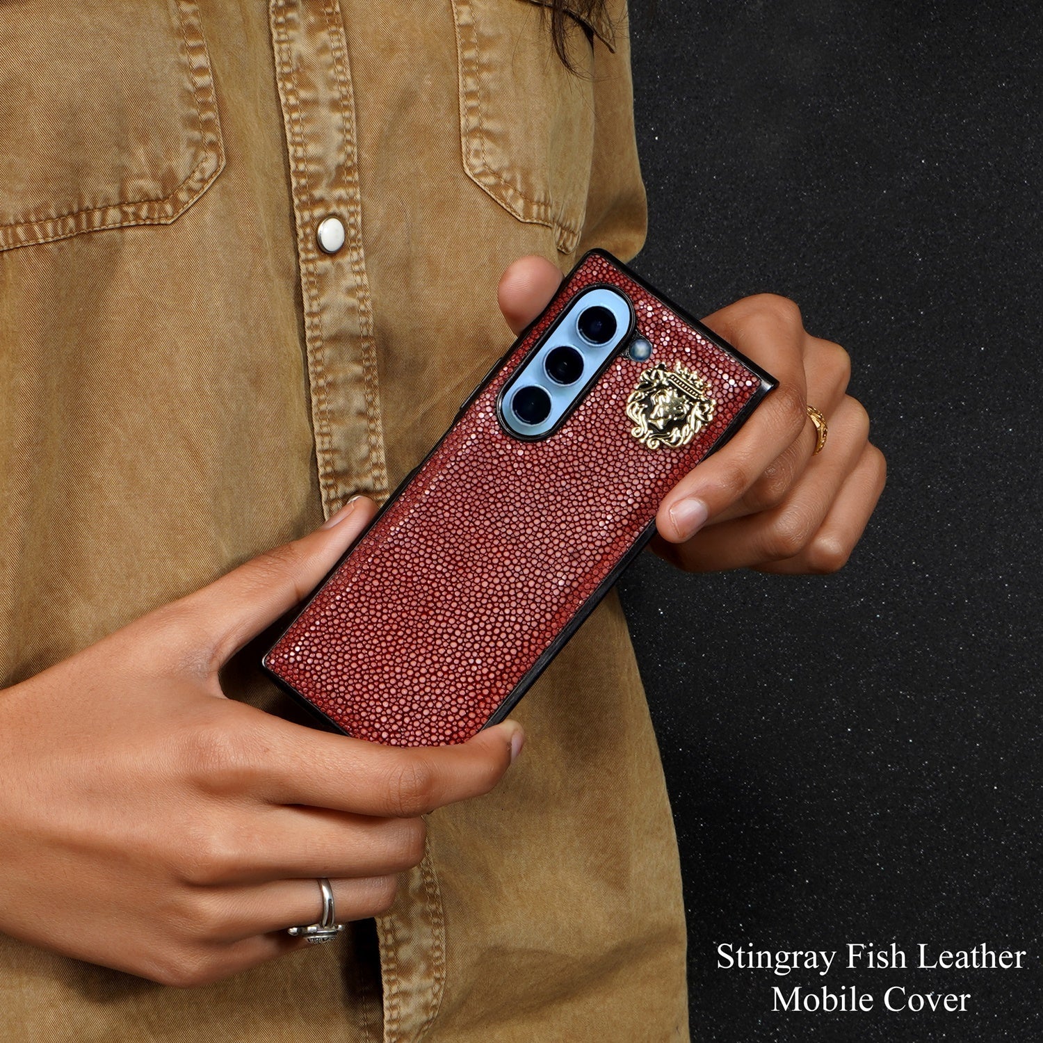Introducing the exotic stingray fish leather products. This handmade stingray fish leather Samsung Galaxy Fold mobile cover is an elegant pick. You would love to carry your phone with this cover. The stingray leather is one of the hardest to cut, puncture and penetrate through which provides decades of life to the products. The natural of shine of Stingray Leather Increases with more usage. This exotic stingray fish leather cover leaves a remarkable mark of style. The Brune & Bareskin signature metal lion brand logo increases the style quotient further. This cover is designed to work in both modes, closed and open without any hiccup. This leather has a natural shine which only increases with regular usage. Due to its superior quality & ultra durability it can last for 4 decades easily. It is water & scratch resistant.