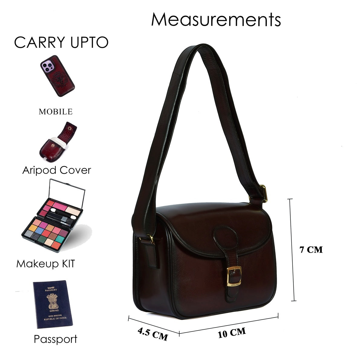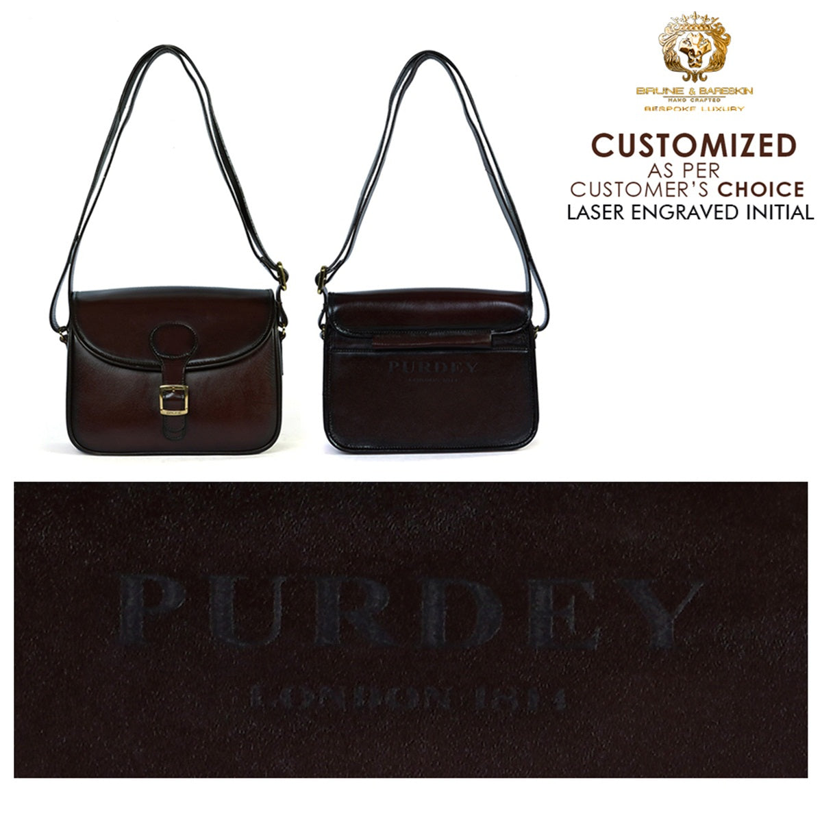 On-Demand of our customer the name will be mentioned on the bag with the Laser technique like "PURDEY" and "LONDON 1811" Initial mentioned on the backside of crossbody bag/sling bag is done for our special customer. The contrasting laser dignified the darker shade of Dark brown leather perfectly on the sling bag. Laser engraving Leather ladies shoulder sling bag looks lavishing.