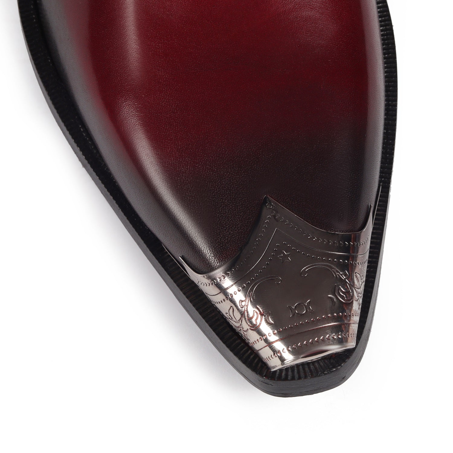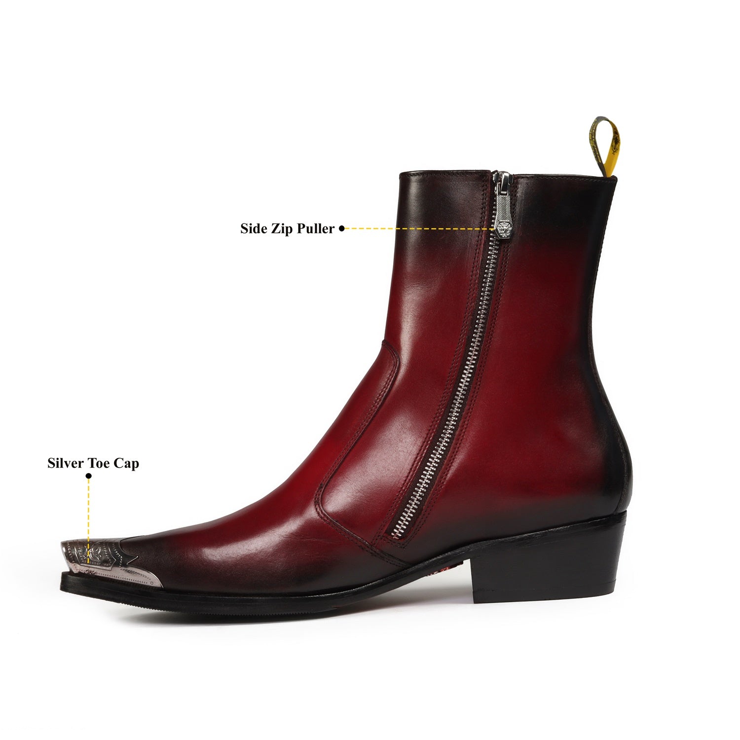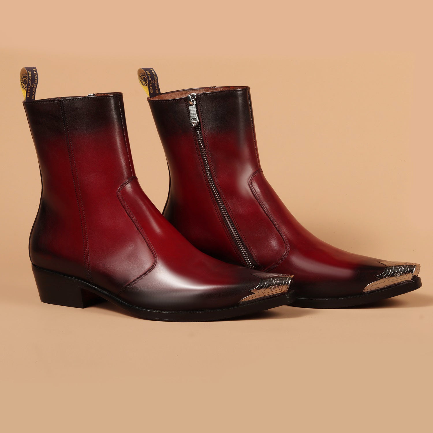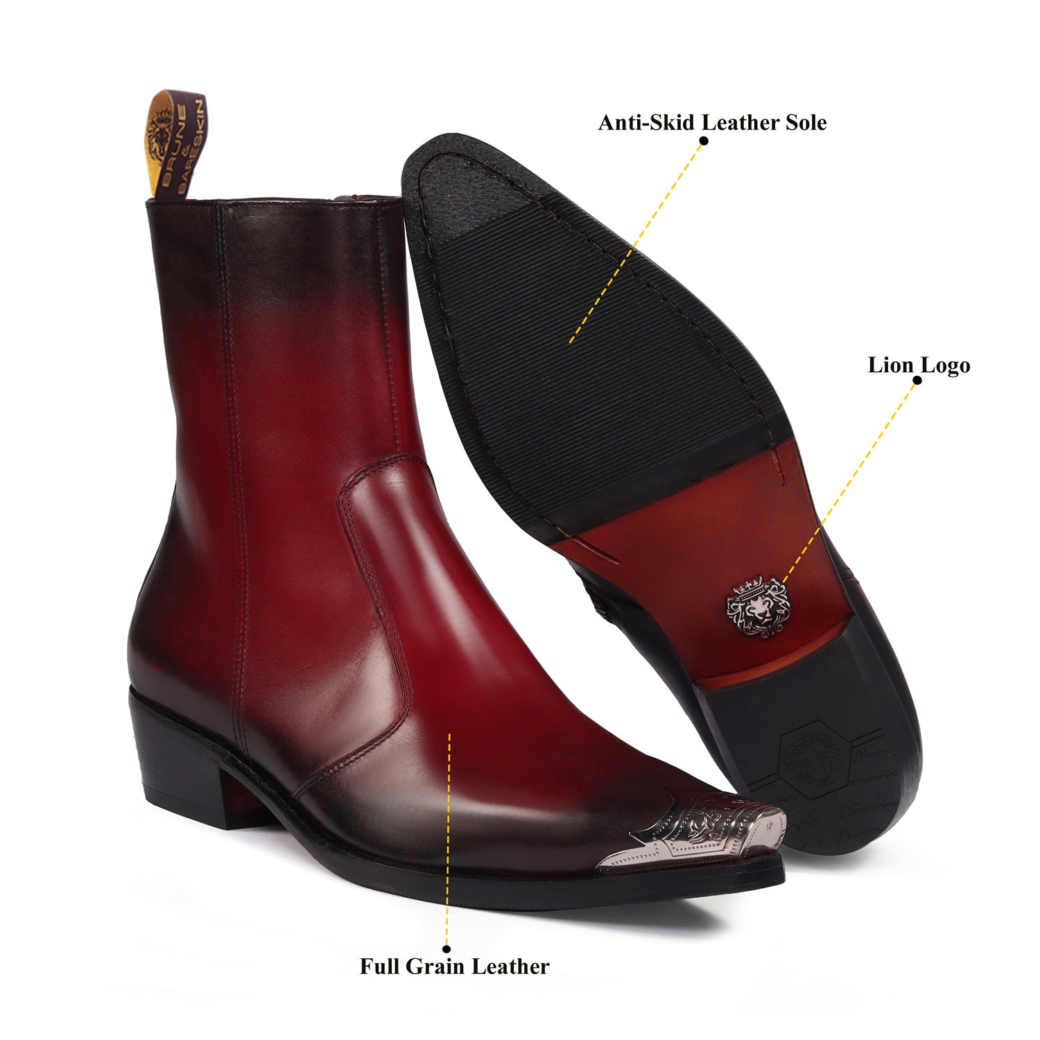 Step into style with our Metallic Cap Toe Cowboy Wine Boots. Hand crafted with premium quality full grain leather, these men's high ankle boots feature a unique patina finish and stitched detailing for a classic cow boy style.