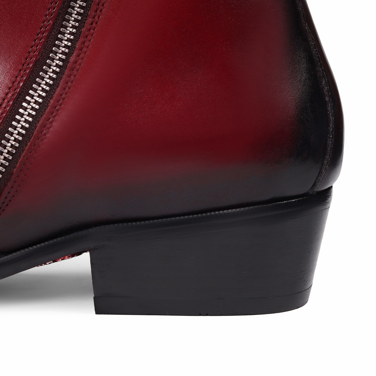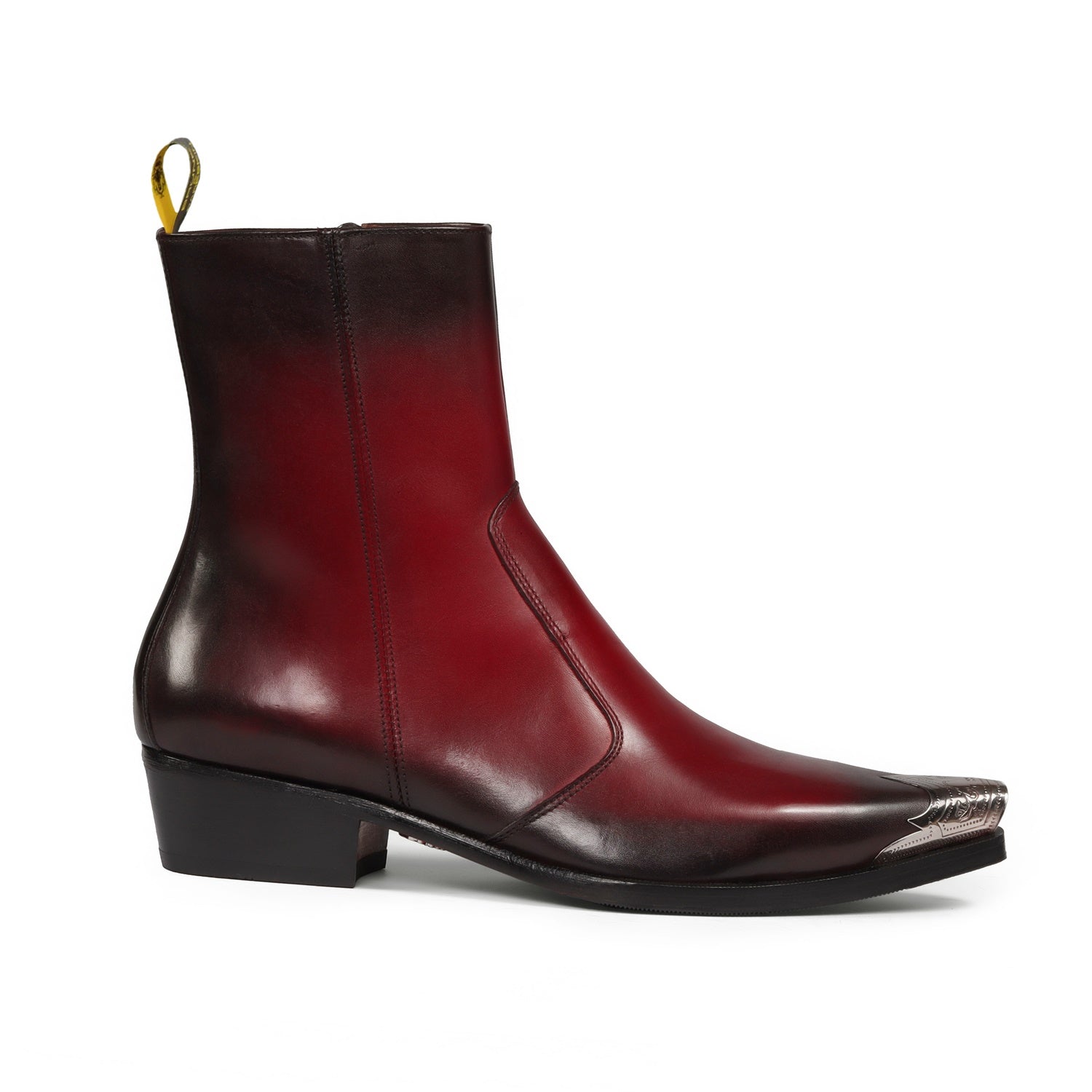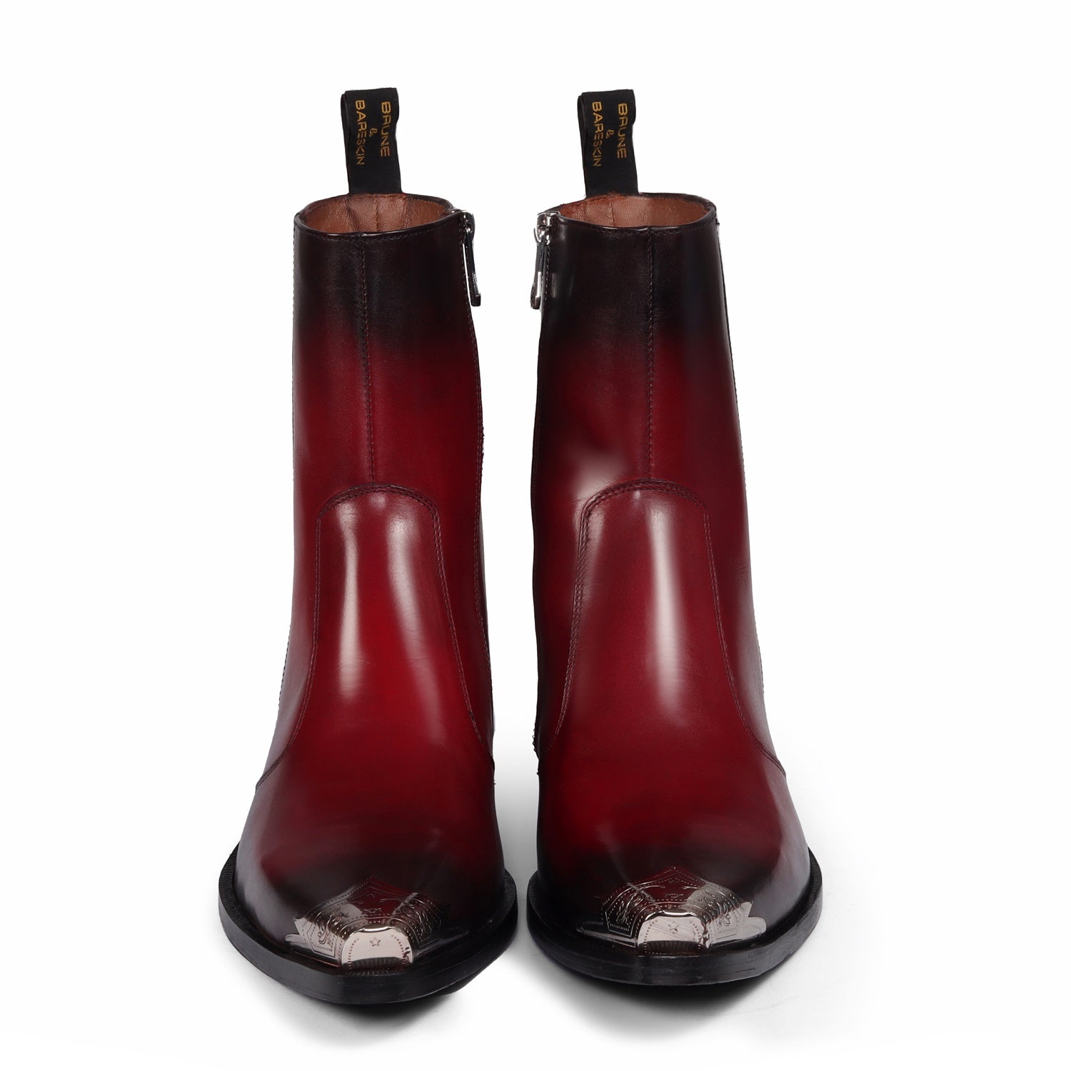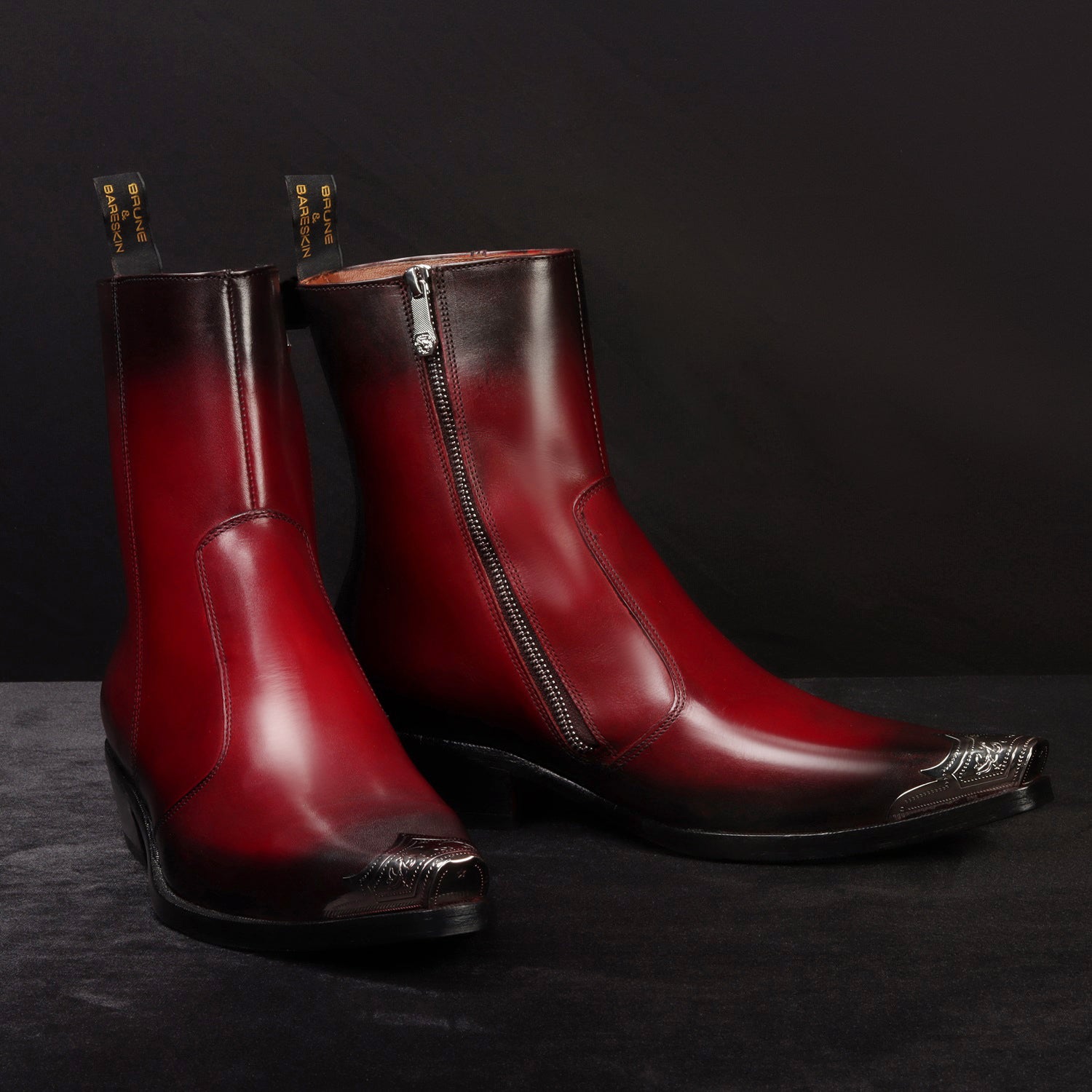 Step into style with our Metallic Cap Toe Cowboy Wine Boots. Hand crafted with premium quality full grain leather, these men's high ankle boots feature a unique patina finish and stitched detailing for a classic cow boy style.