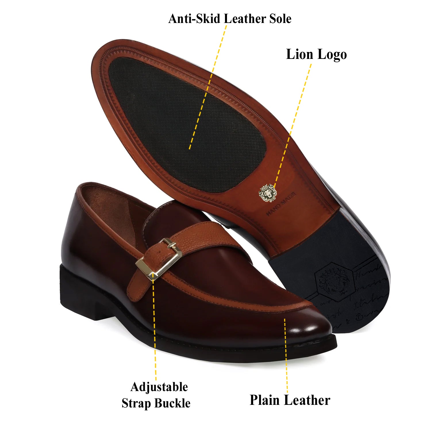 Single Monk Dark Brown Leather Contrasting Tan Apron Toe Buckle Strap Slip-On Shoe By Brune & Bareskin