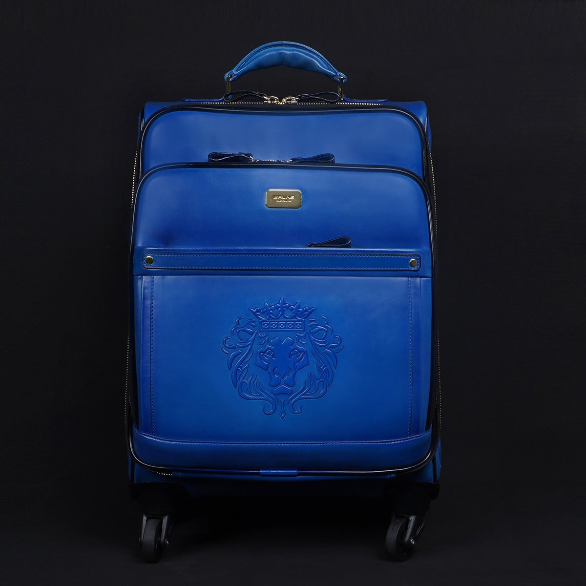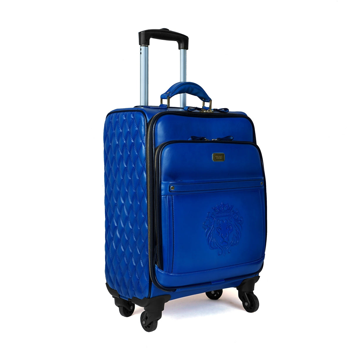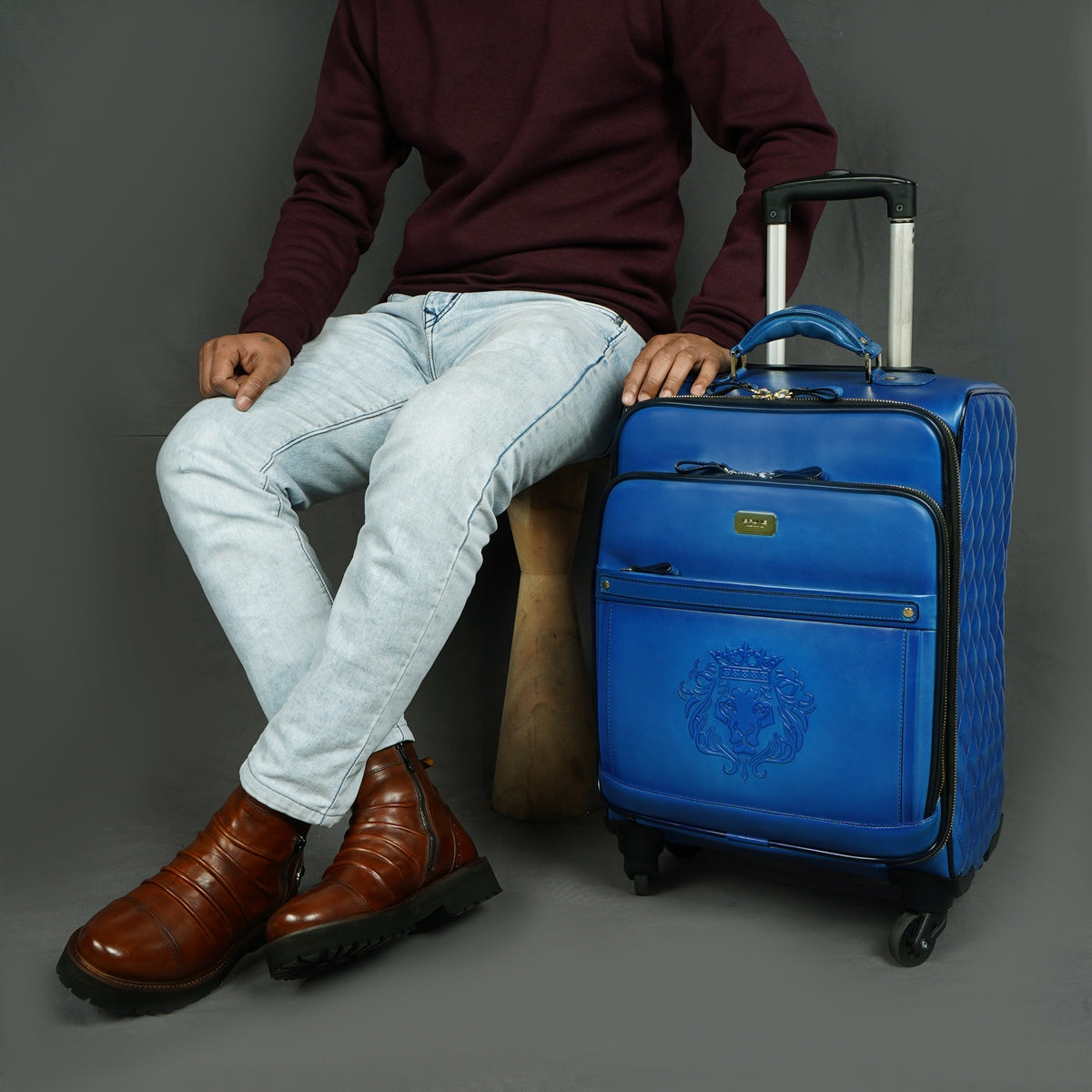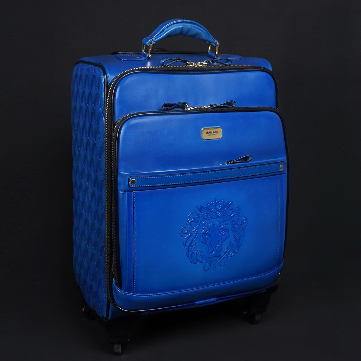 Sky Blue Leather Diamond Stitched Quad Wheel Trolley Bag With Embossed Lion Logo By Brune & Bareskin