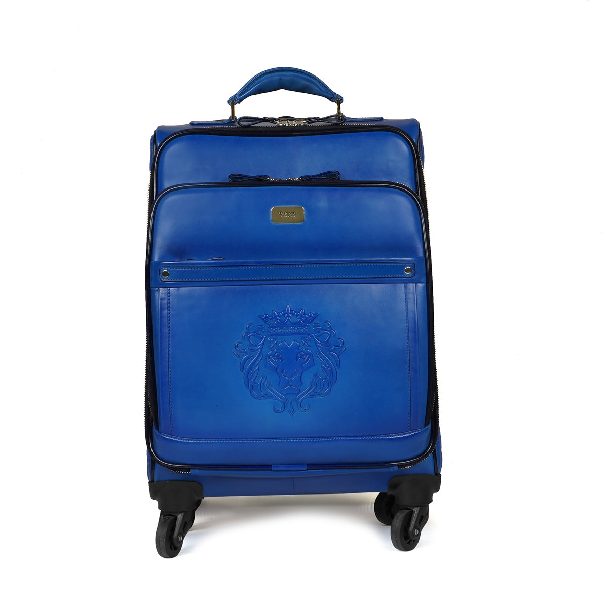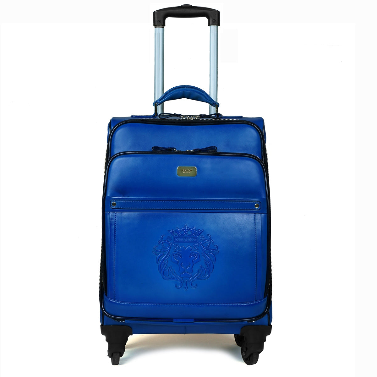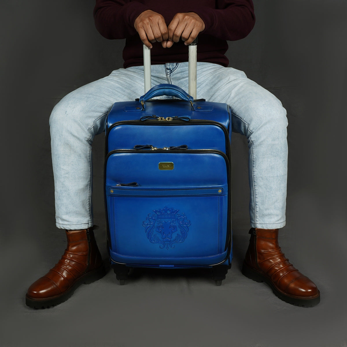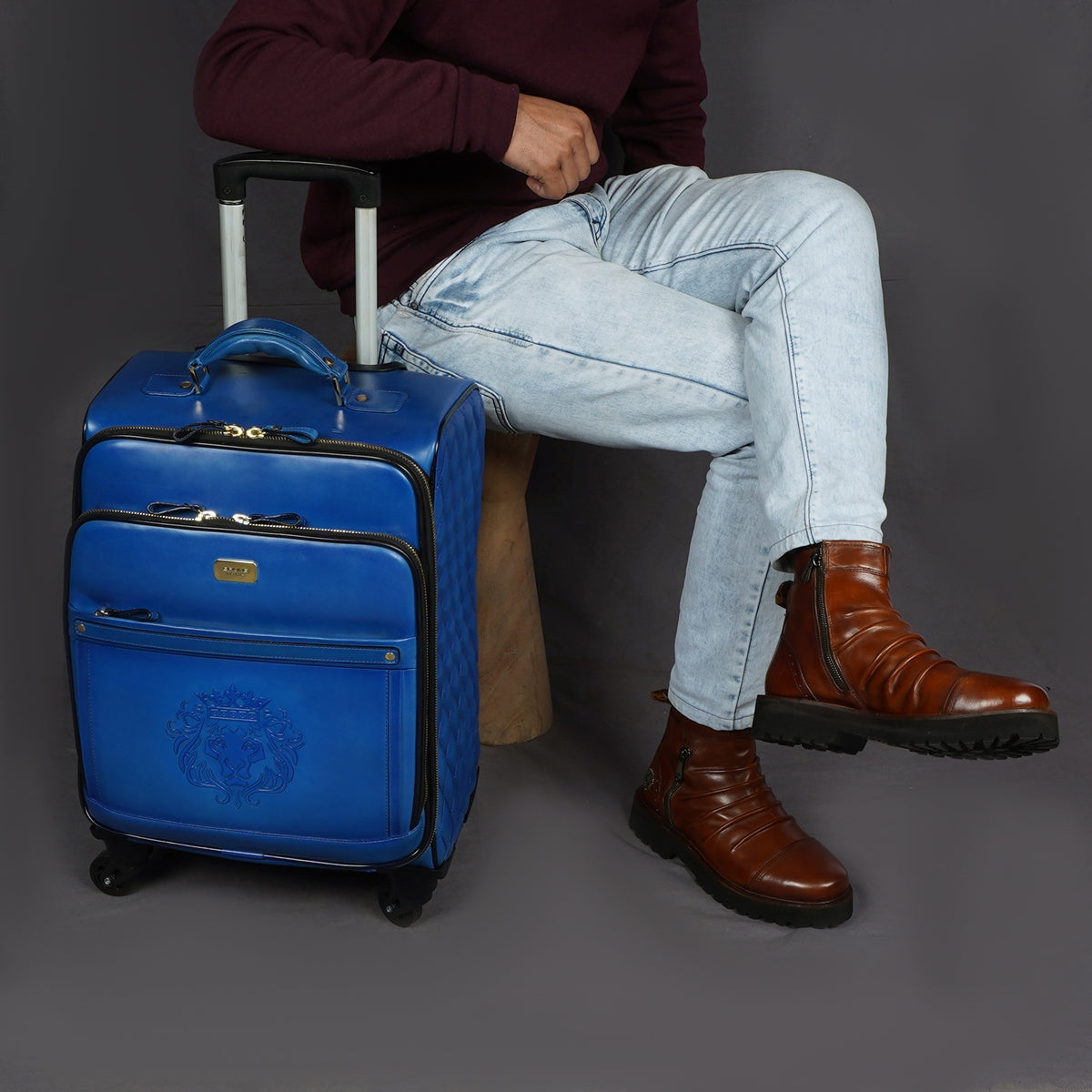 Sky Blue Leather Diamond Stitched Quad Wheel Trolley Bag With Embossed Lion Logo By Brune & Bareskin