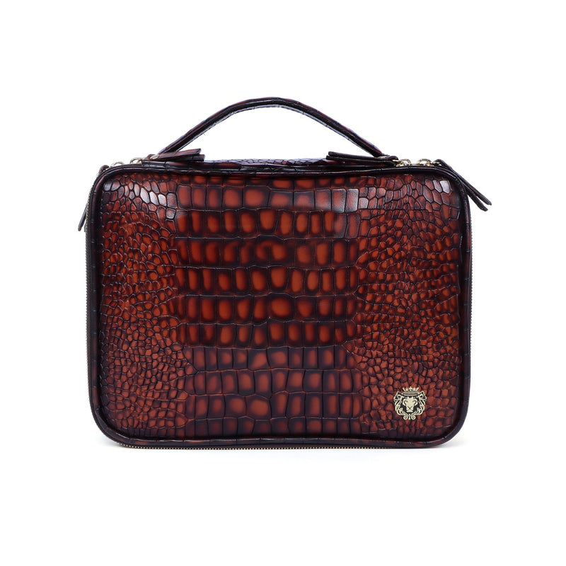 This Double Compartment Kit Bag in Sky Blue Leather is a perfect travel essential for your adventures. This exquisite handcrafted bag is made with the finest Smokey finish tan deep cut croco textured leather detailing, enhanced with a hand-painted patina technique. With spacious pockets and wide opening, the bag offers dual zip compartments and elastic holders with mesh pockets to securely carry all your essentials. Plus, you can customize it with your name initials to match your other travel bags. This kit bag is the perfect accessory for your travel duffle, backpacks and trolleys.