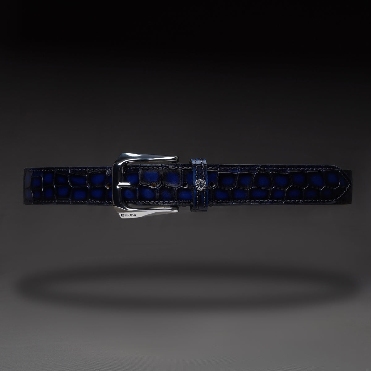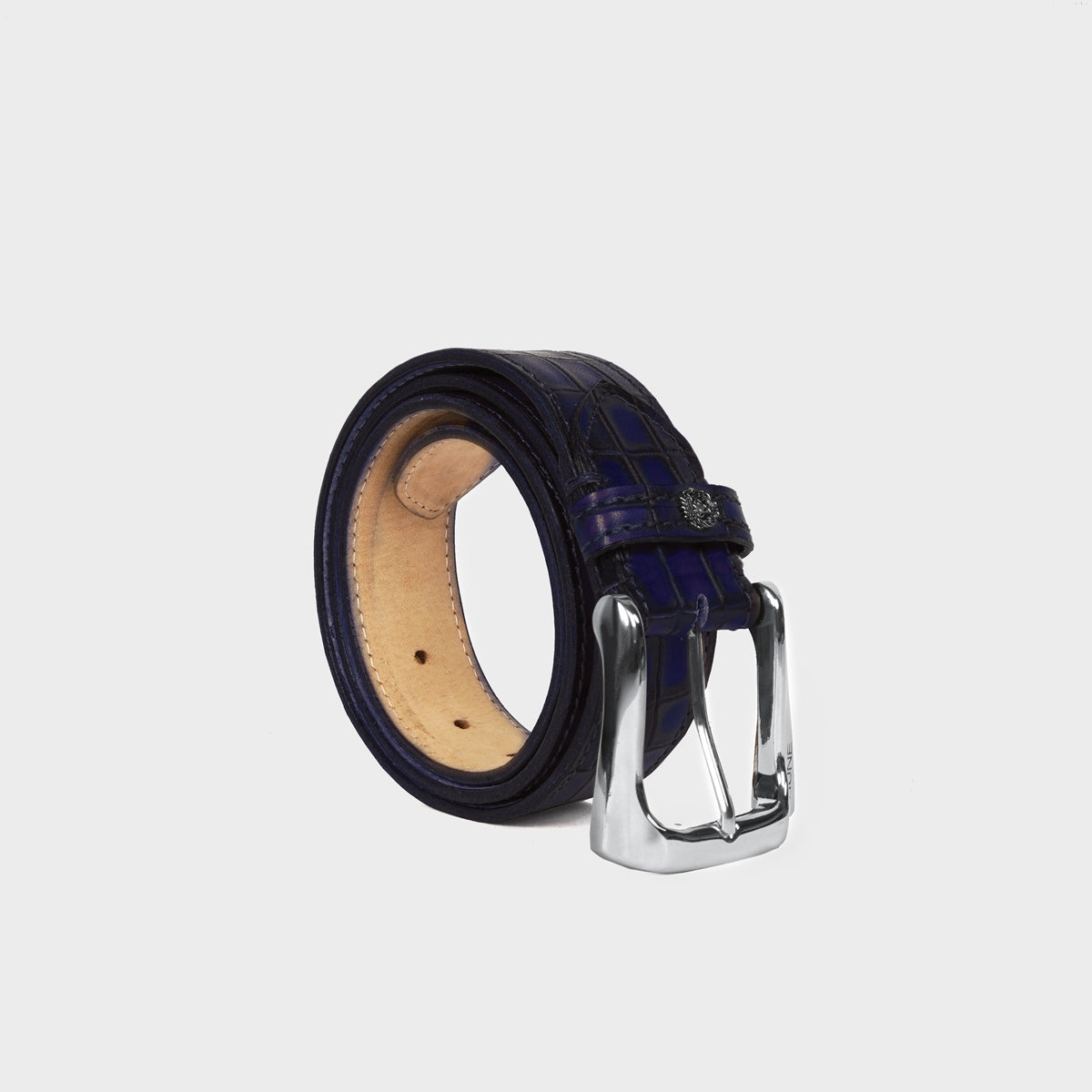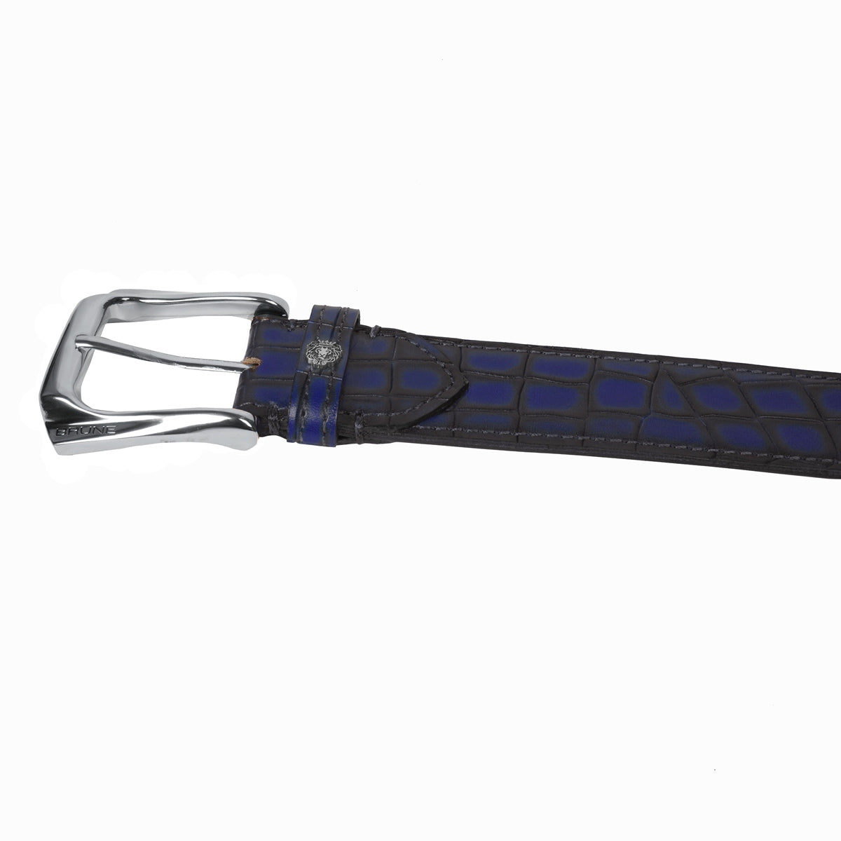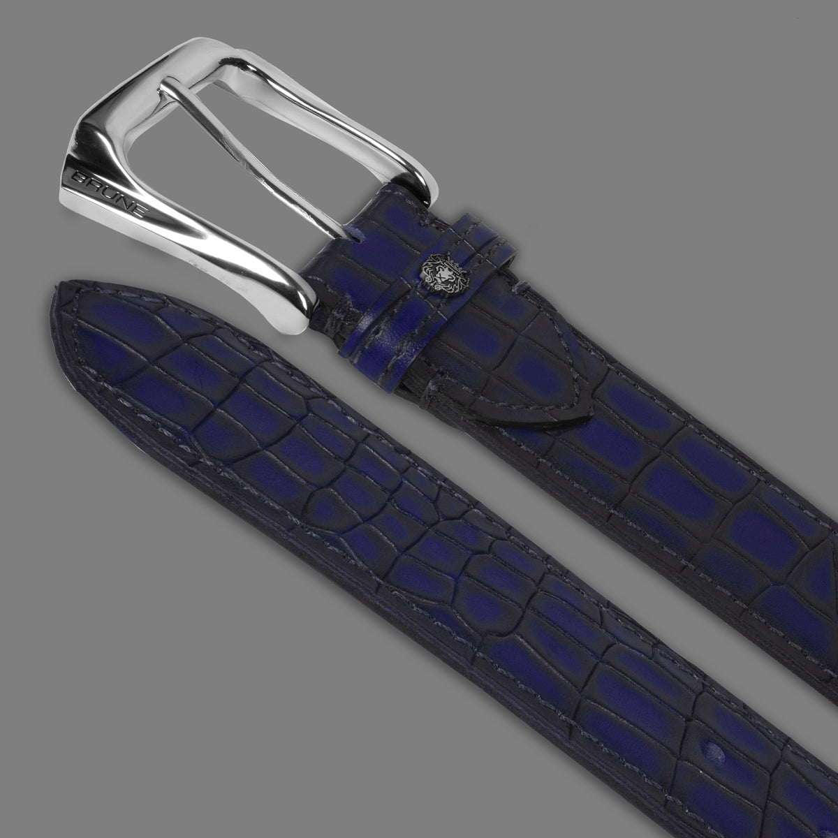 This Deep cut croco textured Smokey blue Hand Crafted Leather Formal belt for men ensures to keep you in comfort all day long. The artistic Smokey finish is achieved by our artisans with hand painting using the patina regime. The Stylish silver finish Mini lion logo and Slant Shape buckle enhances its appearance further. This attractive belt ranks high on the latest Formal style to offer you well-deserved popularity. The silver finished buckle compliment its overall look. It can easily be teamed up with our croco textured leather jackets, shoes and other accessories. You can get it customized in your favorite color, shade with Name initials.