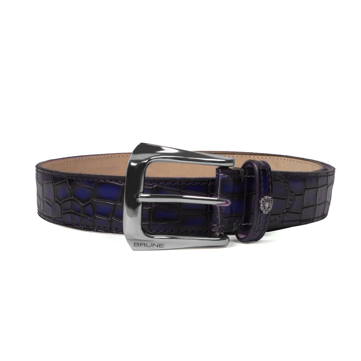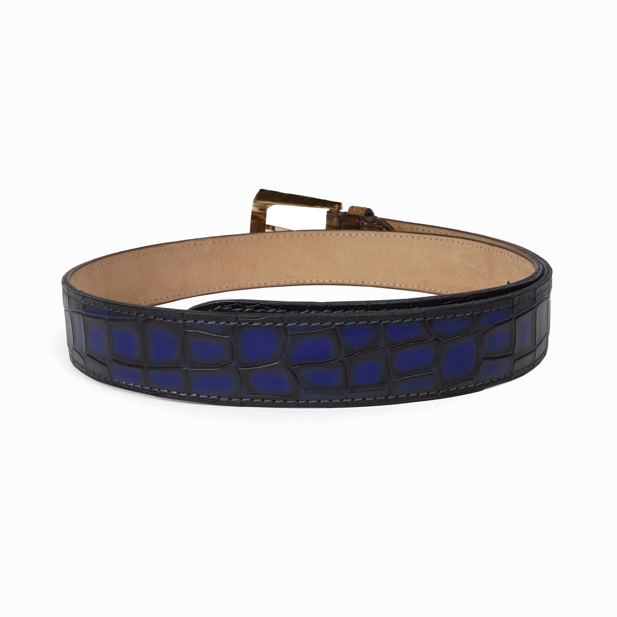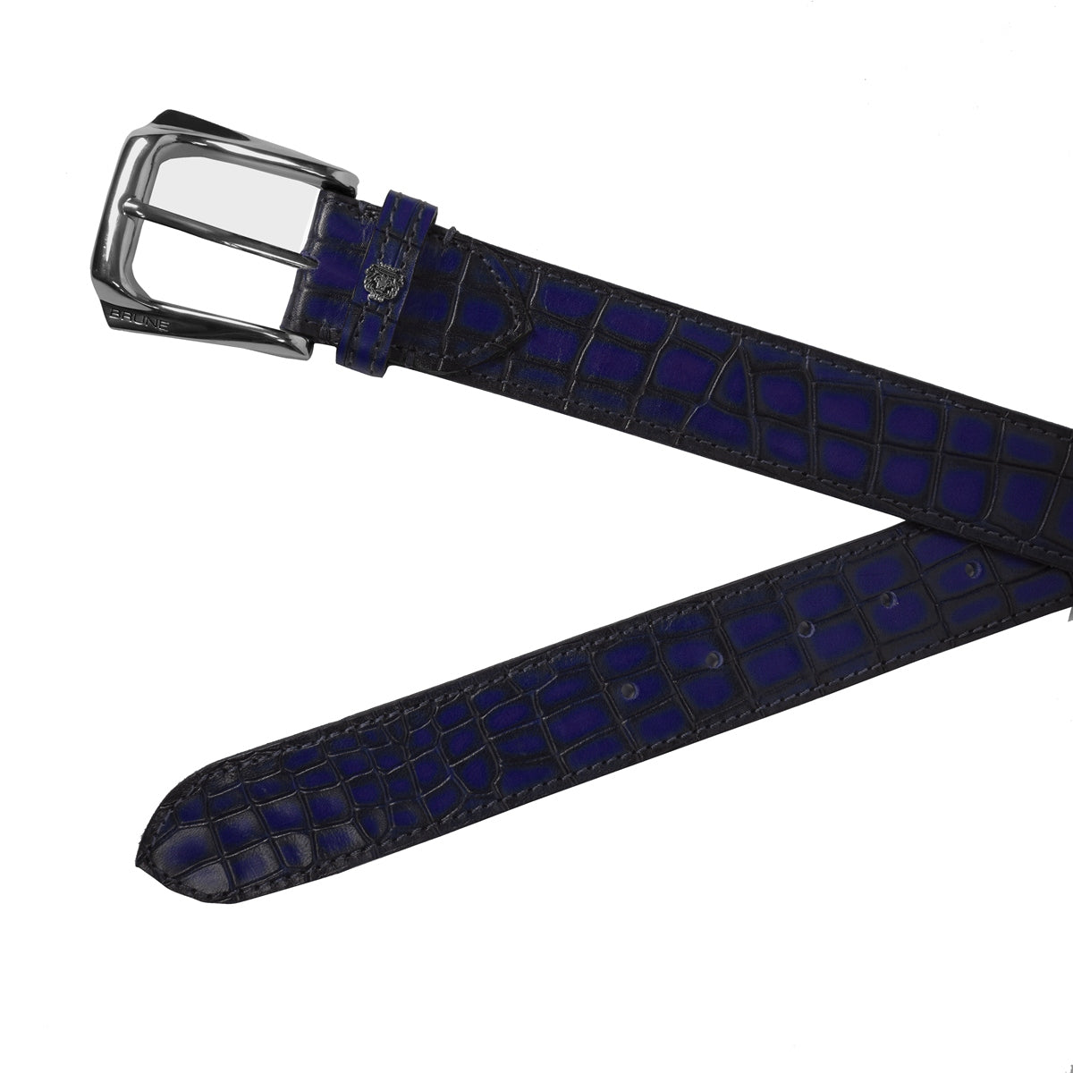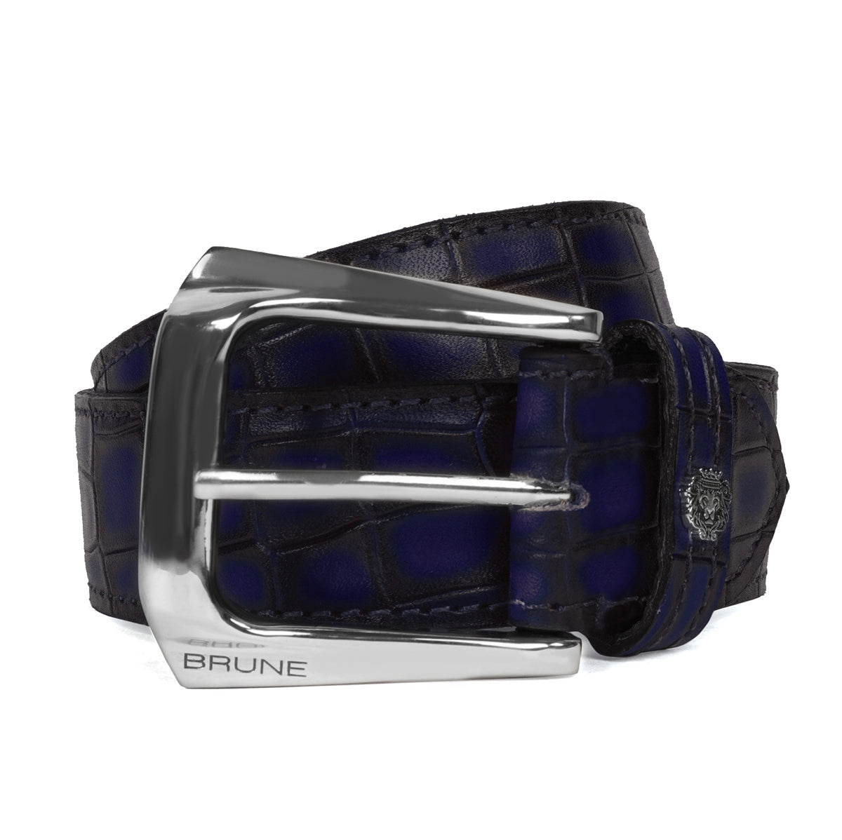 This Deep cut croco textured Smokey blue Hand Crafted Leather Formal belt for men ensures to keep you in comfort all day long. The artistic Smokey finish is achieved by our artisans with hand painting using the patina regime. The Stylish silver finish Mini lion logo and Slant Shape buckle enhances its appearance further. This attractive belt ranks high on the latest Formal style to offer you well-deserved popularity. The silver finished buckle compliment its overall look. It can easily be teamed up with our croco textured leather jackets, shoes and other accessories. You can get it customized in your favorite color, shade with Name initials.