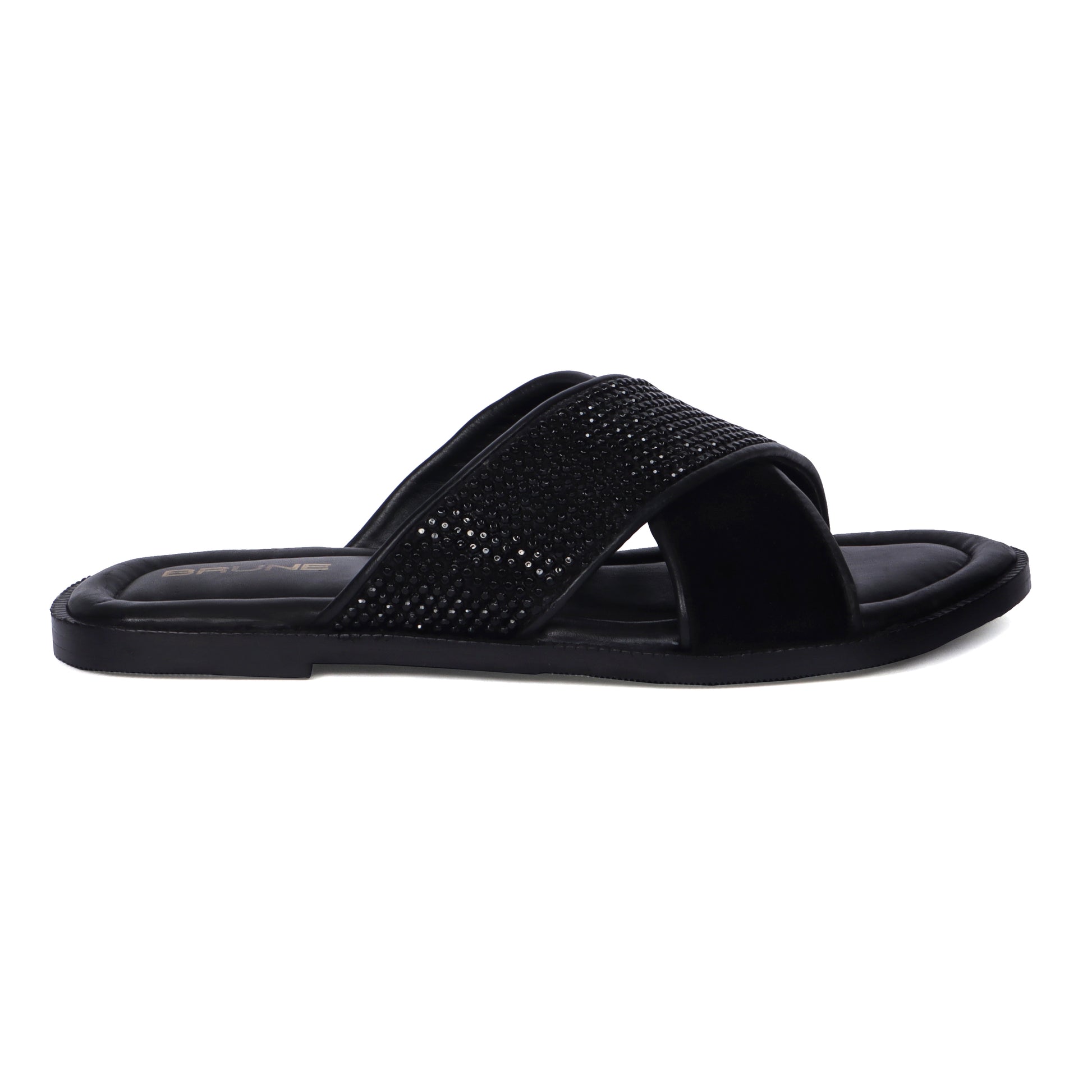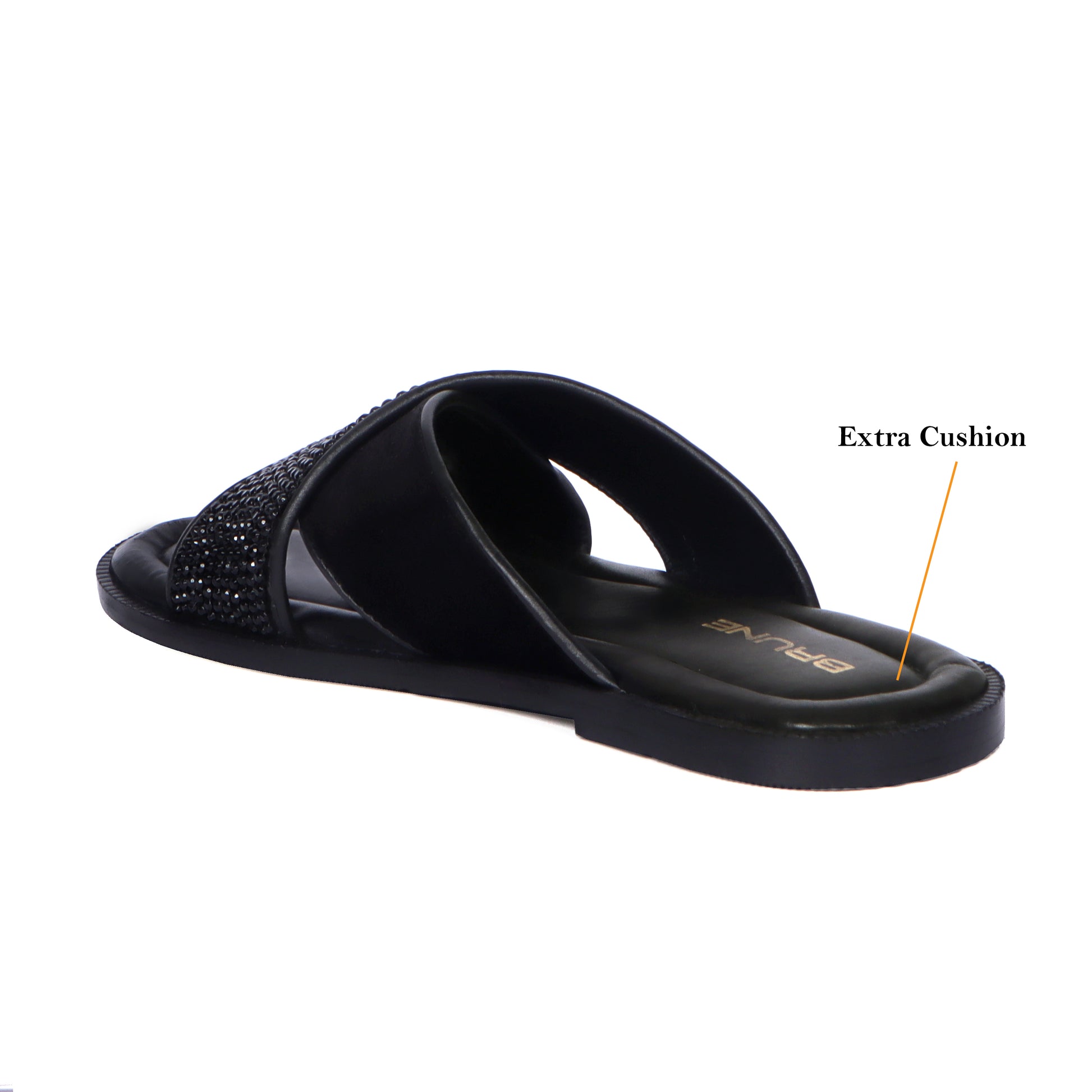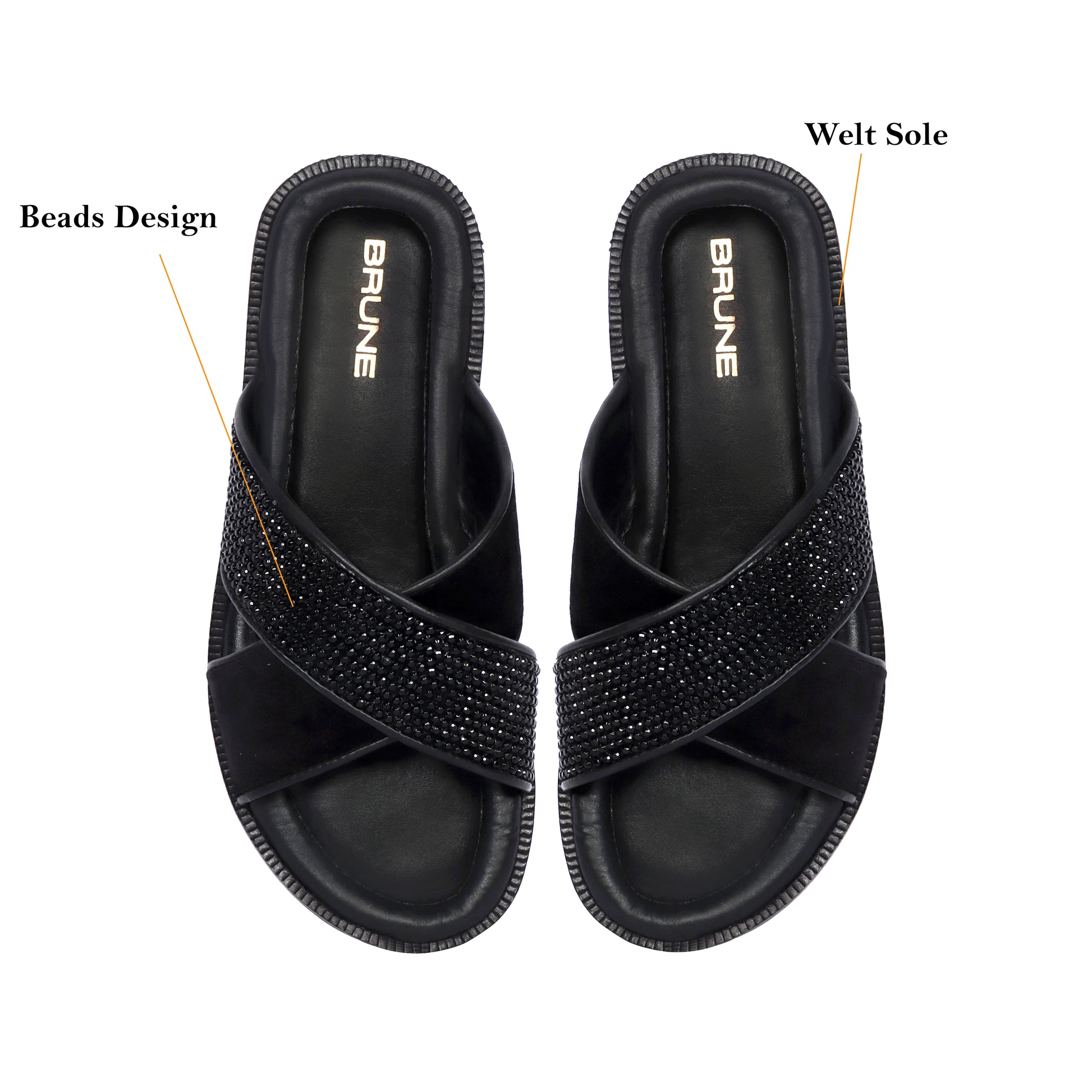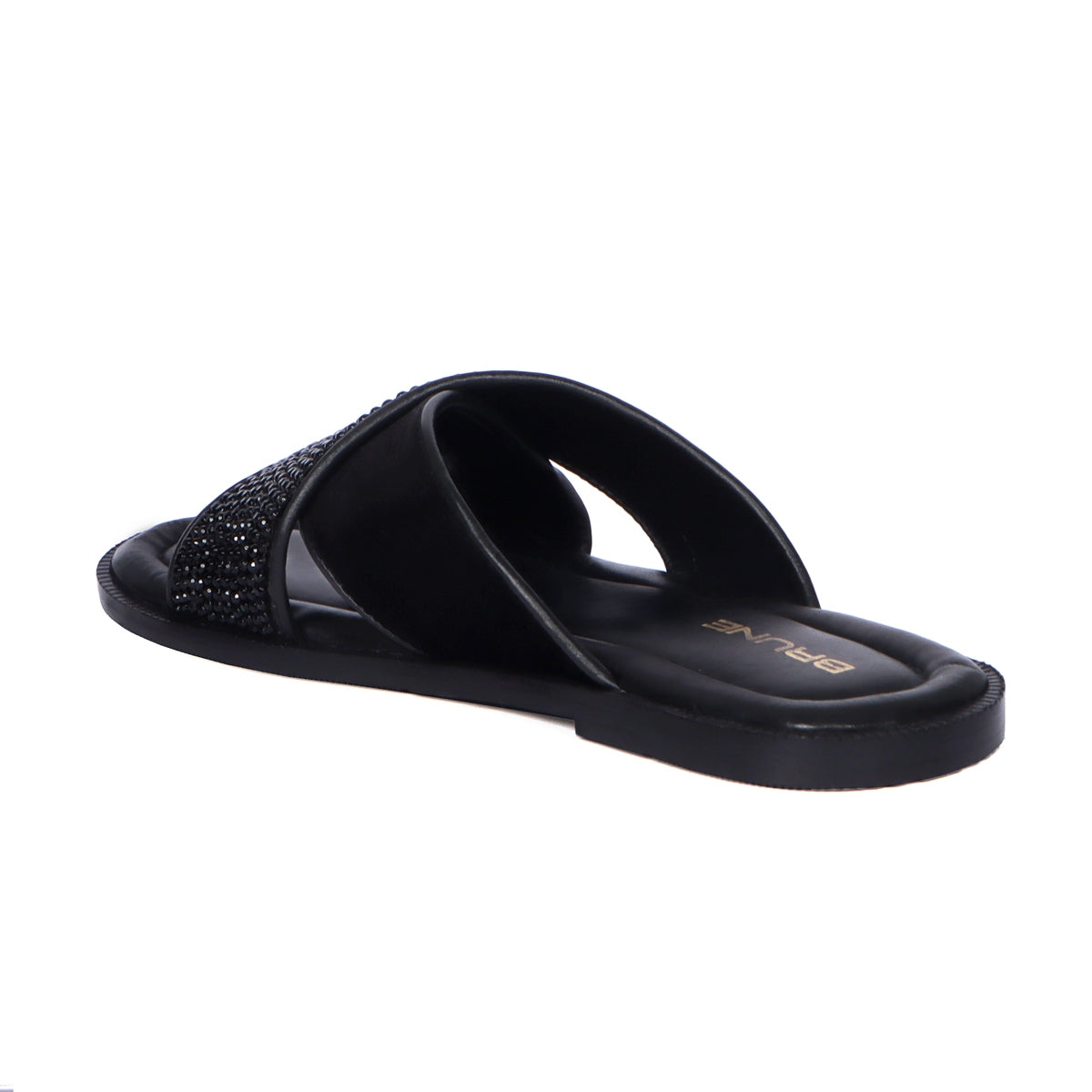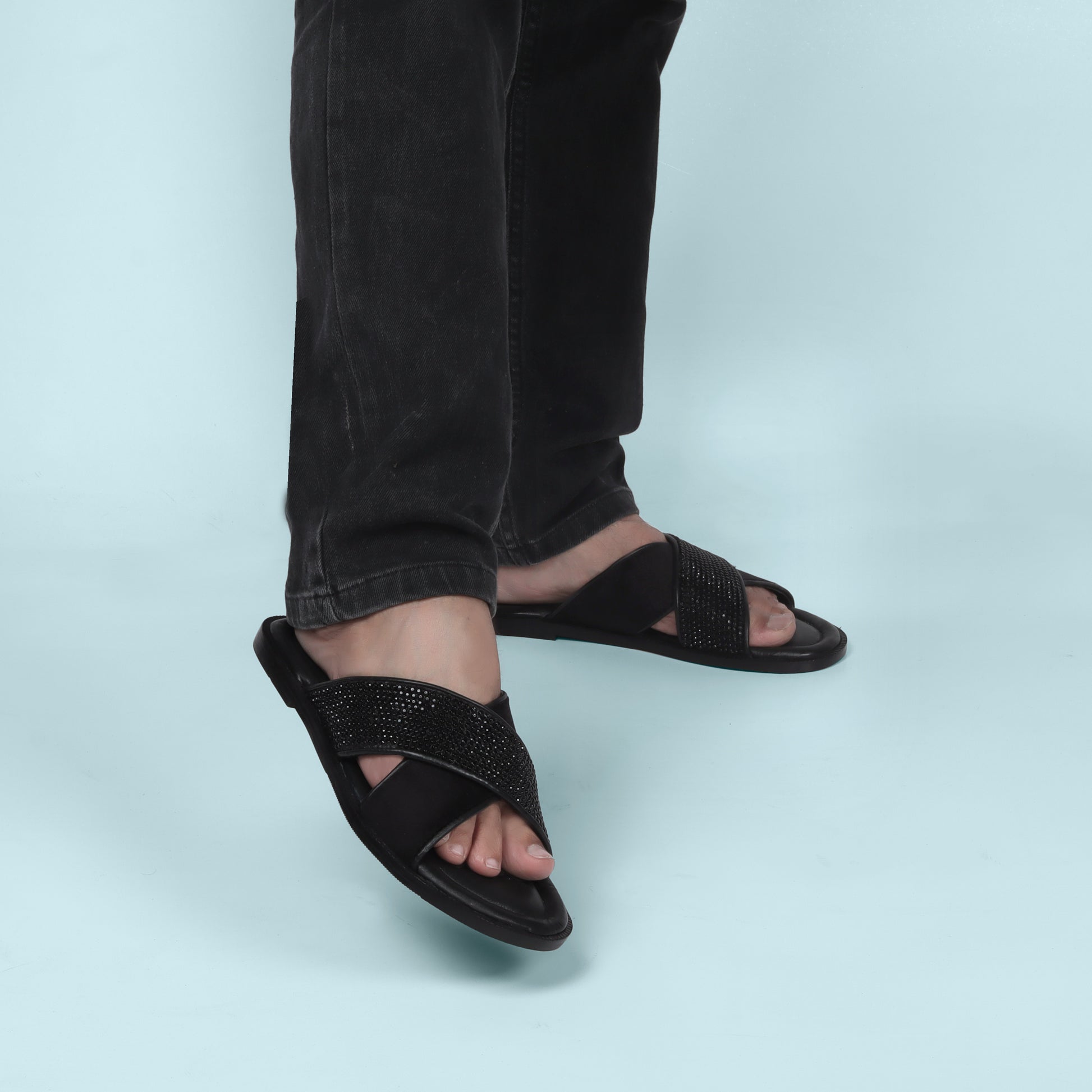 Slide in Slipper Wide Crossover Strapped Embellished Black Leather
