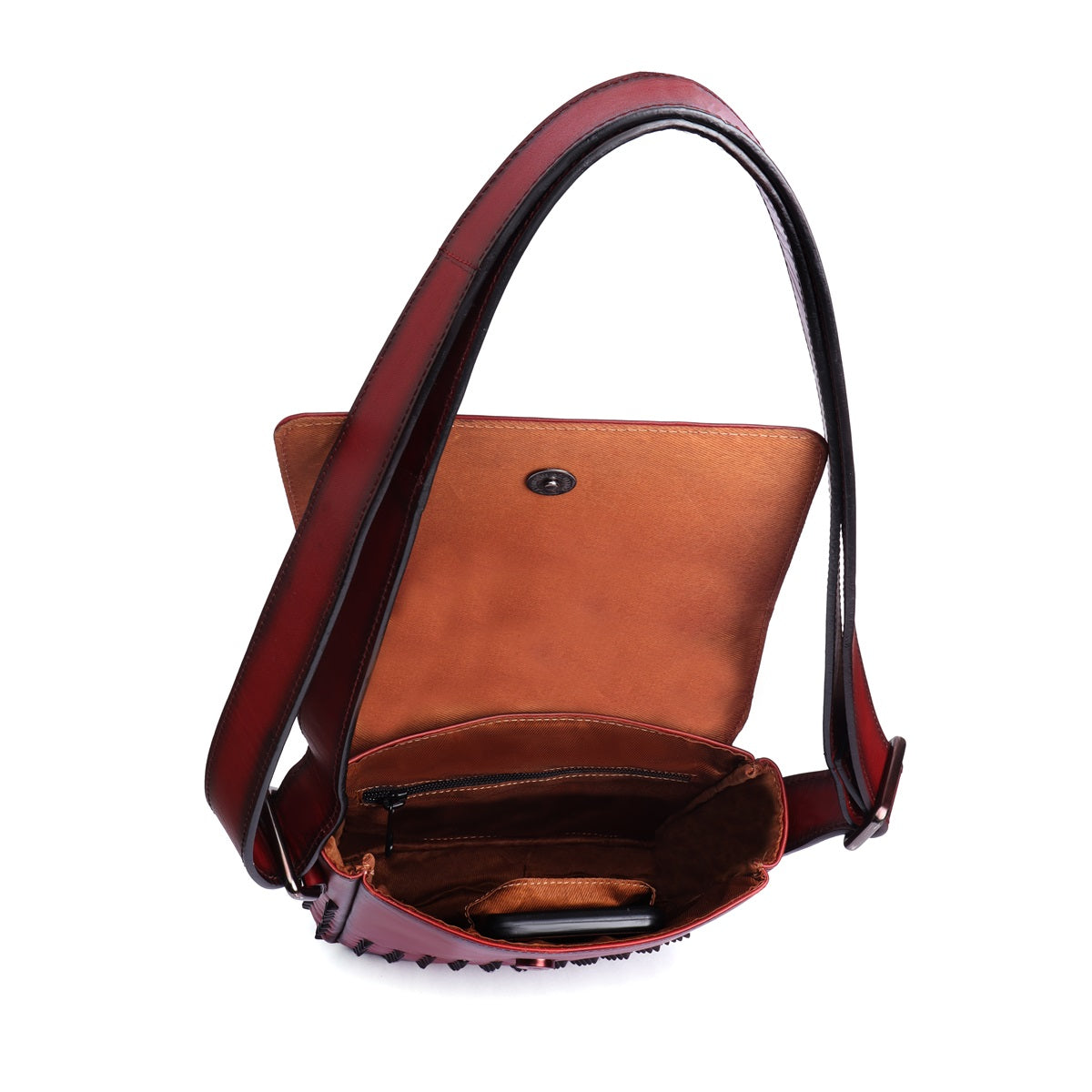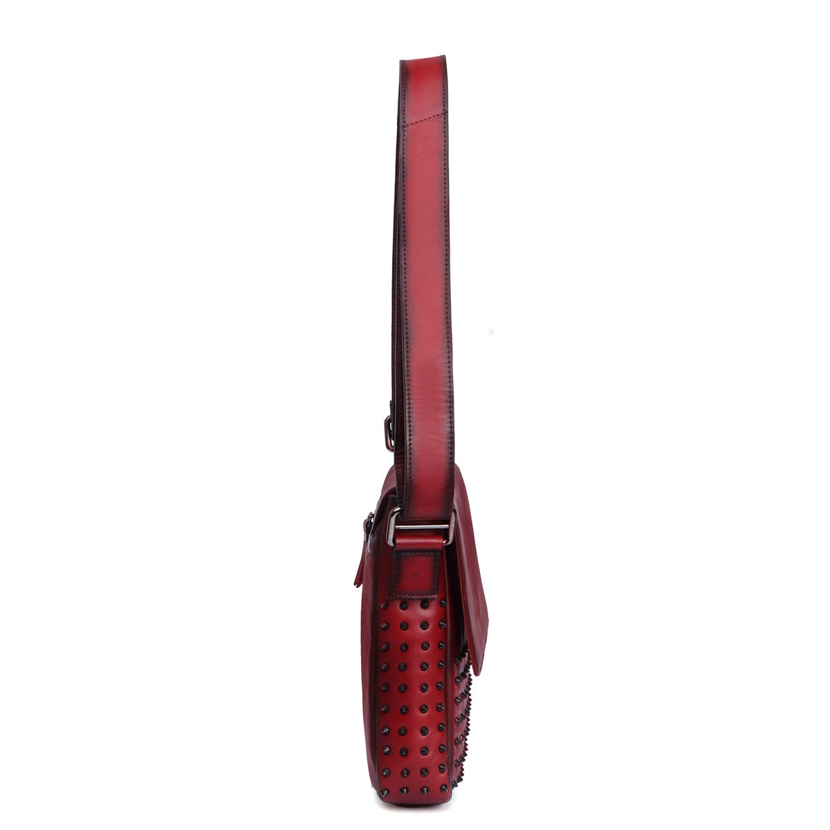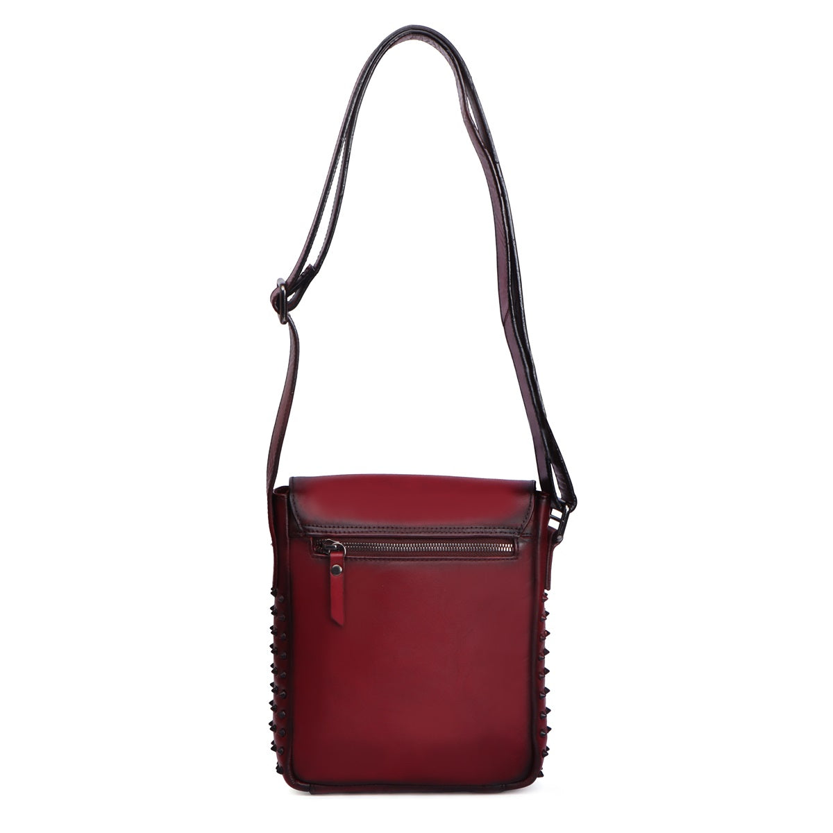 Sling Flap Over Black Studded Crossbody Wine Leather Bag