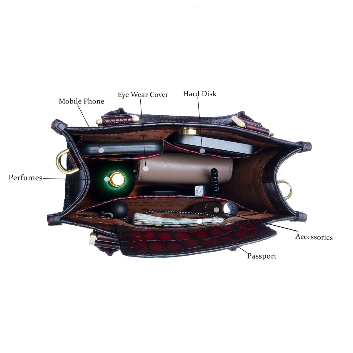 This small sized smoky wine deep cut croco leather women bag is one of the most easiest to carry along with spacious space. This small sized leather hand bag looks very elegant. This trendsetter deep cut leather bag with embossed lion logo on the front looks astonishing. It is perfect for a travel. The ample space allows it to carry for travelling. The main button compartment provides the extra security to it. This bag is quite very handy for the traveler's as well. It provides the easy access to the needy essentials. Stylish look makes it an eye catching accessory. This Ladies Hand Bag for the modern entrepreneur, stylish in appearance with its Size its gonna be an eye stopper. 100% pure genuine deep cut textured leather is used for making your style. This hand bag can be personalized with your name initials in any color shade and in any size with our bespoke services.