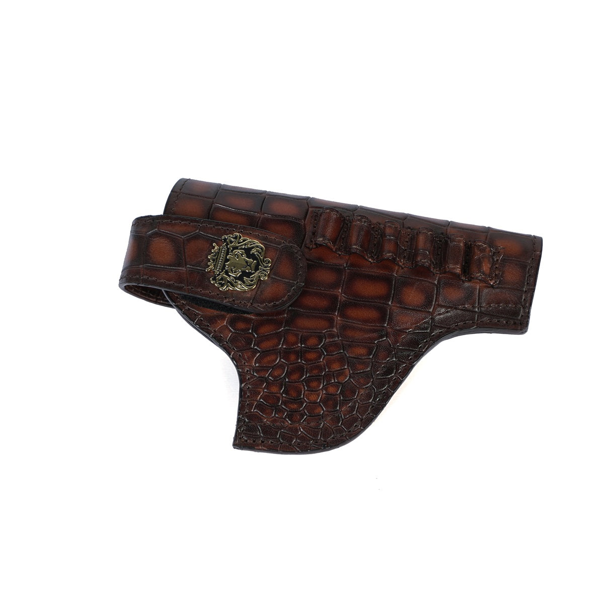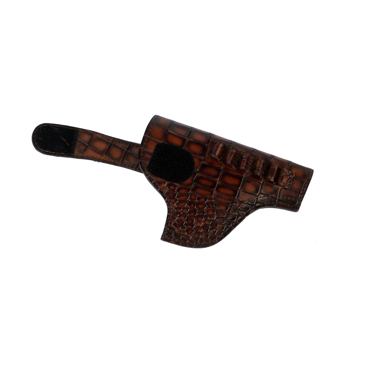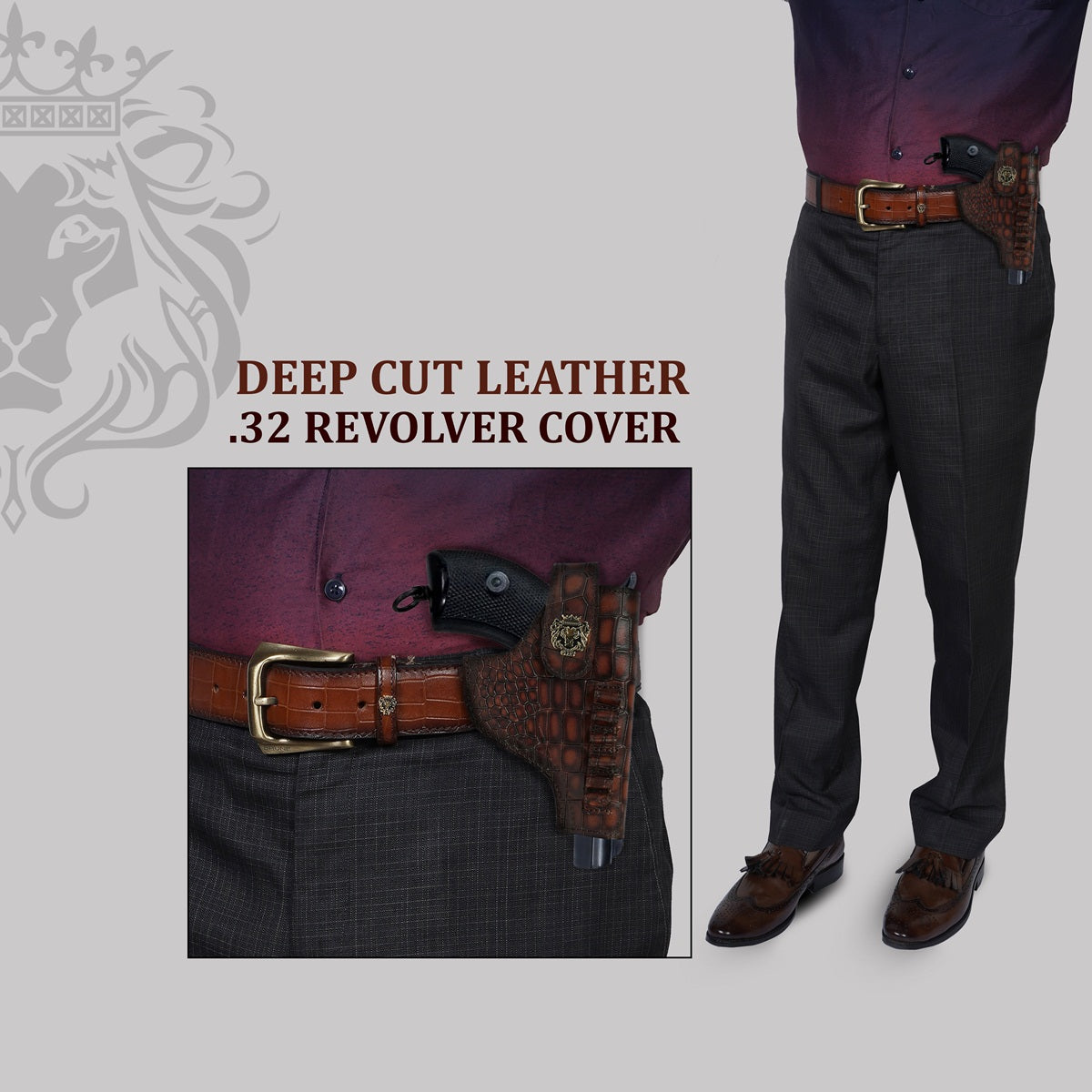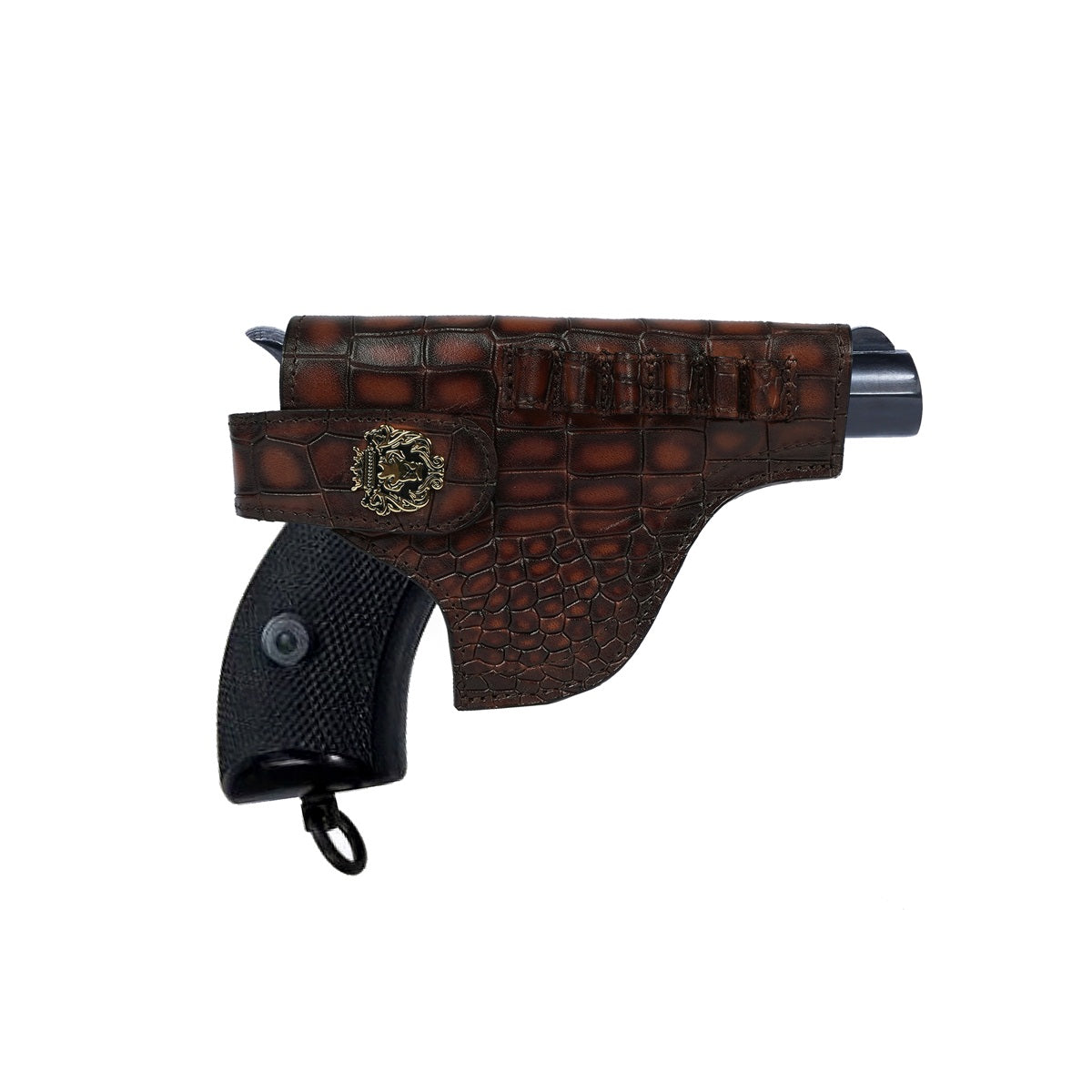 It's super stylish & elegant revolver cover by BRUNE & BARESKIN. Made of deep cut croco textured leather in smokey finish cognac color. This particular SKU is specific to .32 revolver. Indian or imported . Fits perfect on WEBLEY and Indian ordinance revolver. Deep Cut Leather Bullet's holders are crafted to provide the easy access to the bullets & hold them safely. Brune & Bareskin's signature metal lion logo on wide Velcro strap is added to enhance the elegance further. It gives classy look to a person when some one holds it. These can be customized to any size weapon .22, .32, .38, 9mm and .45 revolver. We offer name Initials and other personalization like color change , laser engraving of logos or slogans. For this please write to us by choosing the "customization tab"