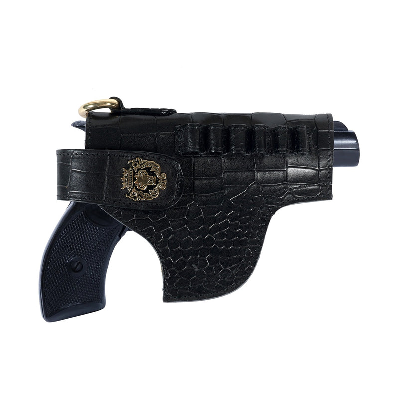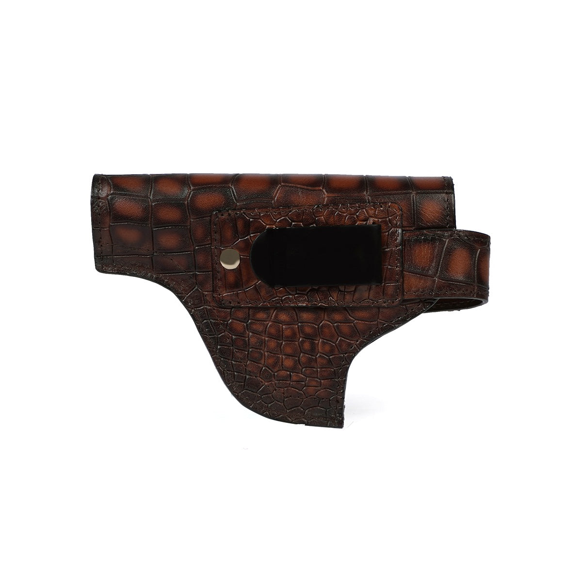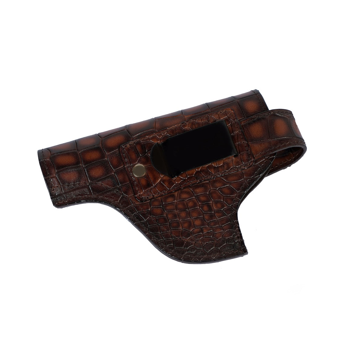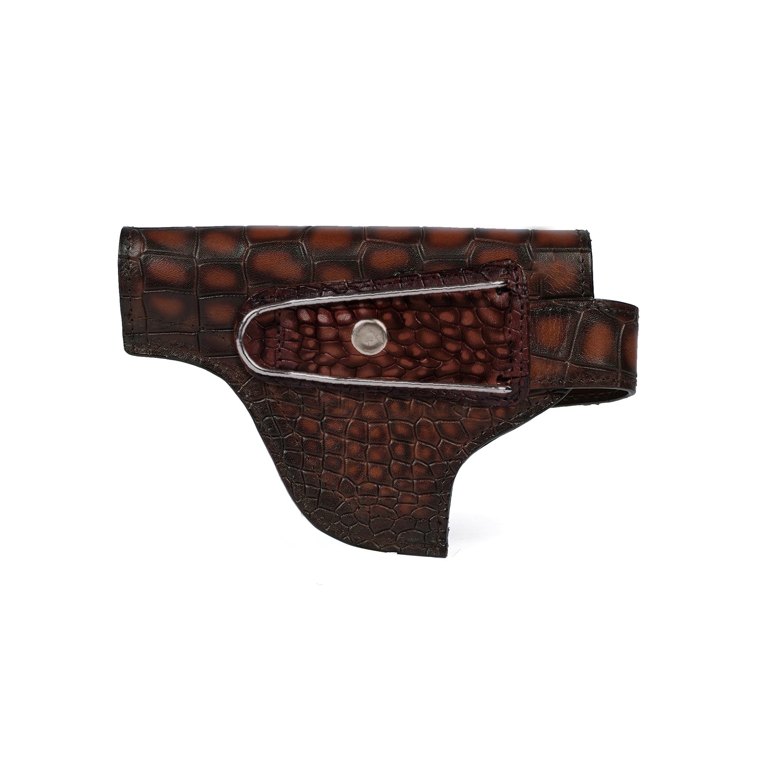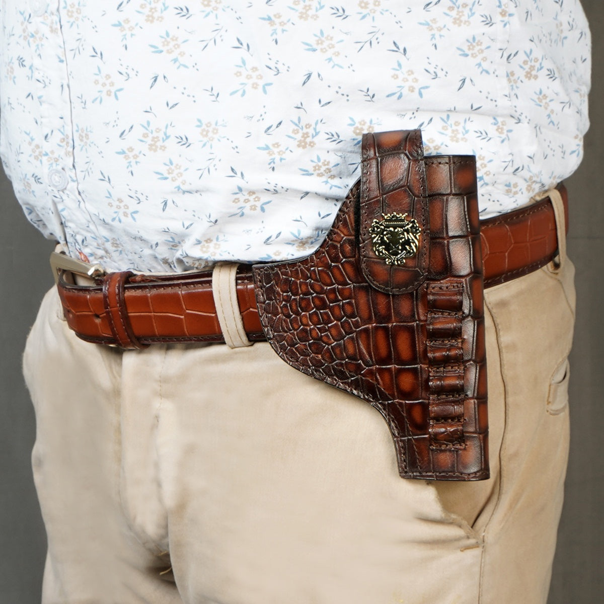 It's super stylish & elegant revolver cover by BRUNE & BARESKIN. Made of deep cut croco textured leather in smokey finish cognac color. This particular SKU is specific to .32 revolver. Indian or imported . Fits perfect on WEBLEY and Indian ordinance revolver. Deep Cut Leather Bullet's holders are crafted to provide the easy access to the bullets & hold them safely. Brune & Bareskin's signature metal lion logo on wide Velcro strap is added to enhance the elegance further. It gives classy look to a person when some one holds it. These can be customized to any size weapon .22, .32, .38, 9mm and .45 revolver. We offer name Initials and other personalization like color change , laser engraving of logos or slogans. For this please write to us by choosing the "customization tab"