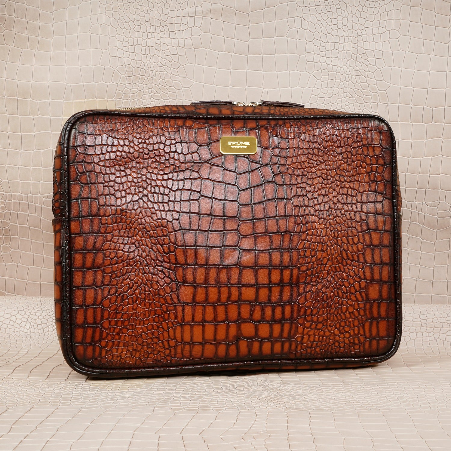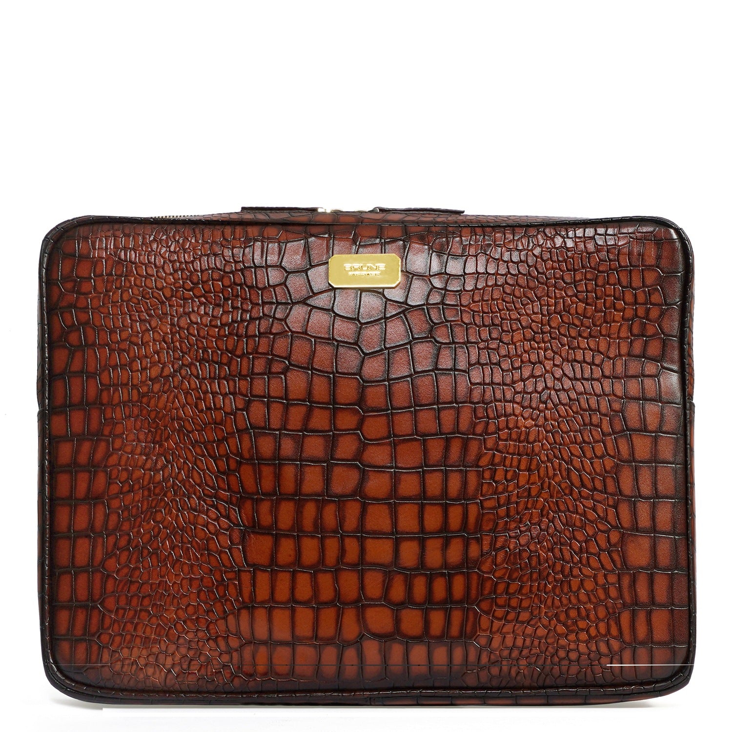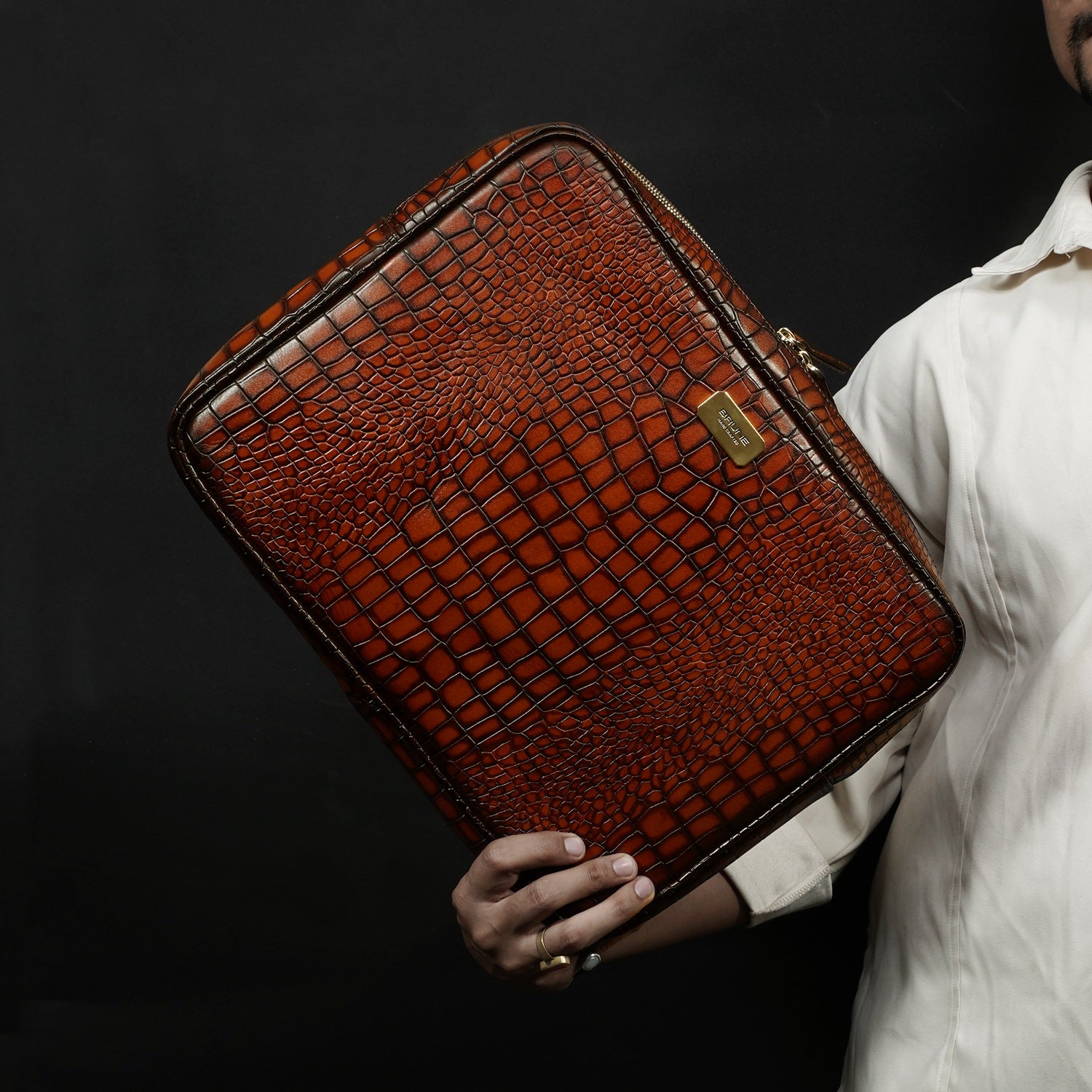 This unisex file/document holder from Brune & Bareskin is the perfect accessory for businessmen on the go. Made with Smokey finish croco textured leather, it exudes class and durability. The main zipper compartment, inside secure zipper pocket, and metal Brune plate on the front make it easy to carry everything from pens and credit cards to laptops and files. It's a must-have for stylish business executives, making it perfect for travel, meetings, and presentations. Stay organized and chic with this multi-functional holder. You can get it customized in your favorite color shade with Name Initials with our bespoke services.