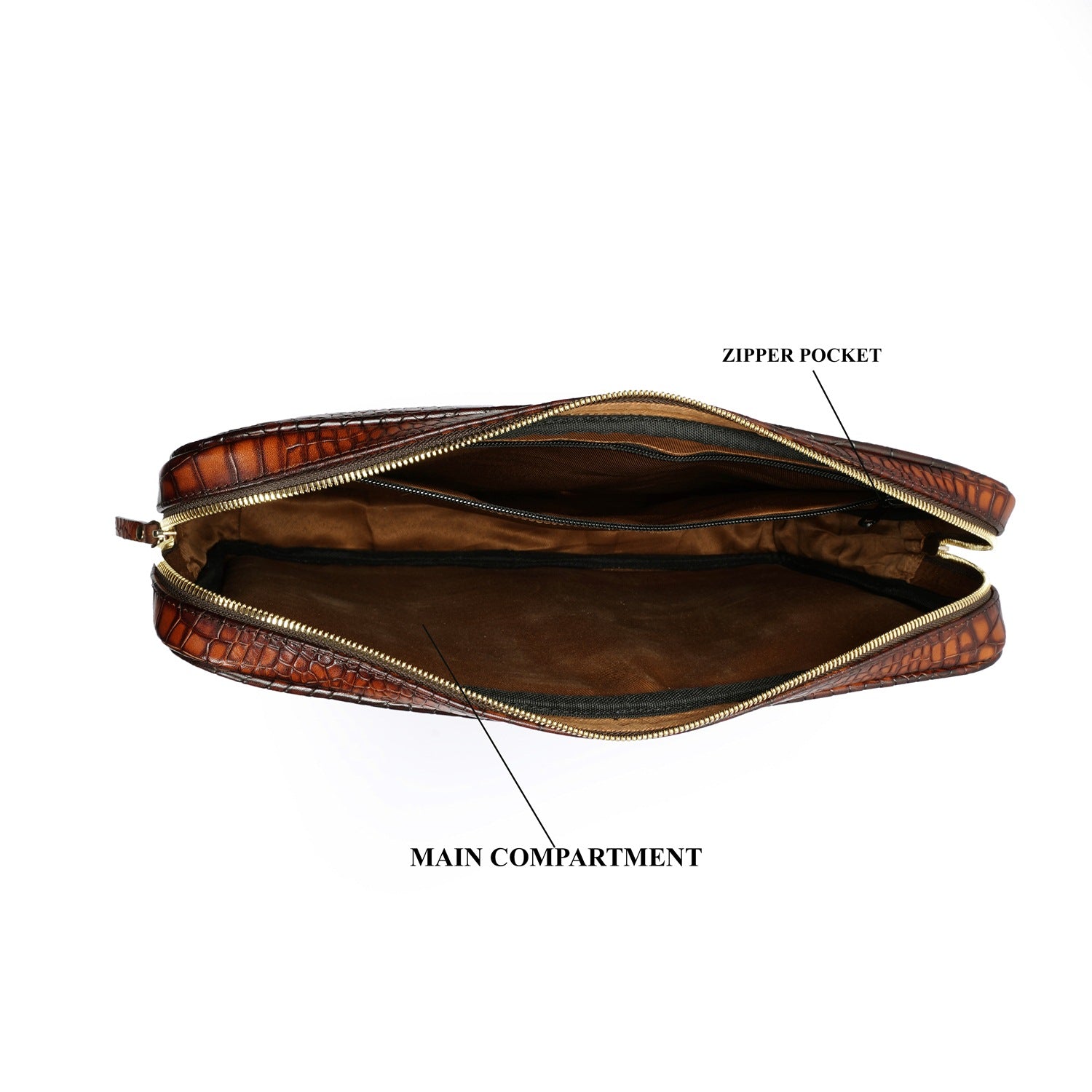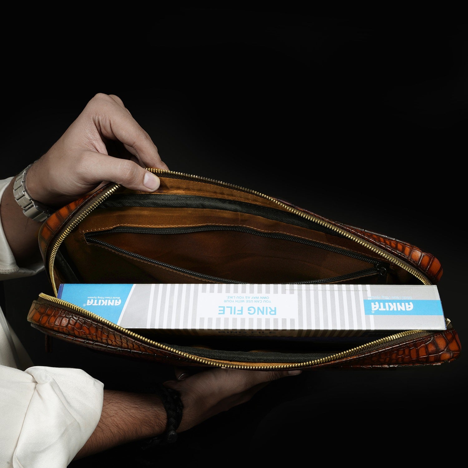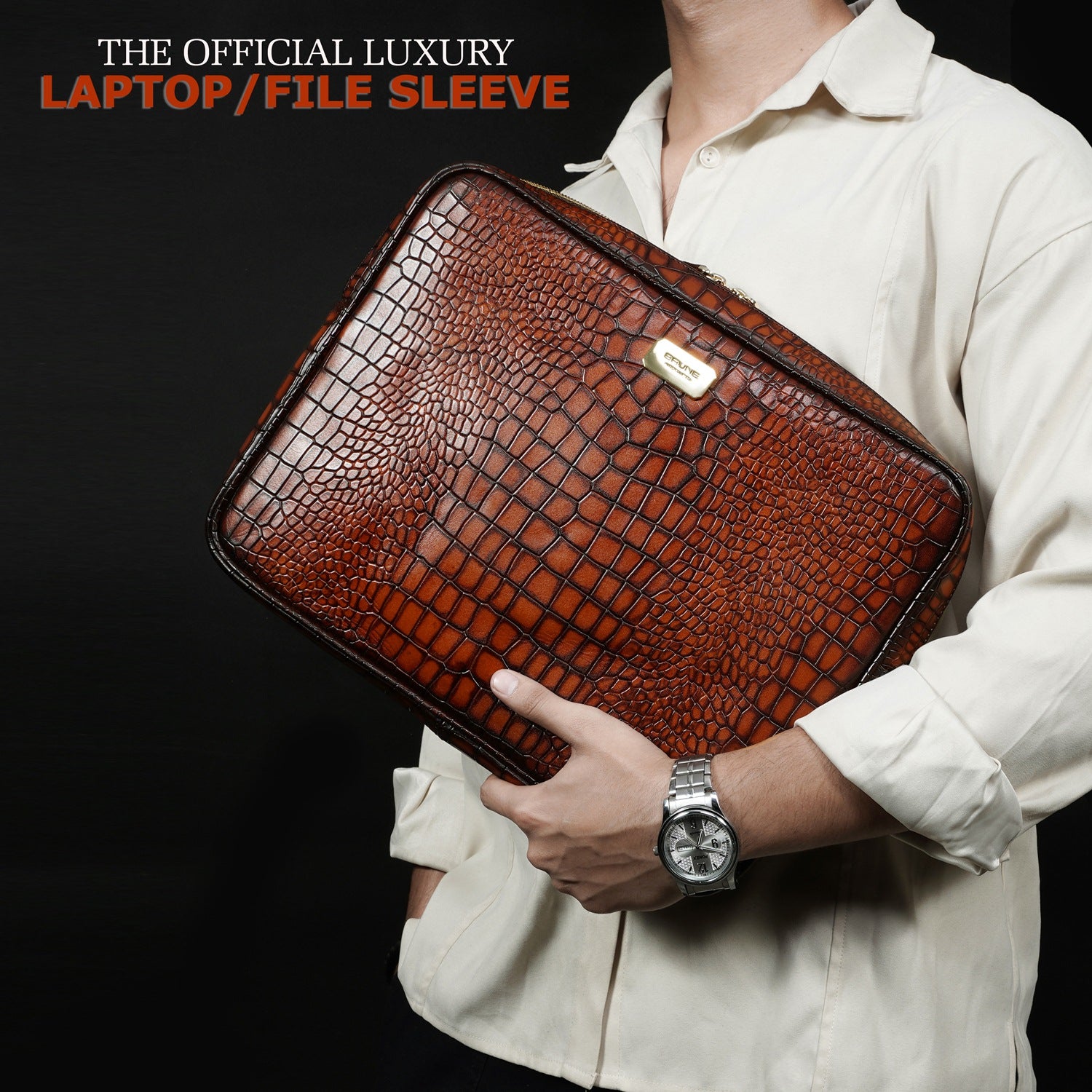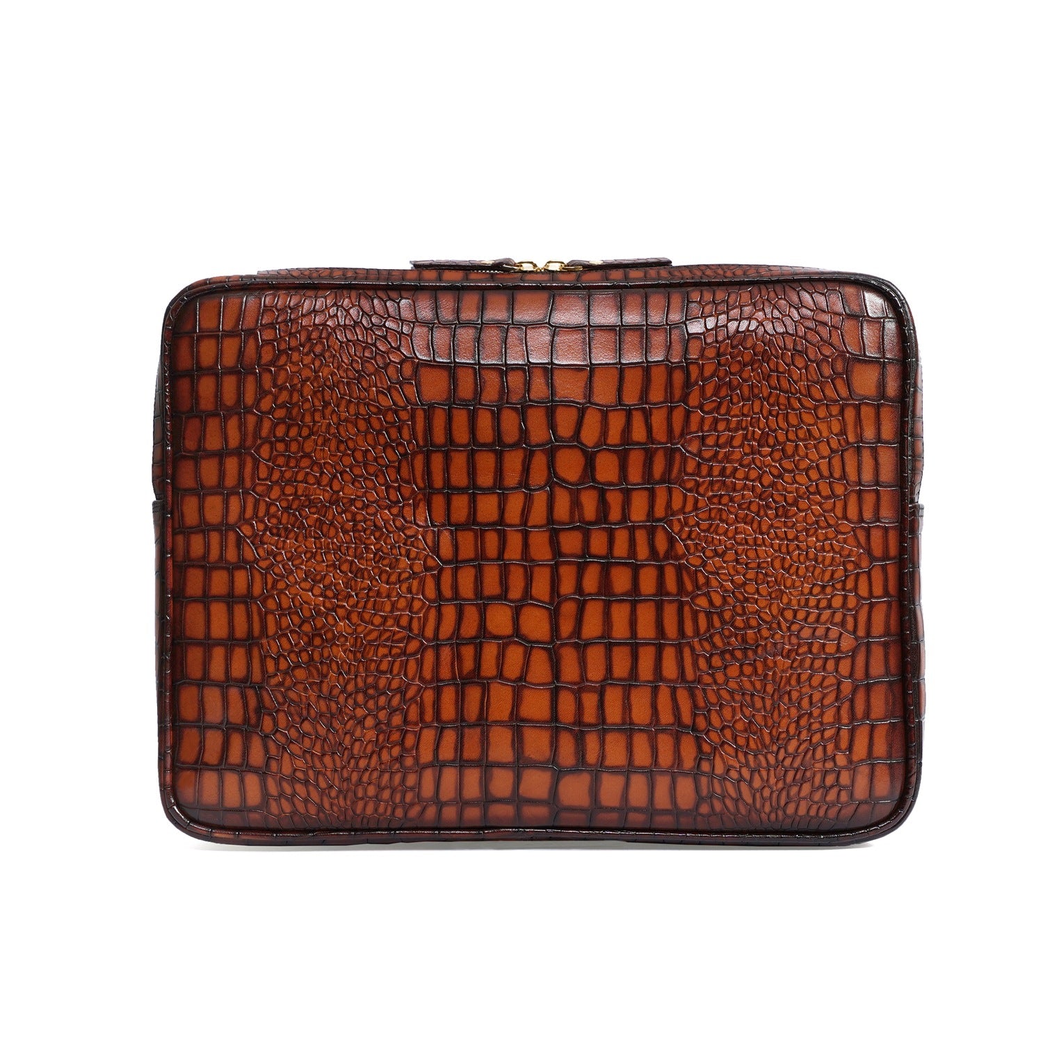 This unisex file/document holder from Brune & Bareskin is the perfect accessory for businessmen on the go. Made with Smokey finish croco textured leather, it exudes class and durability. The main zipper compartment, inside secure zipper pocket, and metal Brune plate on the front make it easy to carry everything from pens and credit cards to laptops and files. It's a must-have for stylish business executives, making it perfect for travel, meetings, and presentations. Stay organized and chic with this multi-functional holder. You can get it customized in your favorite color shade with Name Initials with our bespoke services.