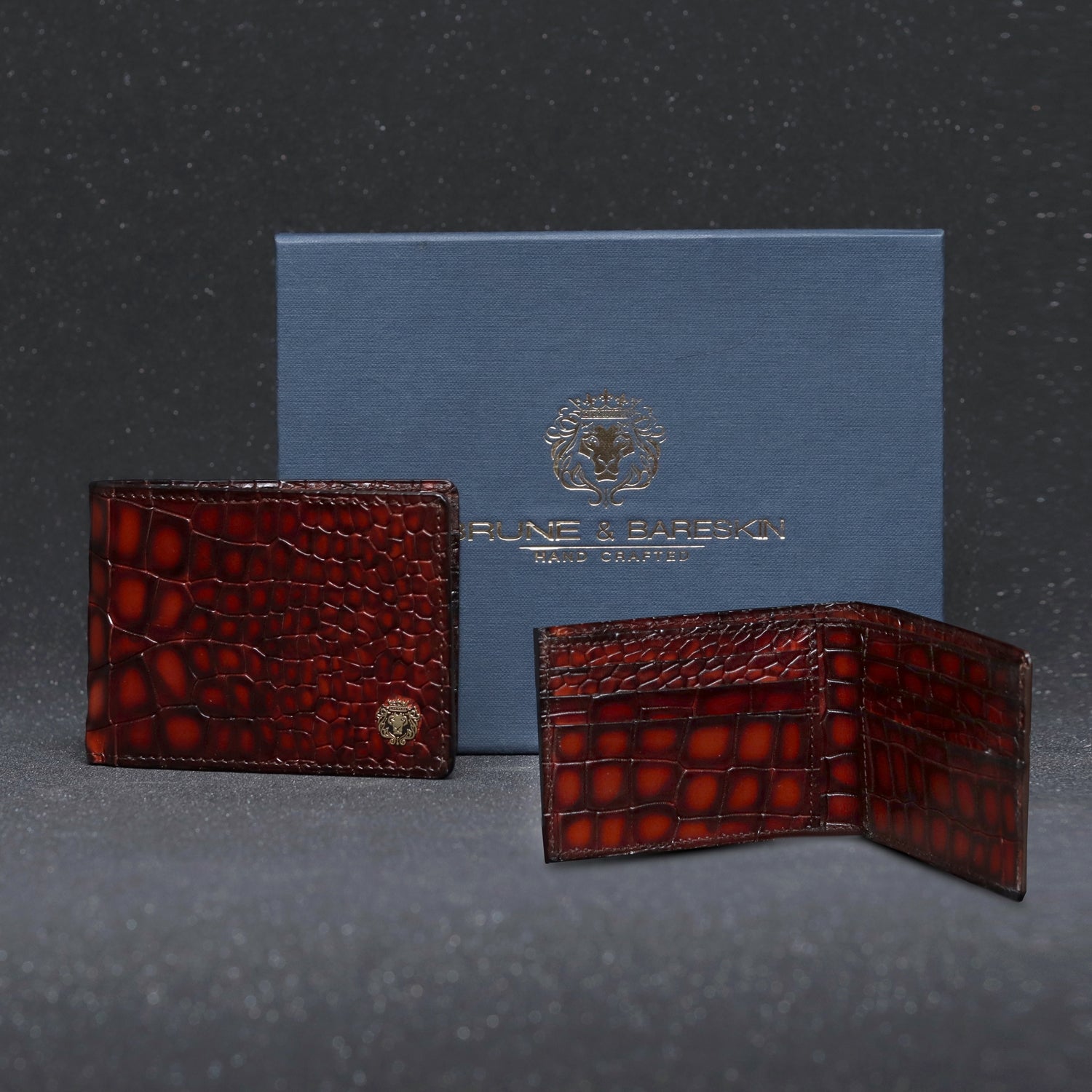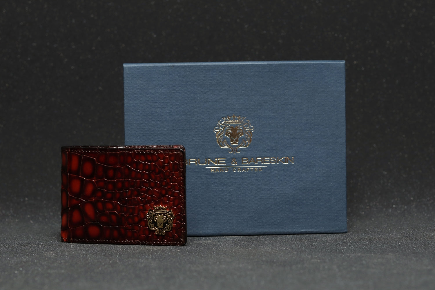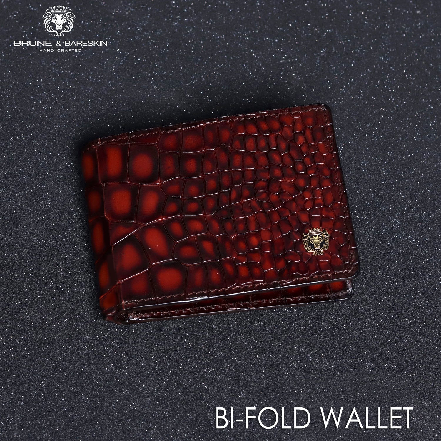 Experience the timeless luxury of this Brune & Bareskin Men's Bi-Fold Wallet. Our Men's Bi-Fold Wallet in Tan Croco Textured Leather is a sophisticated accessory that will instantly elevate your look. The tan color and Croco Textured Leather make this wallet irresistibly stylish, and it's complete with a Smokey finish. The metal lion logo adds a special touch of luxury. This wallet is equipped with 6 card slot and 2 long pockets for cash, making it convenient for everyday use. Perfect as a gift for a special gentleman in your life.